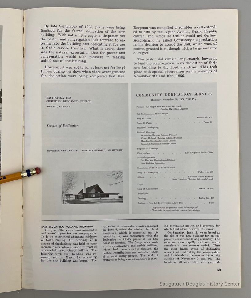 In 1962 the East Saugatuck Mission Board took on as a project a fledging congregation that had been meeting in various places in Saugatuck since 1957. Ten acres of land was purchased on Allegan Street near the Blue Star Highway. The Saugatuck Christian Reformed Church was constructed on the site in 1965.