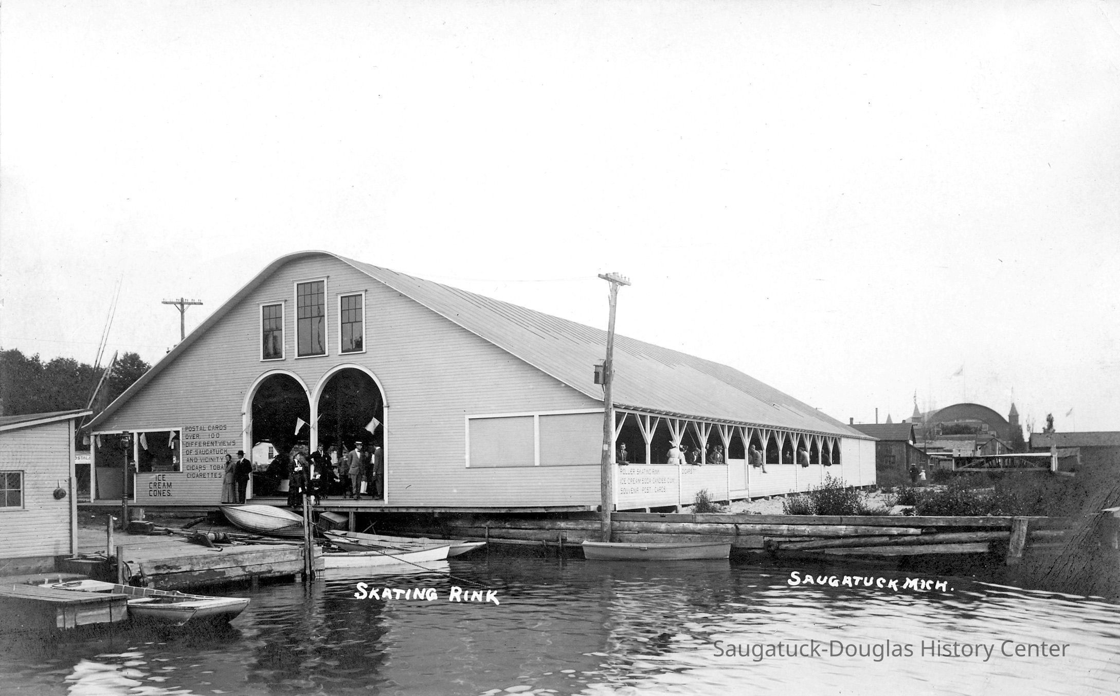Built as a dance hall in 1909 but once superseded by Big Pavilion became a roller skating rink with a soda fountain, then a warehouse for the Goodrich Transit Company cargo. Unheated but possessing a fine wood floor it was the court for the Saugatuck Basketball team in 1924-25 season.