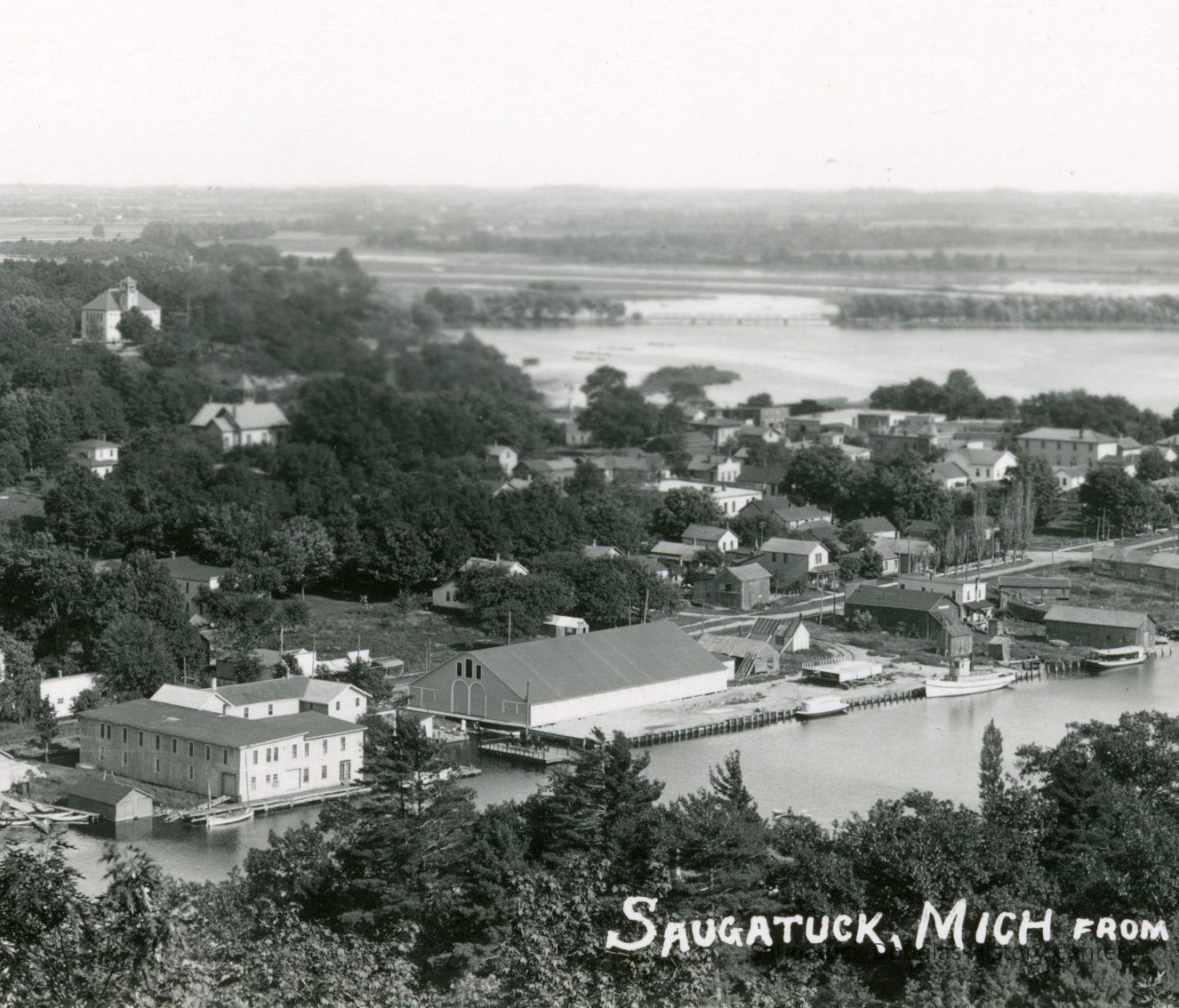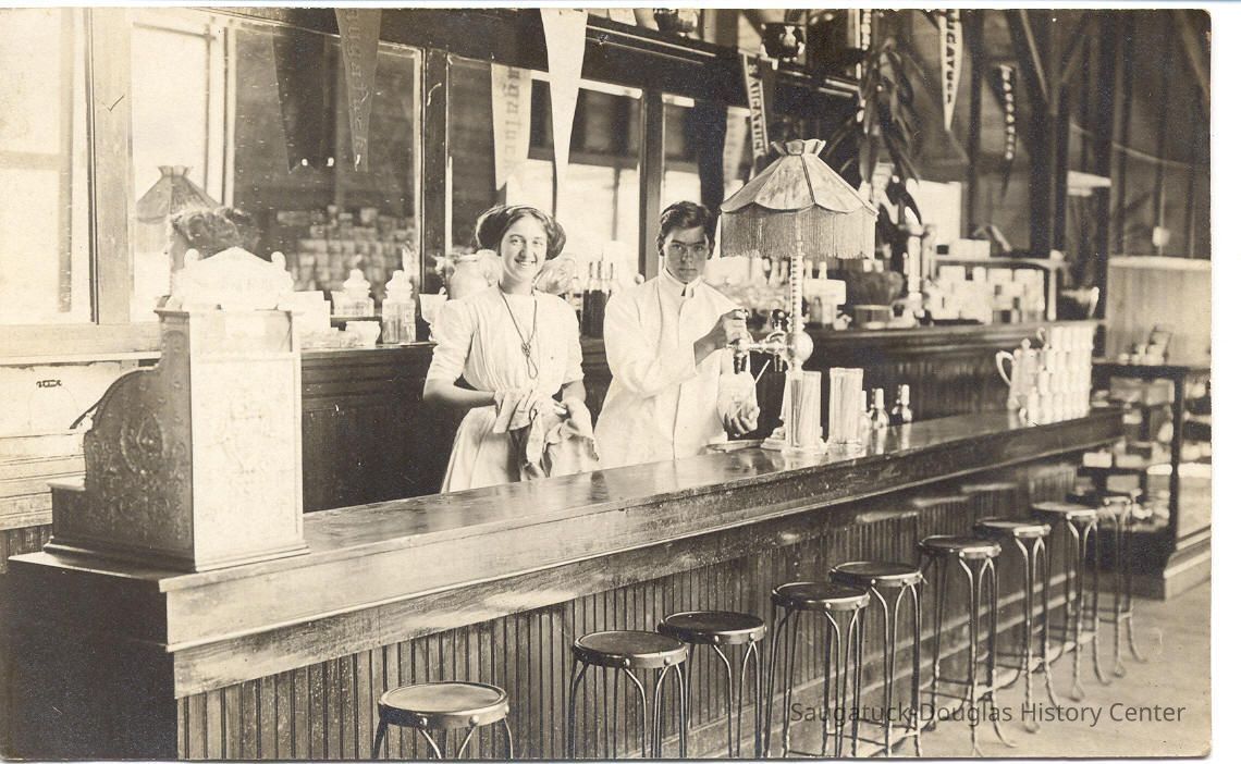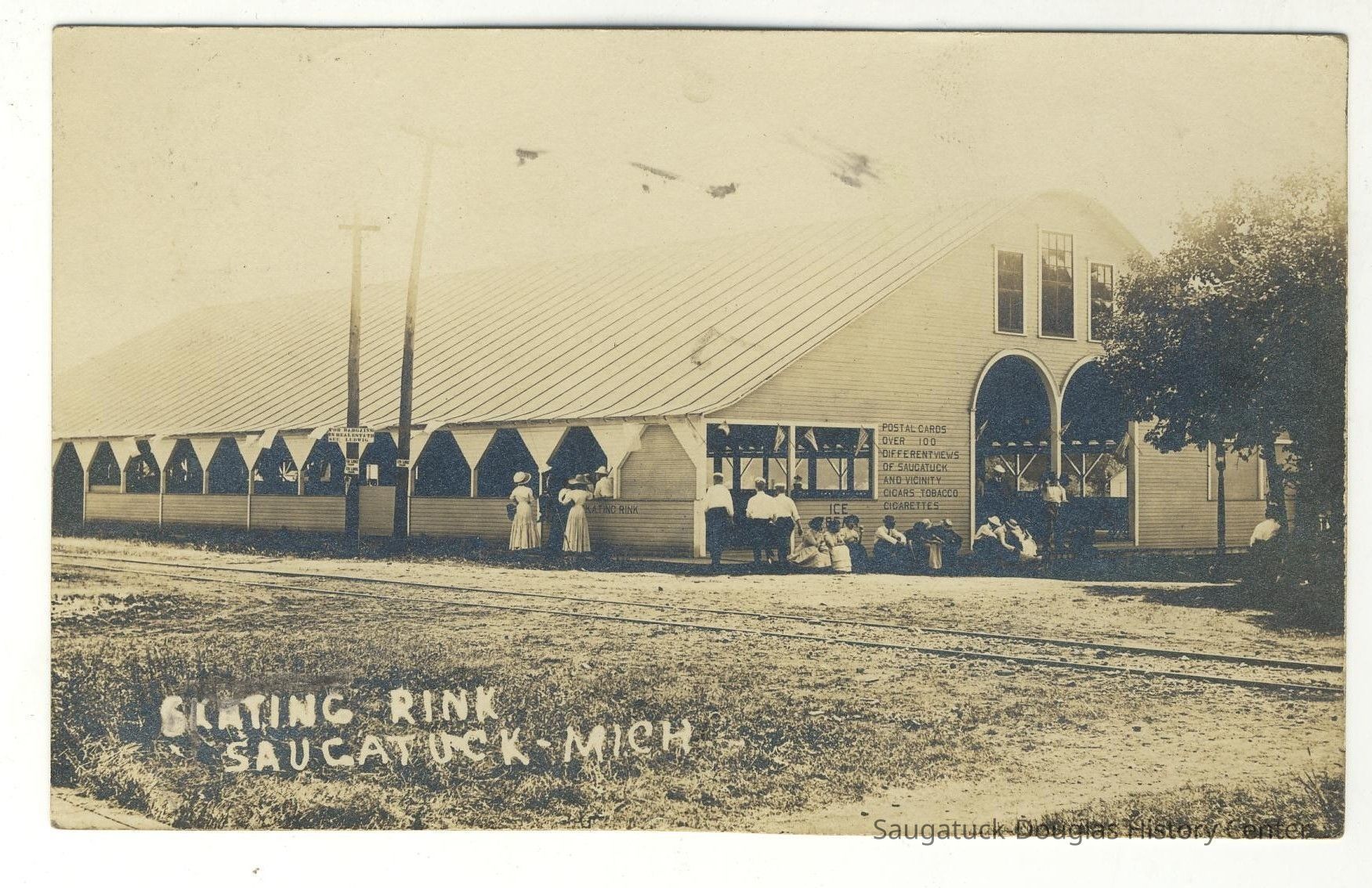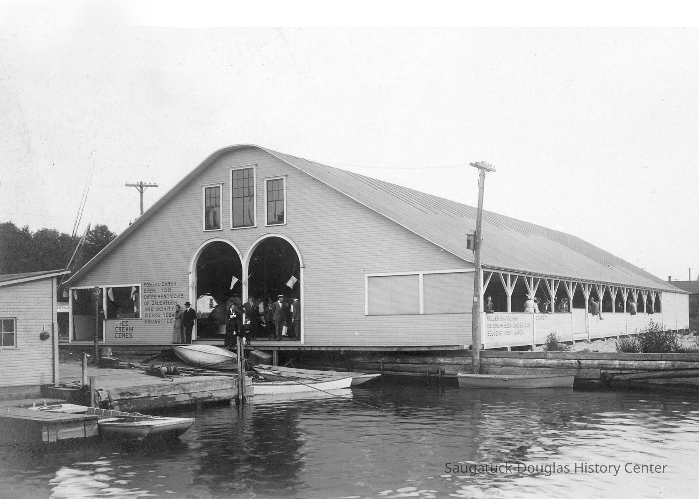 Painted on the building are offers for "Postal cards over 100 different views of Saugatuck and vicinity, cigars, tobacco, cigarettes, and ice cream cones."