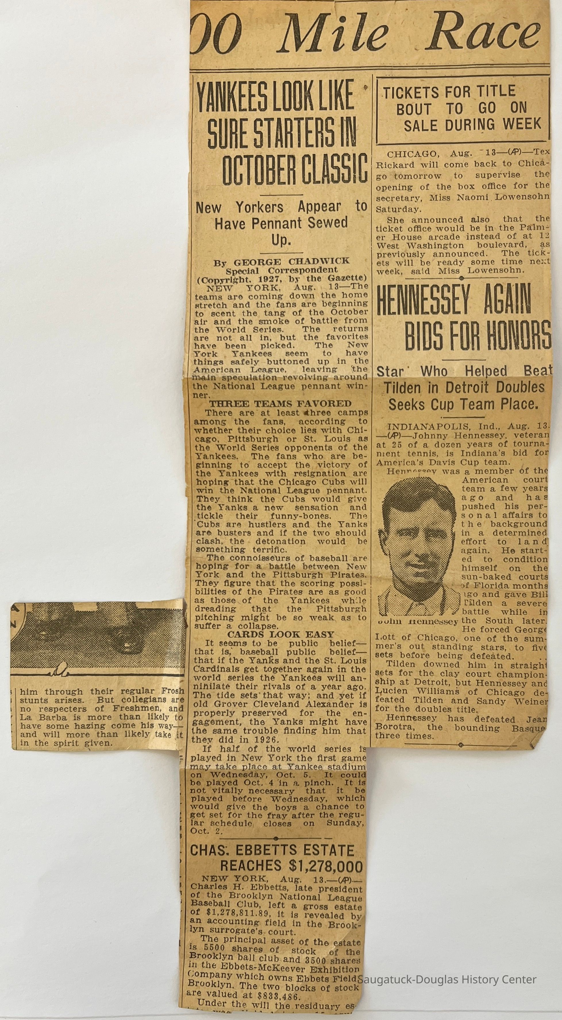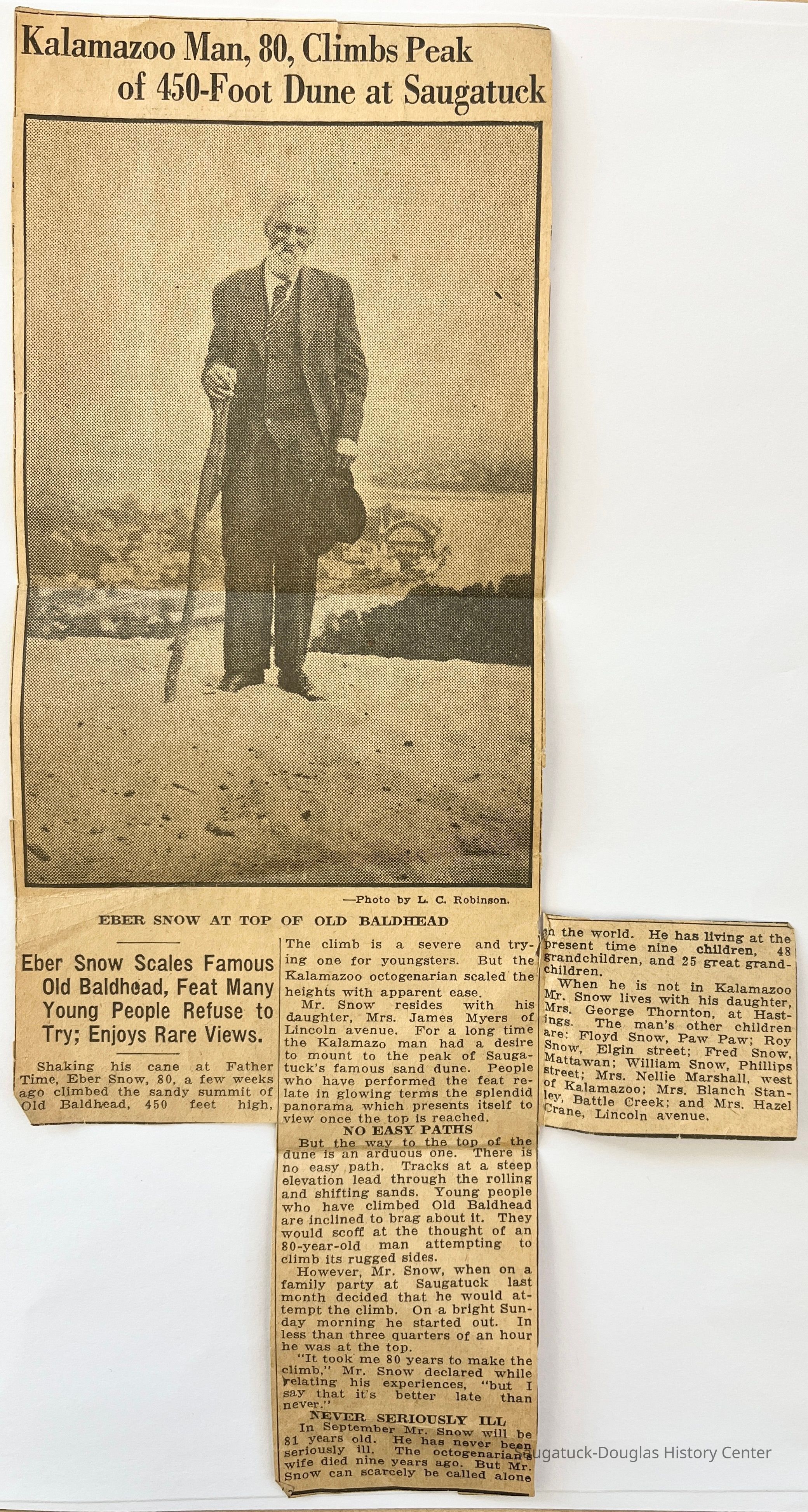 —Photo by L. C. Robinson. EBER SNOW AT TOP OF OLD BALDHEAD Eber Snow Scale Famous Old Baldhead, Feat Many Young People Refuse to Try; Enjoys Rare Views. Shaking his cane at Father Time, Eber Snow, 80, a few weeks ago climbed the sandy summit of Old Baldhead, 450 feet high, The climb is a severe and trying one for youngsters. But the Kalamazoo octogenarian scaled the heights with apparent ease. Mr. Snow resides with his daughter, Mrs. James Myers of Lincoln Avenue. For a long time the Kalamazoo man had a desire to mount to the peak of Saugatuck's famous sand dune. People who have performed the feat relate in glowing terms the splendid panorama which presents itself to view once the top is reached. NO EASY PATHS But the way to the top of the dune is an arduous one. There is no easy path. Tracks at a steep elevation lead through the rolling and shifting sands. Young people who have climbed Old Baldhead are inclined to brag about it. They would scoff at the thought of an 80-year-old man attempting to climb its rugged sides. However, Mr. Snow, when on a family party at Saugatuck last month decided that he would attempt the climb. On a bright Sunday morning he started out. In less than three quarters of an hour he was at the top. "It took me 80 years to make the climb," Mr. Snow declared while relating his experiences, "but I say that it's better late than never." NEVER SERIOUSLY ILL In September Mr. Snow will be 81 years old. He has never been seriously ill. The octogenarian's wife died nine years ago. But Mr. Snow can scarcely be called alone an the world. He has living at the present time nine children, 48 grandchildren, and 25 great grand-children. When he is not in Kalamazoo Mr. Snow lives with his daughter, Mrs. George Thornton, at Hastings. The man's other children are: Floyd Snow, Paw Paw; Roy Snow, Elgin street; Fred Snow, Mattawan; William Snow, Phillips street; Mrs. Nellie Marshall, west of Kalamazoo; Mrs. Blanch Stanley, Battle Creek; and Mrs. Hazel Crane, Lincoln avenue.