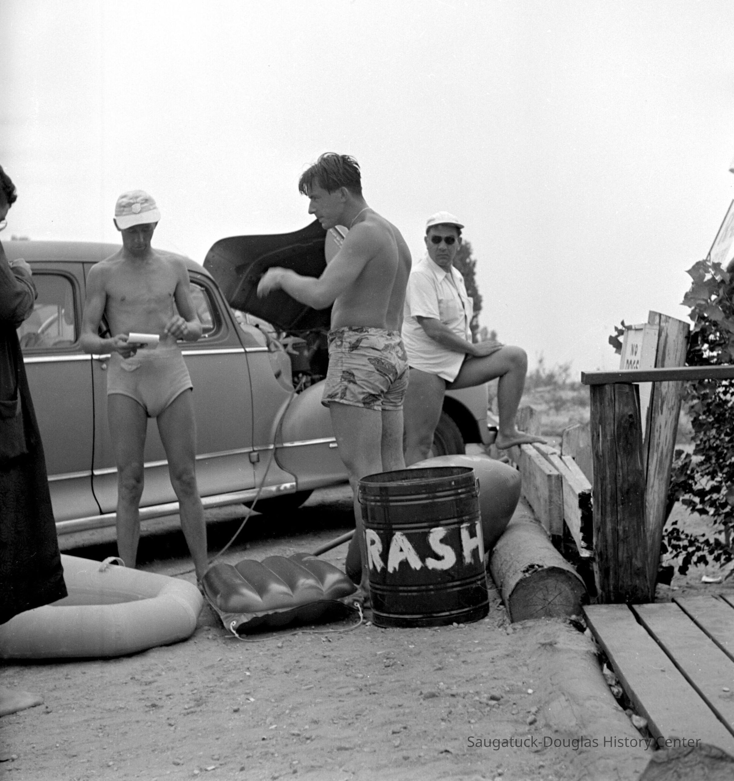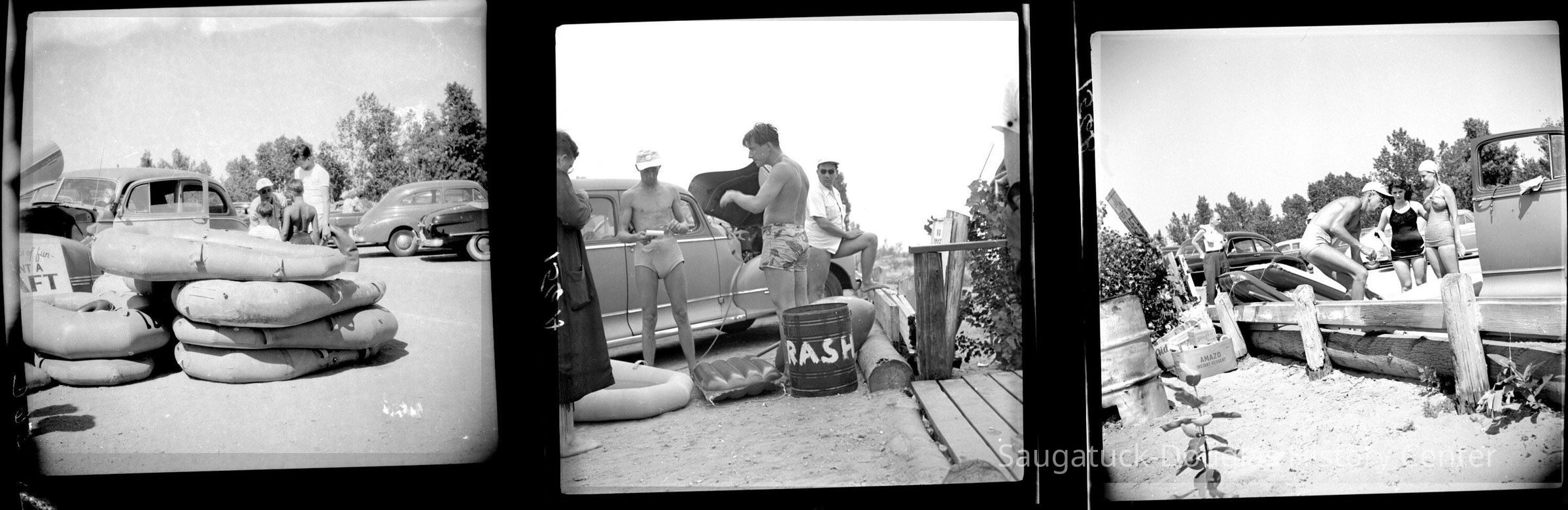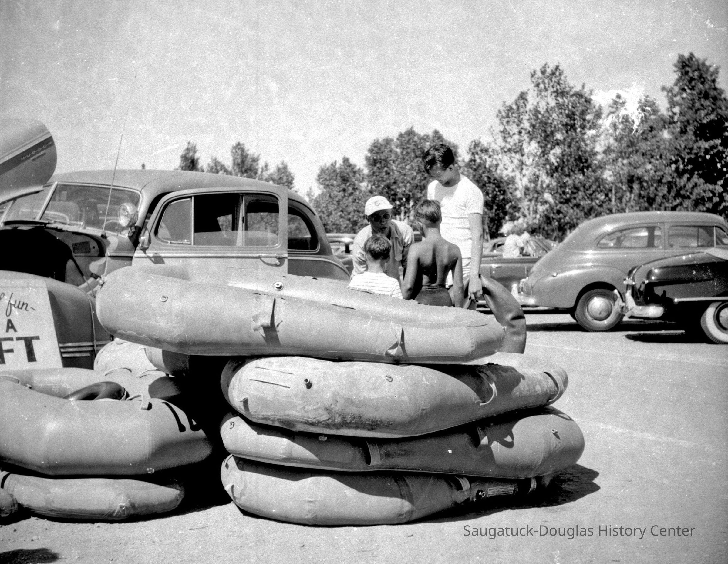 Car with a variety of inflatables boats and mats available for rent at Oval Beach. Edwin J. Bombly listed in 1956 telephone directory.