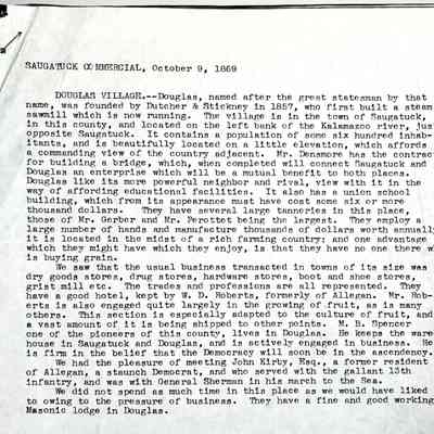 We saw that the usual business transacted in towns of its size was dry goods stores, drug stores, hardware stores, boot and shoe stores, grist mill etc. The trades and professions are all represented. They have a good hotel, kept by W. D. Roberts, formerly of Allegan. Mr. Roberts is also engaged quite largely in the growing of fruit, as is many others. This section is especially adapted to the culture of fruit, and a vast amount of it is being shipped to other points. M. B. Spencer one of the pioneers of this county, lives in Douglas. He keeps the warehouse in Saugatuck and Douglas, and is actively engaged in business. He is firm in the belief that the Democracy will soon be in the ascendency.