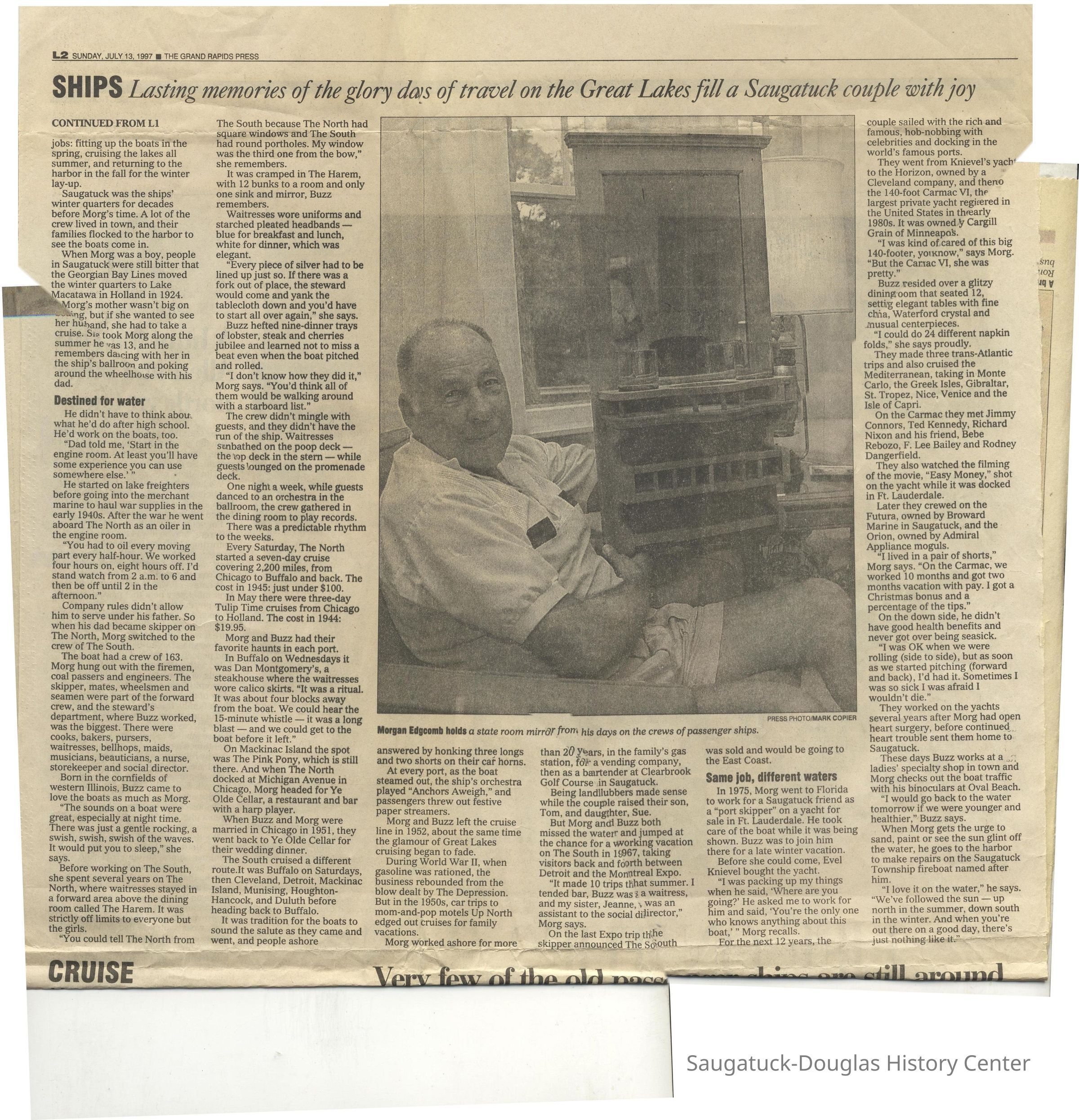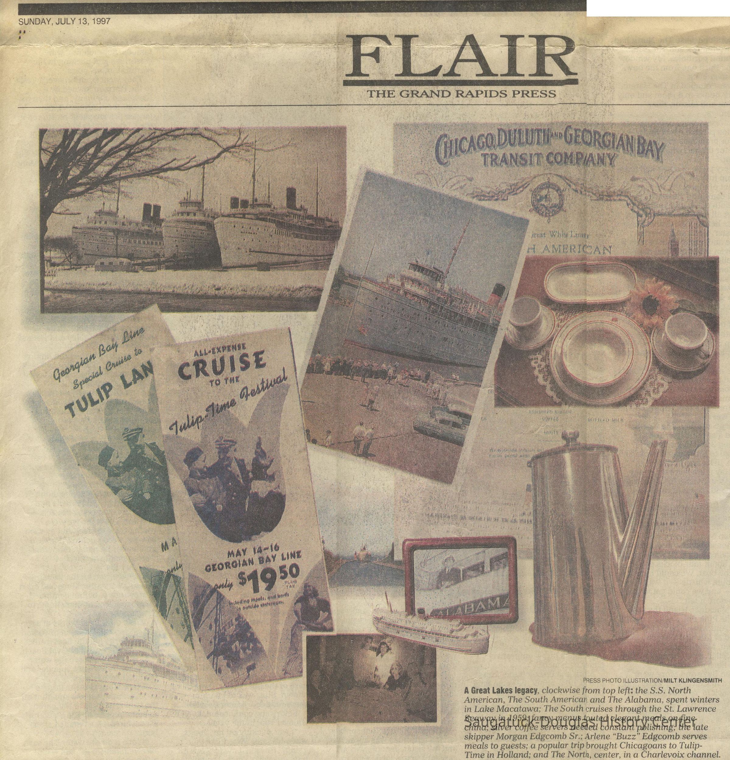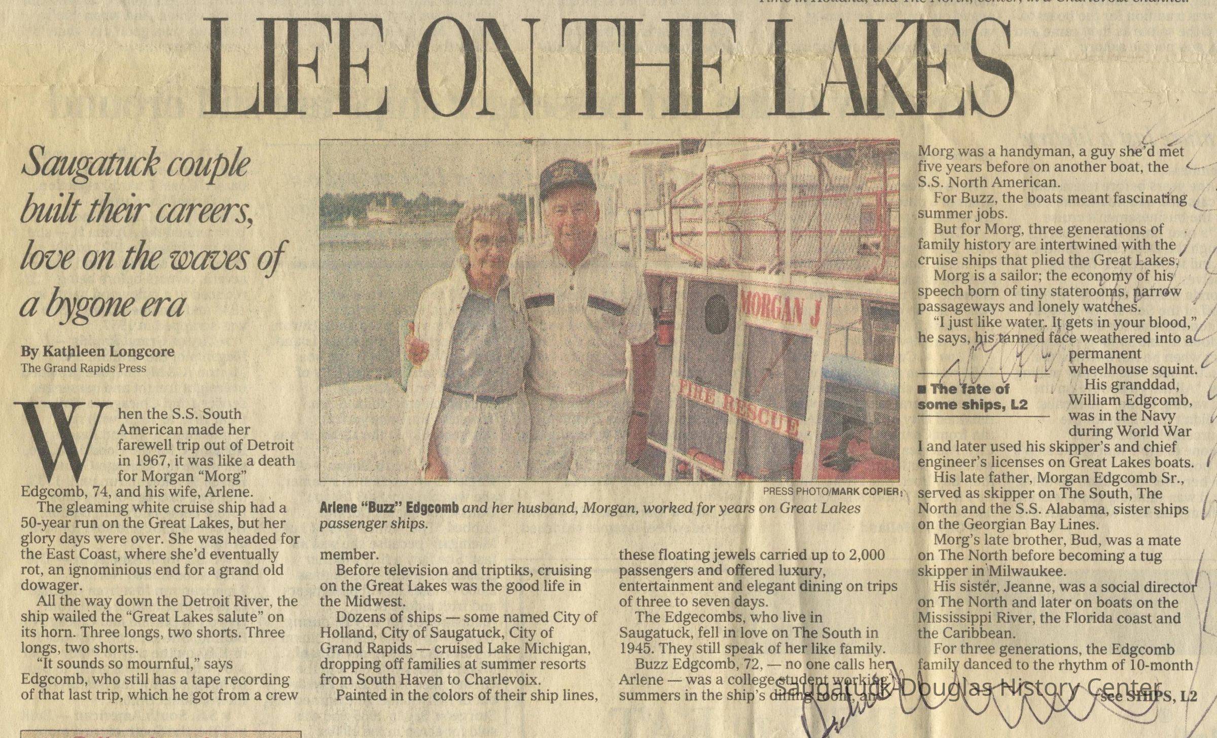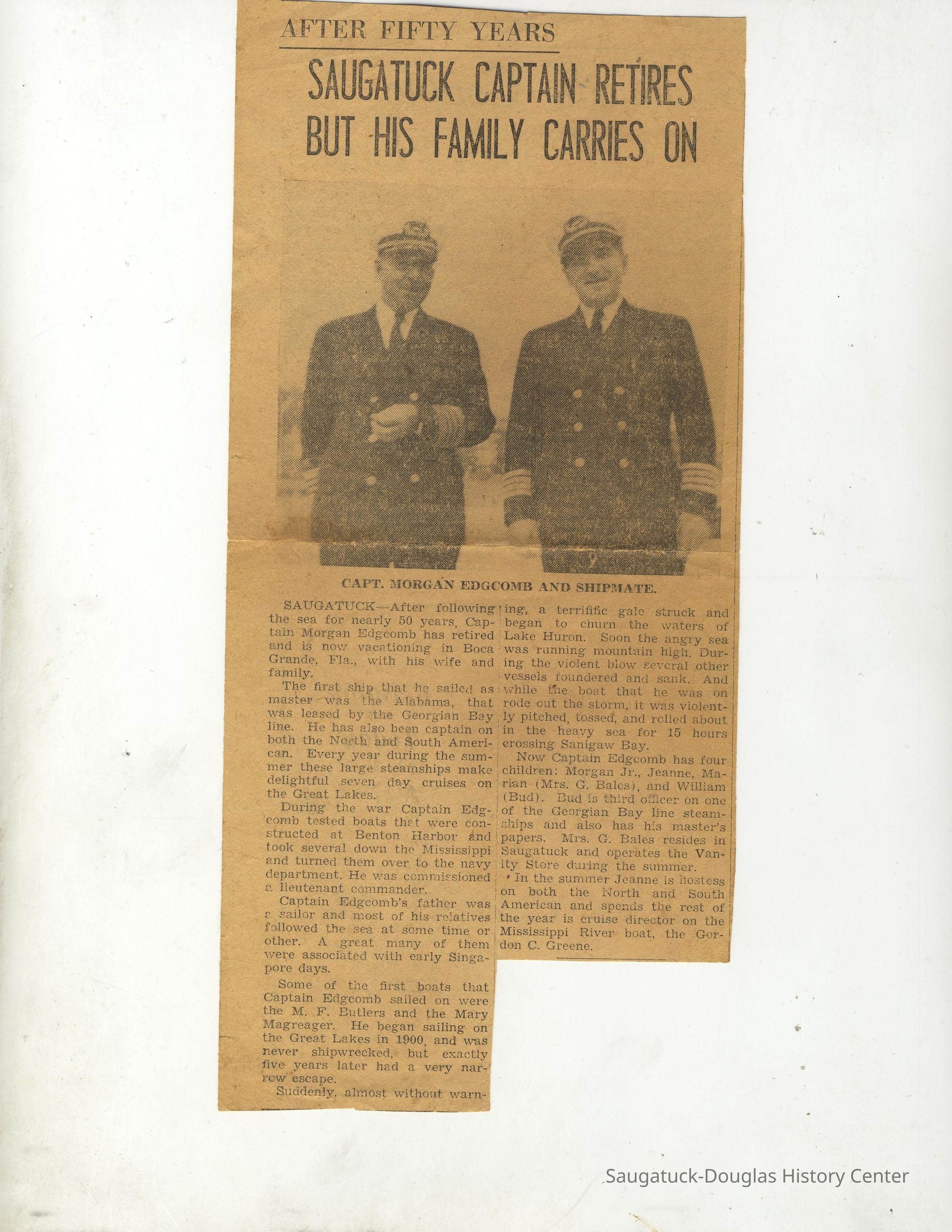 Edgcomb, Bessie Mae (Smalley) 1885-1975, Edgcomb, Morgan Sr. 1877-1964, Alabama (ship) 1909-2006, Edgcomb, Morgan J. Jr. 1923-2004, Edgcomb, Jeanne, Edgcomb, Ruth M. (Severance) 1915-1997, 415 Lake/Wright's Pavilion, Bale, Marian (Edgcomb) 1908-1988, Edgcomb, William Burdette "Bud" 1913-1980, Edgcomb, Nellie 1870-1890, Edgcomb, Charles Hackley 1875-1933, Edgcomb, William G. "Cap" 1842-1929, Edgcomb, William Henry 1873-1961, South American (ship), North American (ship), 332 Mason/Edgcomb house, Morgan J (boat), 133 Butler/Alle Rue/Casual Man/London Shop/Goodrich Boarding house, Chicago, Duluth and Georgian Bay Transit Company, Laviollette, Jean, Sewers, Jean c1916-?
