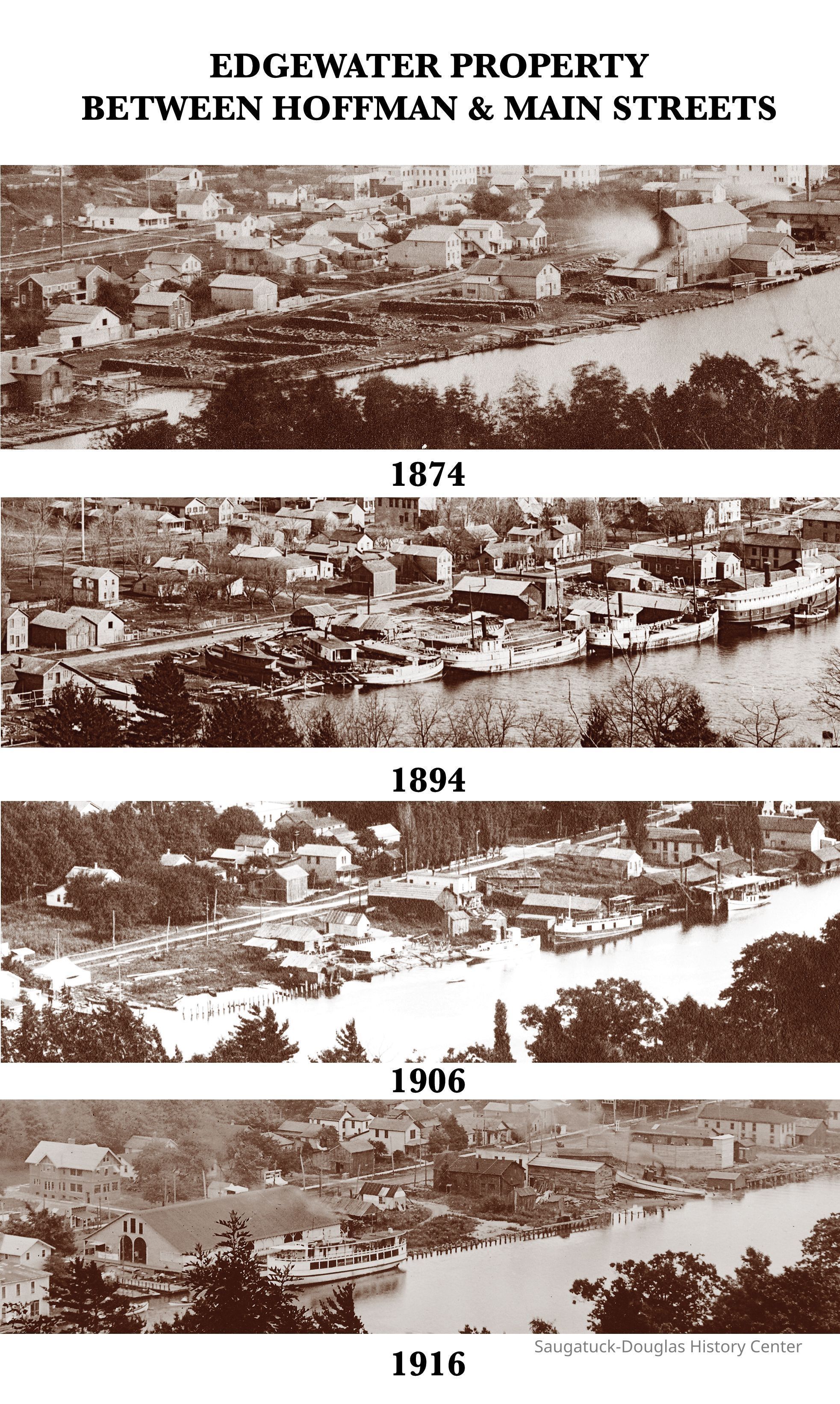 Compilation of views from Mount Baldhead of the Edgewater property from 1874 to 1916. The property is between the Kalamazoo River and Water Street, from Hoffman (to the south) and Main (to the north). This digital image was created by James T. Faasen in August, 2025.Photograph Details