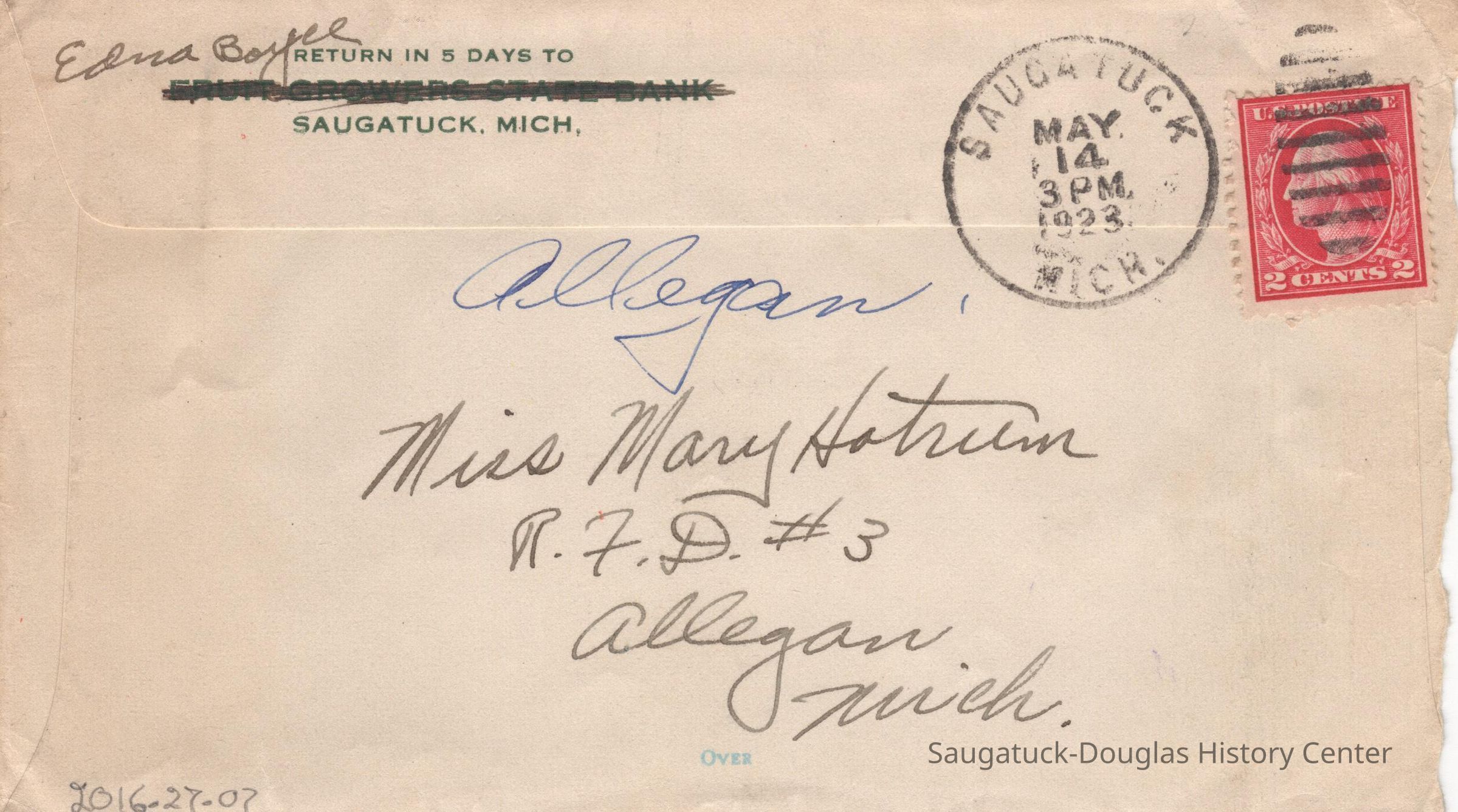 Sometimes a simple letter can give a wonderful slice of an era. This short letter dated May 13, 1923, was brought to the museum recently by Mike and Marcia Raleigh of Indianapolis, Indiana, who picked it up in a Cincinnati, Ohio, antique store. The envelope bore the return address of the Fruit Growers State Bank and had a color picture that covered the entire non-address side showing a view of the town from Baldhead with the Georgian Bay boats North American and South American tied up near the Big Pavilion. The recipient was Miss Mary Hotrum of Allegan and the writer was Edna Boyce whose career at the bank, later Citizens Bank and Trust, still later Shoreline Bank, spanned more than 50 years.