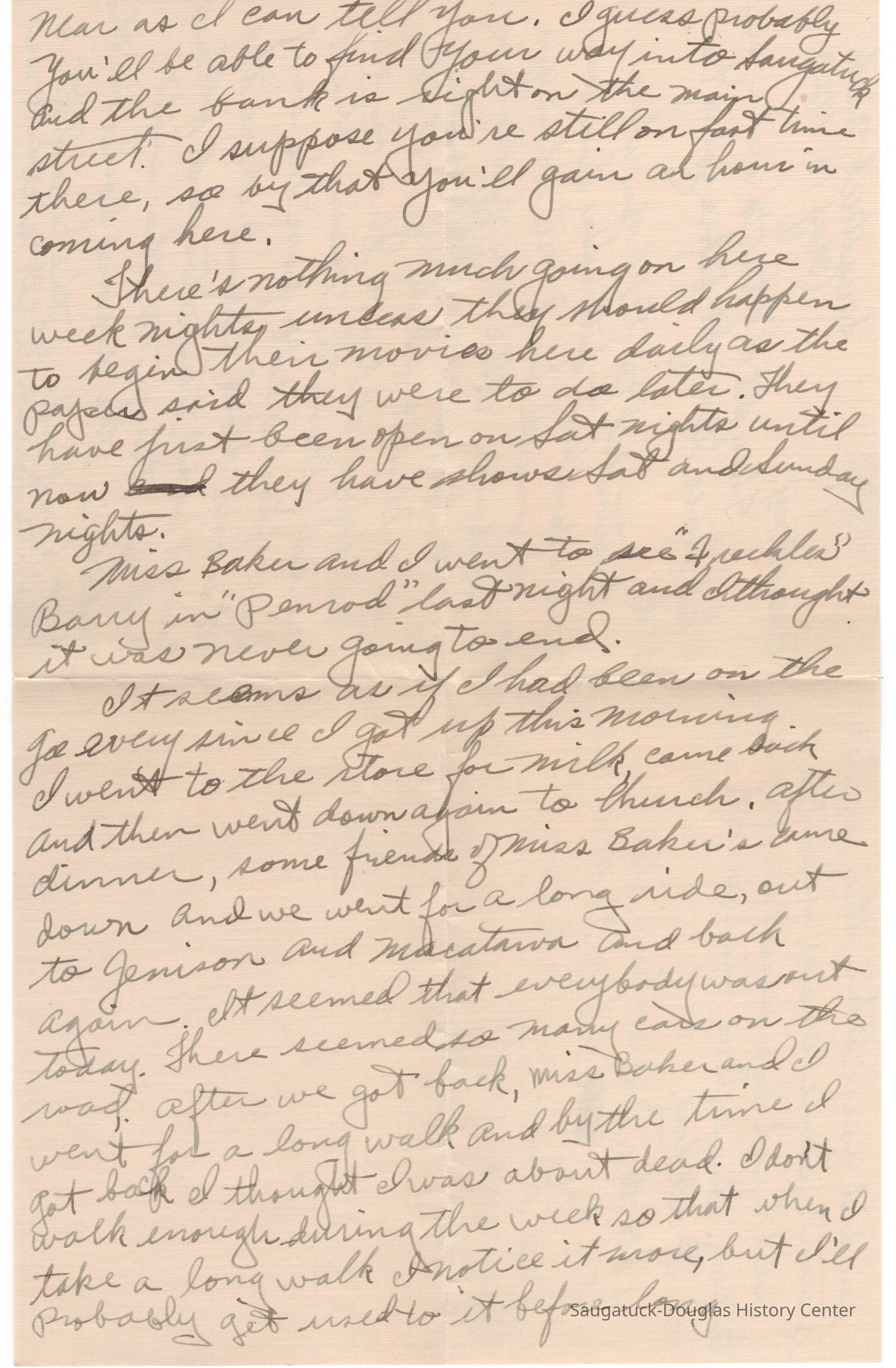 I intended to tell you when I saw you last Saturday how you folks would find me when you came down. I'd be very glad to have you come down next week Thursday night. It isn't likely you'll get here before I leave the bank and so follow the main street five blocks out from the bank. It's one block beyond where the paved road turns toward Holland and you turn to the right and it is the second house on the left hand side of the road. It is a white house. That's about as near as I can tell you. I guess probably you'll be able to find your way into Saugatuck and the bank is right on the main street. I suppose you're still on fast time there, so by that you'll gain an hour in coming here.