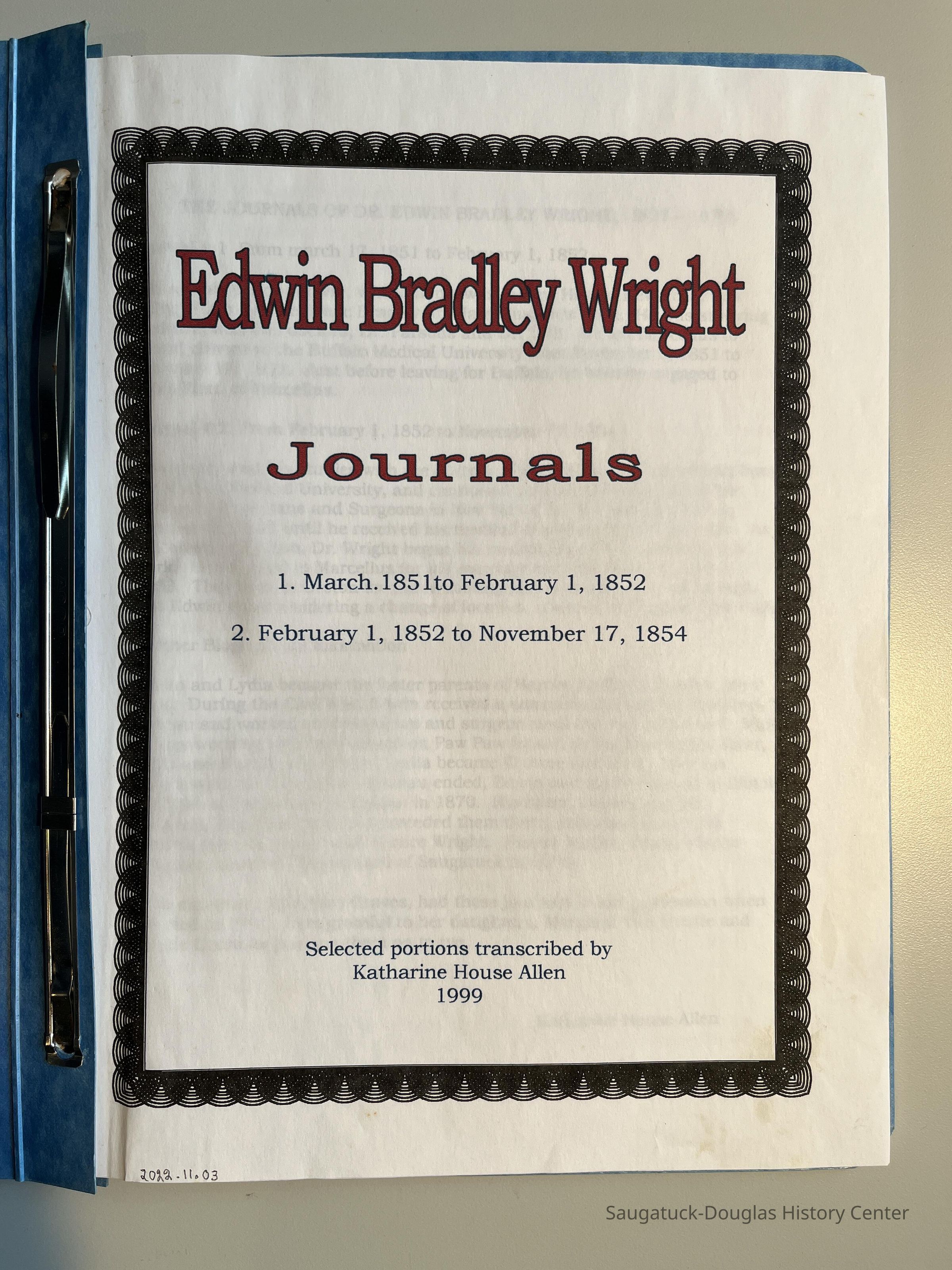 All of the journal entries are from 1851-1854, before Dr. Wright came to Saugatuck, but are a harrowing about of life then.Cataloged By