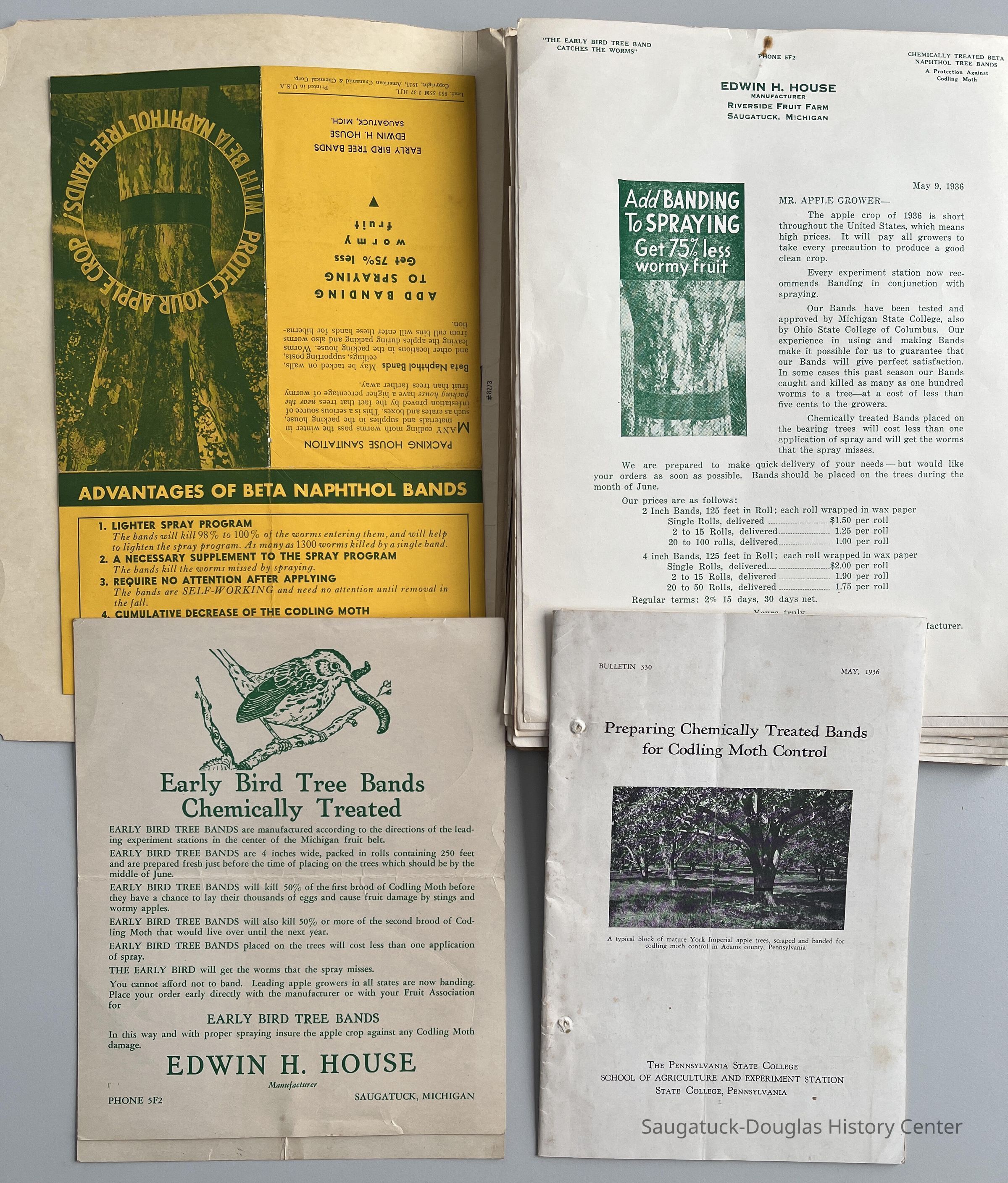 Folder of correspondence, reports and brochures regarding Edwin H. House's "Early Bird" tree bands to protect fruit crops from Codling Moths.