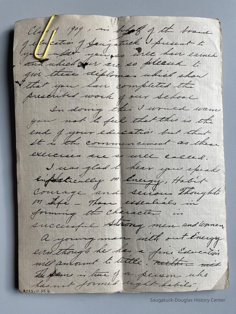 d. draft of speech to the Allegan County Teachers on the importance of education