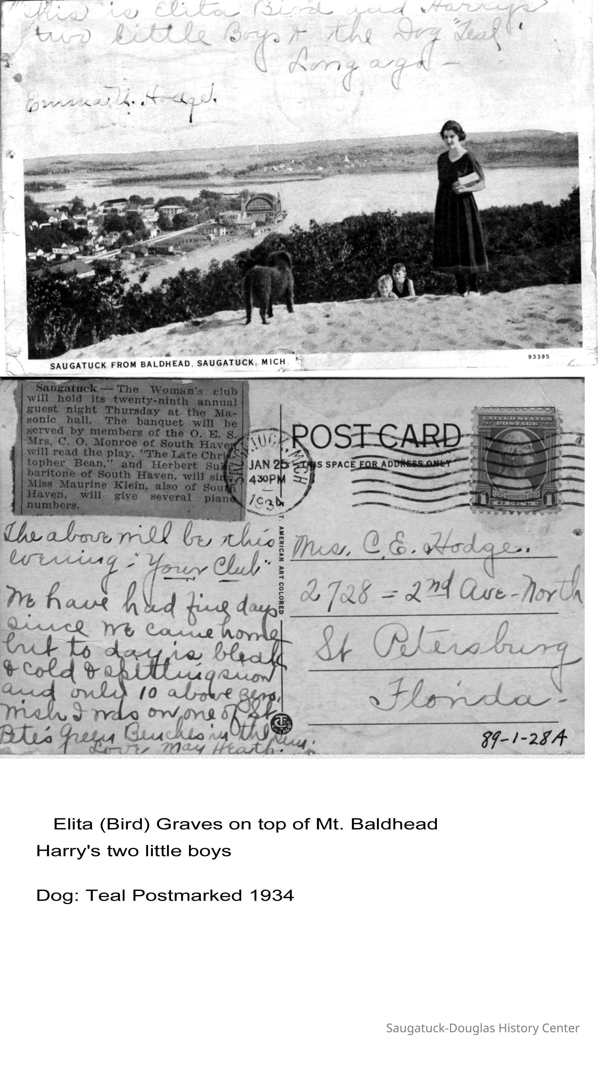 Postcard postmarked Jan. 1934 with text written on the front "This is Elita Bird and Harry's two little boys and the dog "Teal" Long Ago. Emma U? Hodge