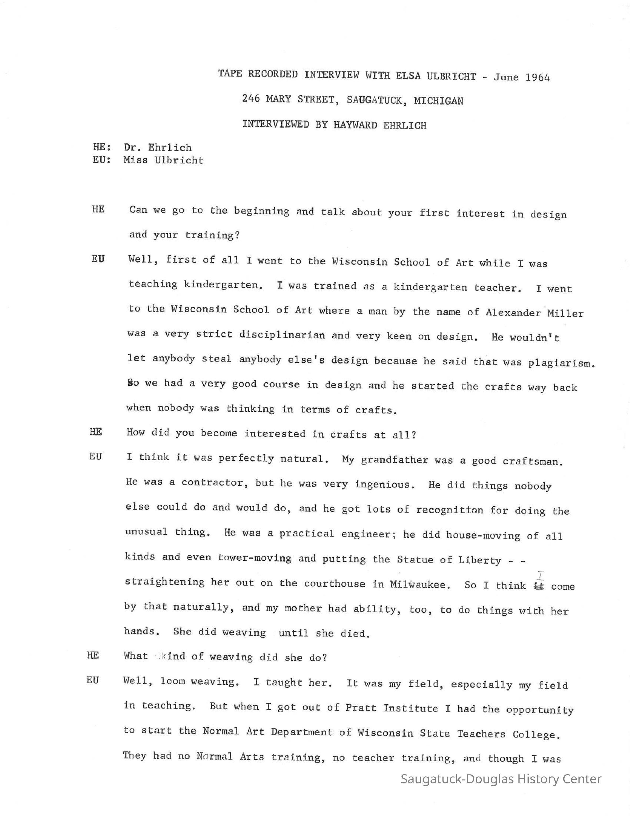 1. Transcript of tape-recorded Elsa Ulbricht interview, June 1964, at 246 Mary Street, Saugatuck by Hayward Ehrlich.