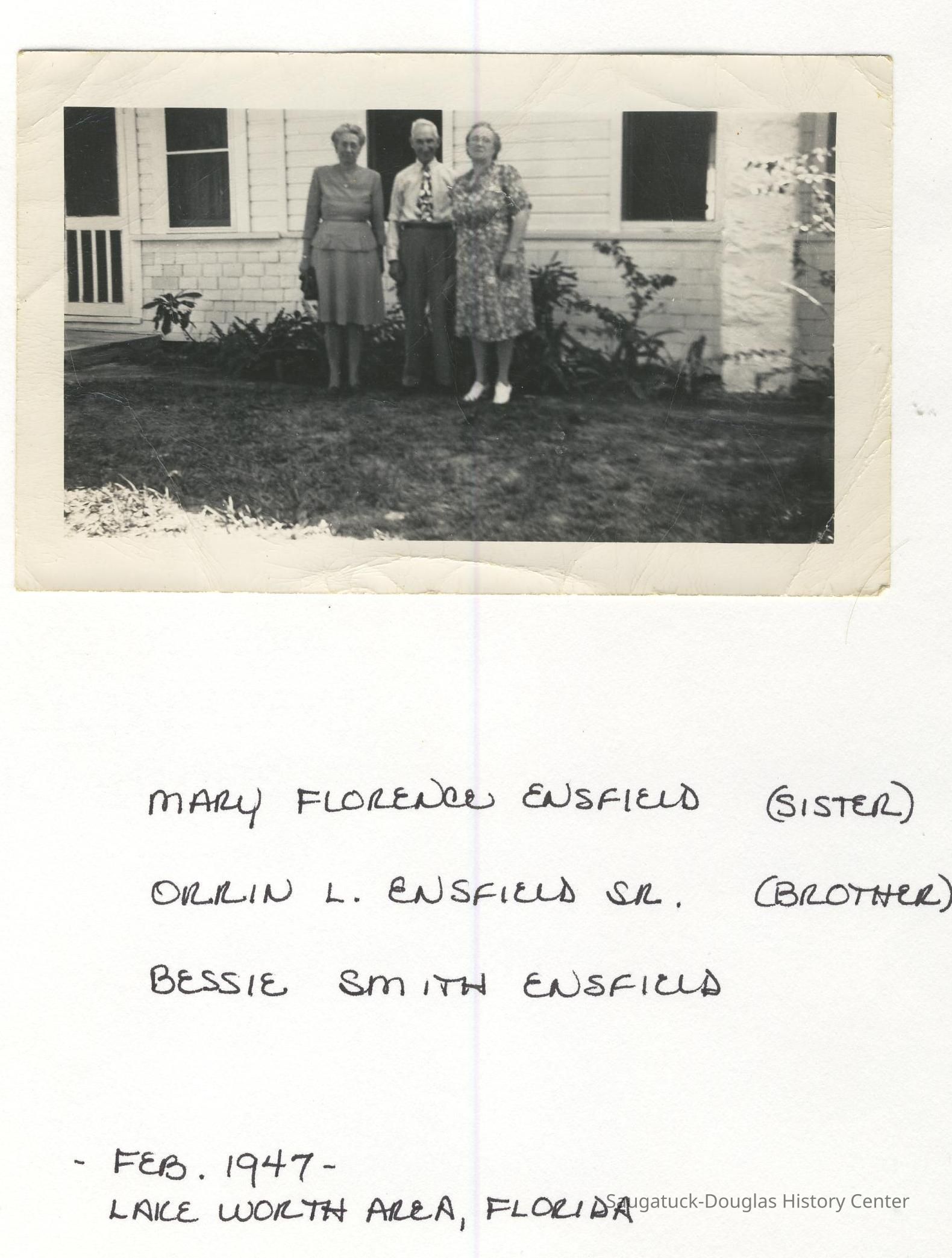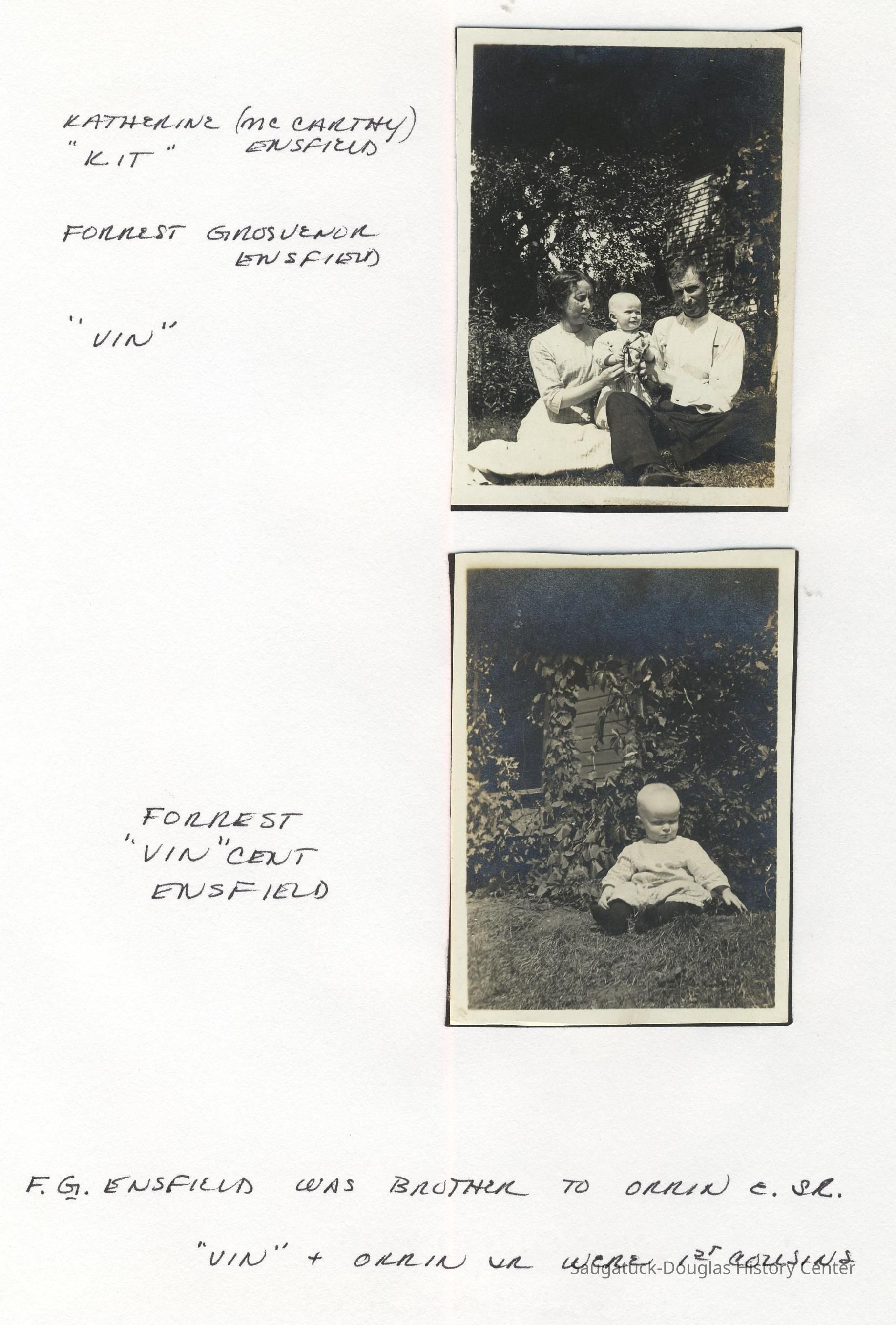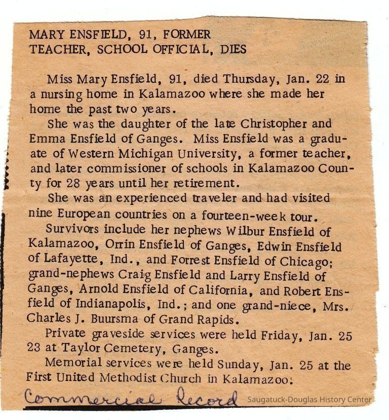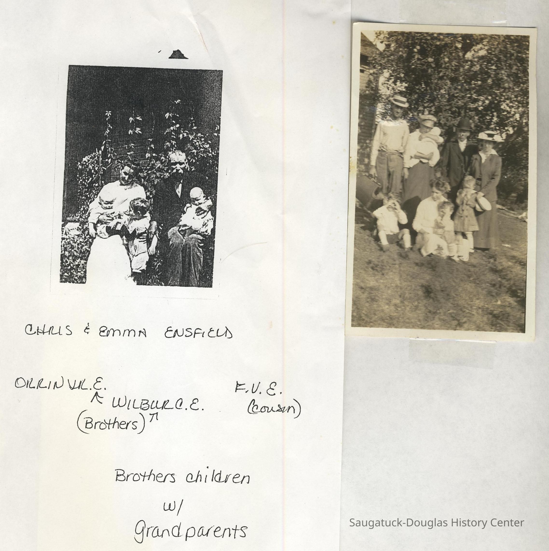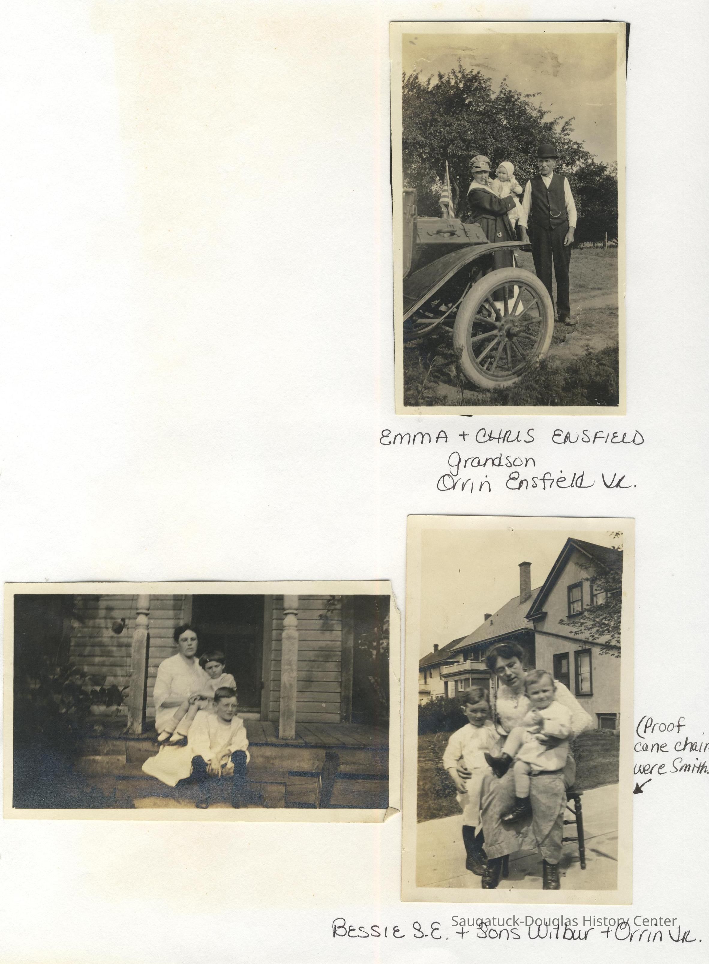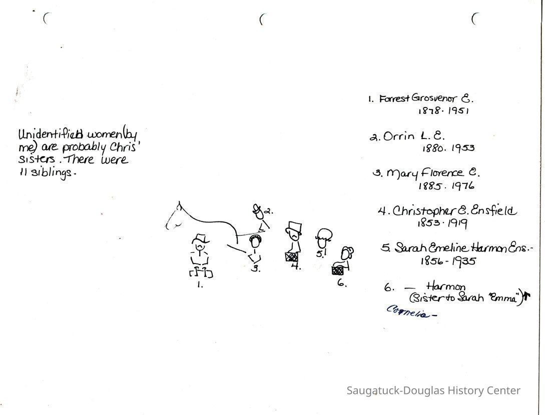 Ensfield and Grosvenor family research information including scans of photos, obituaries and funeral programs collected by Chris Yoder. Many of the subject people have Fennville and Ganges farming connections.