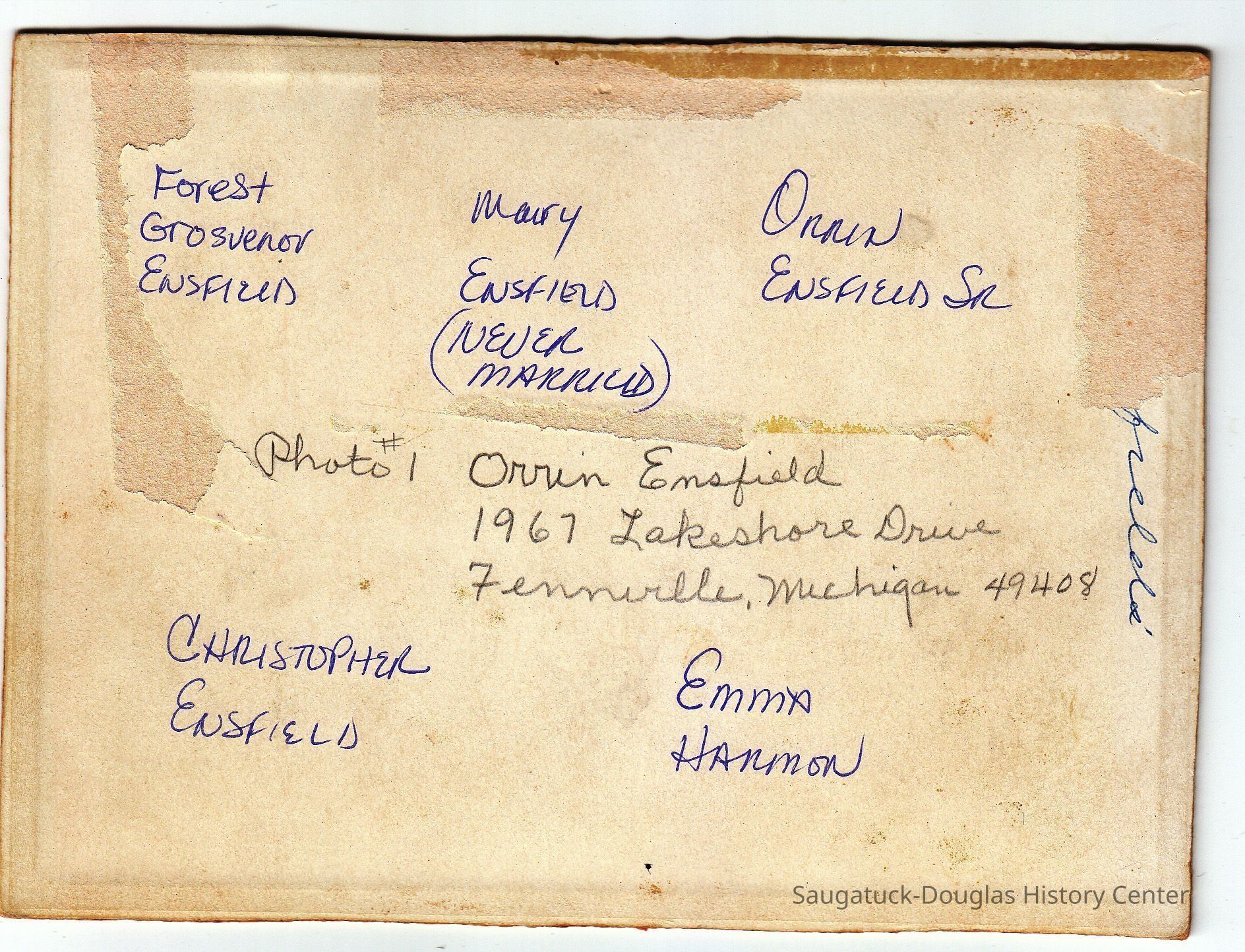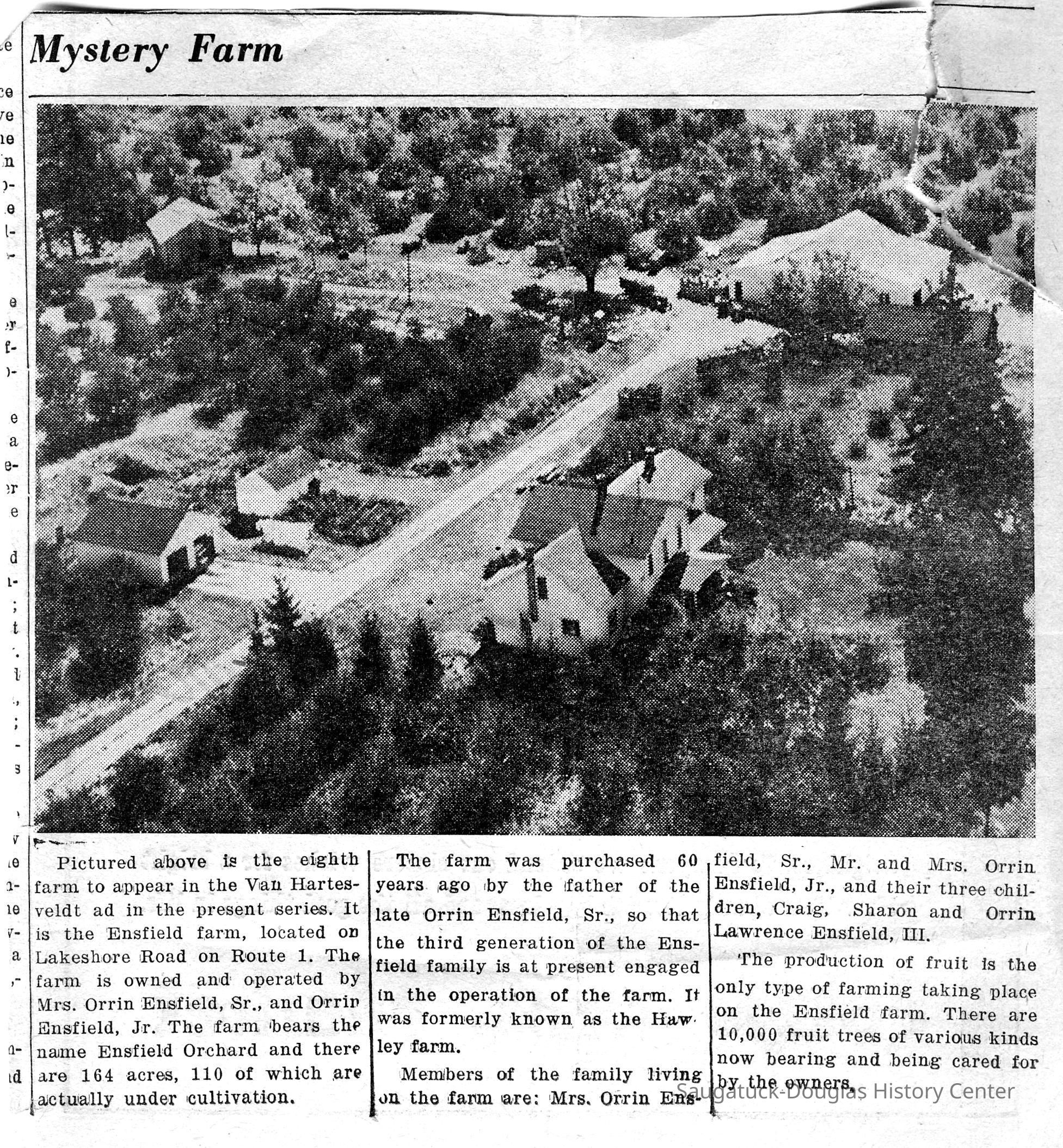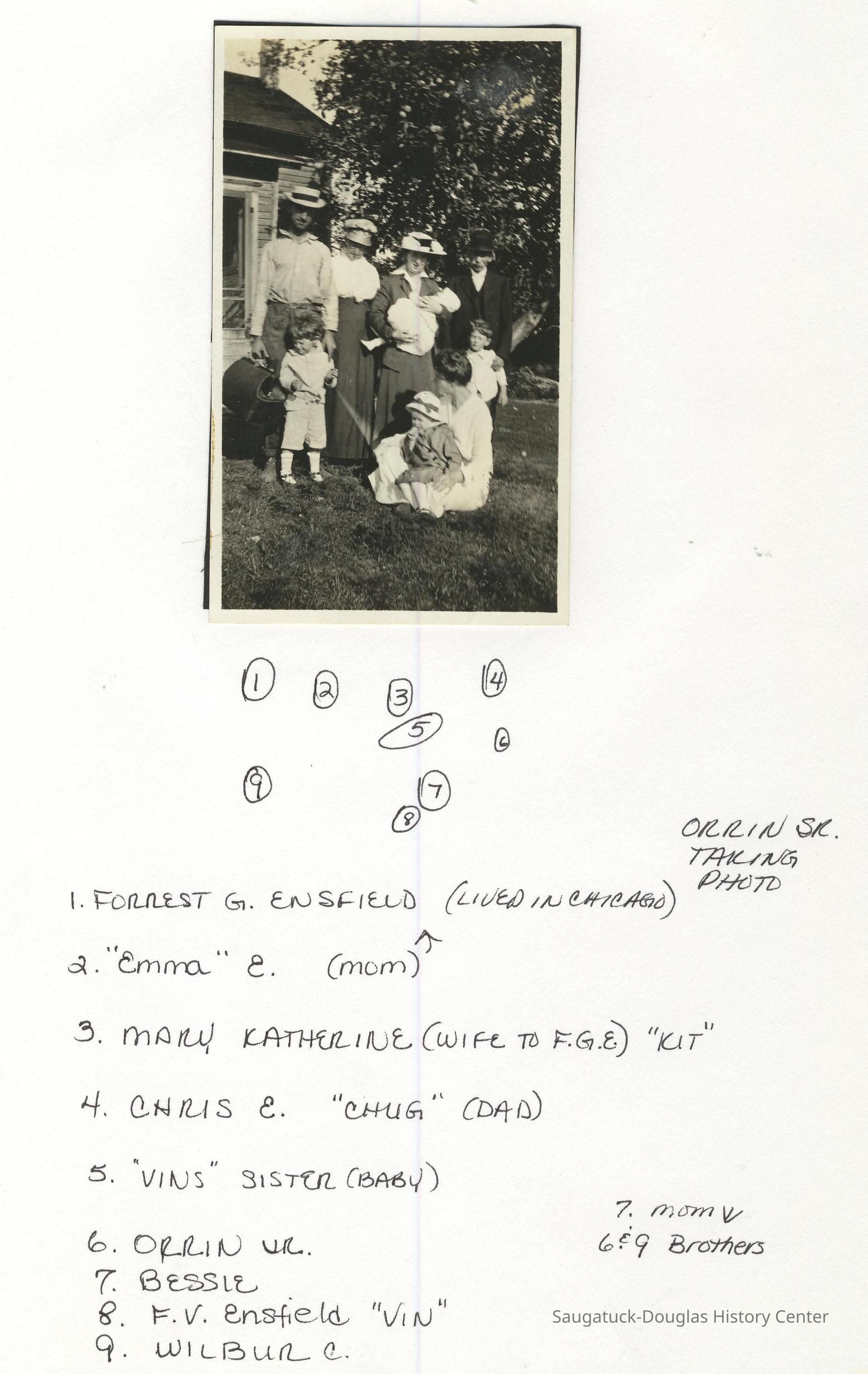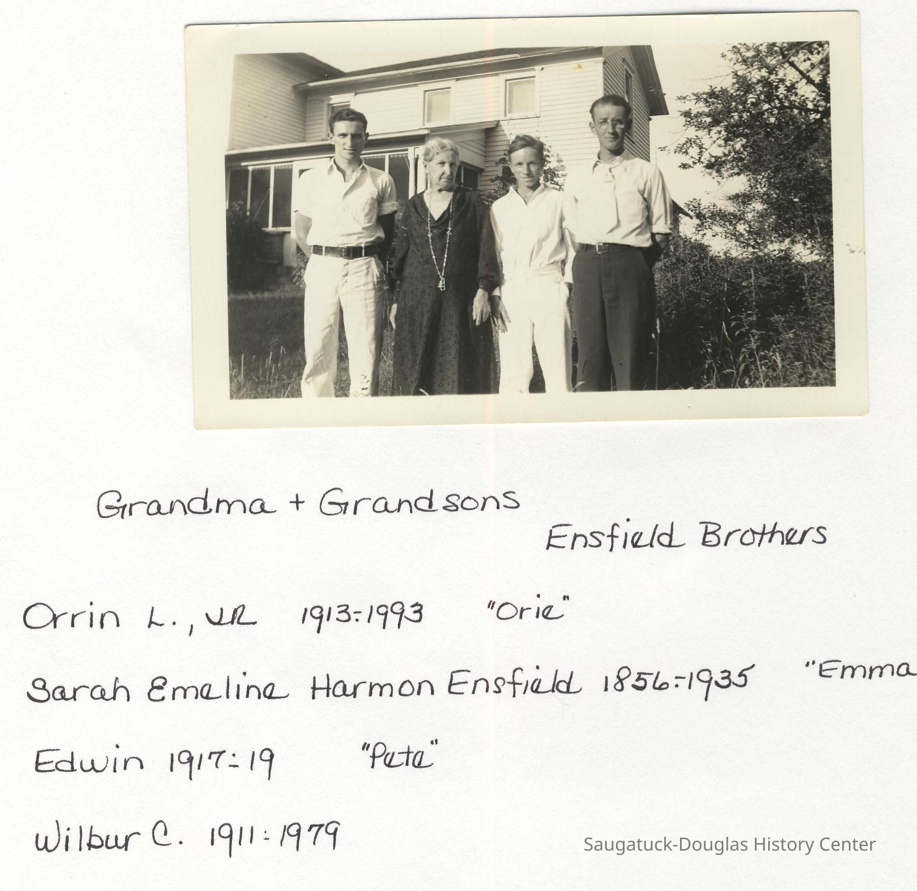Ensfield and Grosvenor family research information including scans of photos, obituaries and funeral programs collected by Chris Yoder. Many of the subject people have Fennville and Ganges farming connections.
