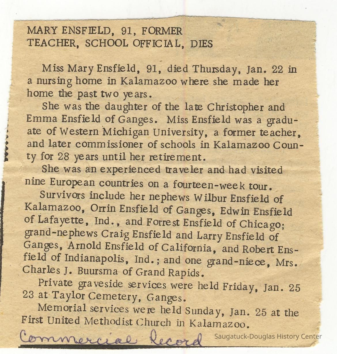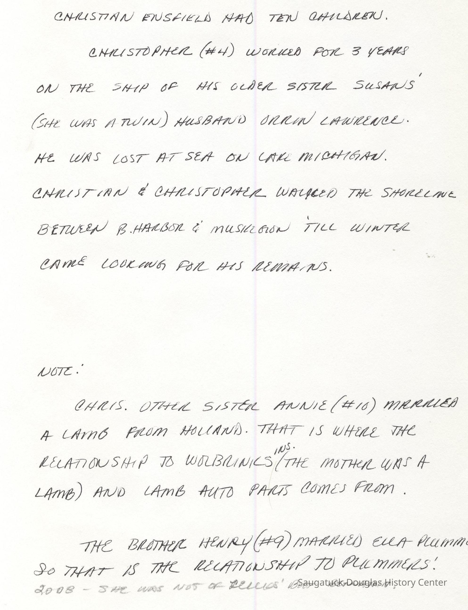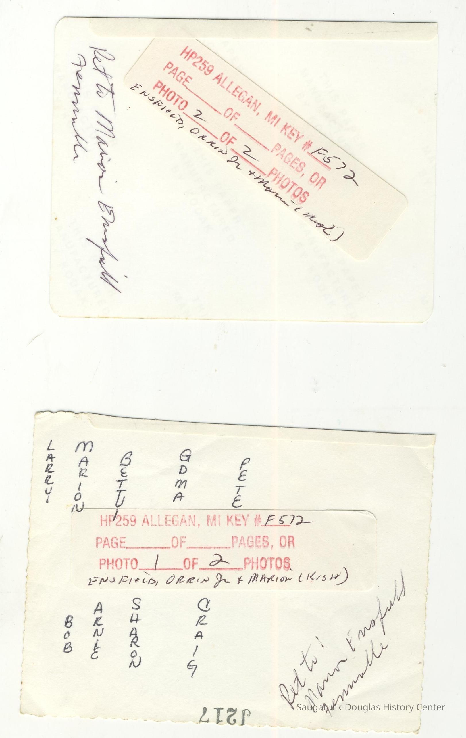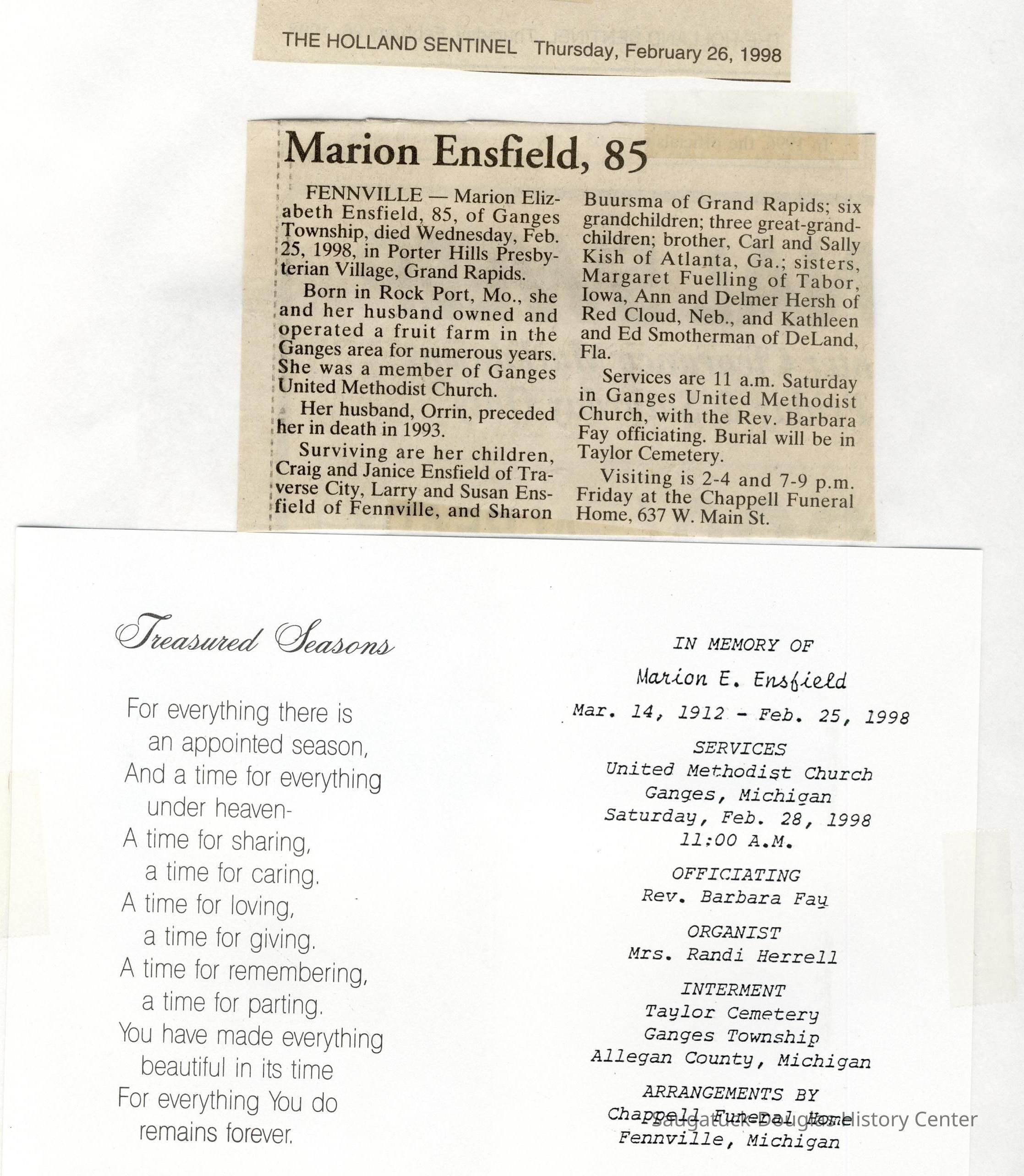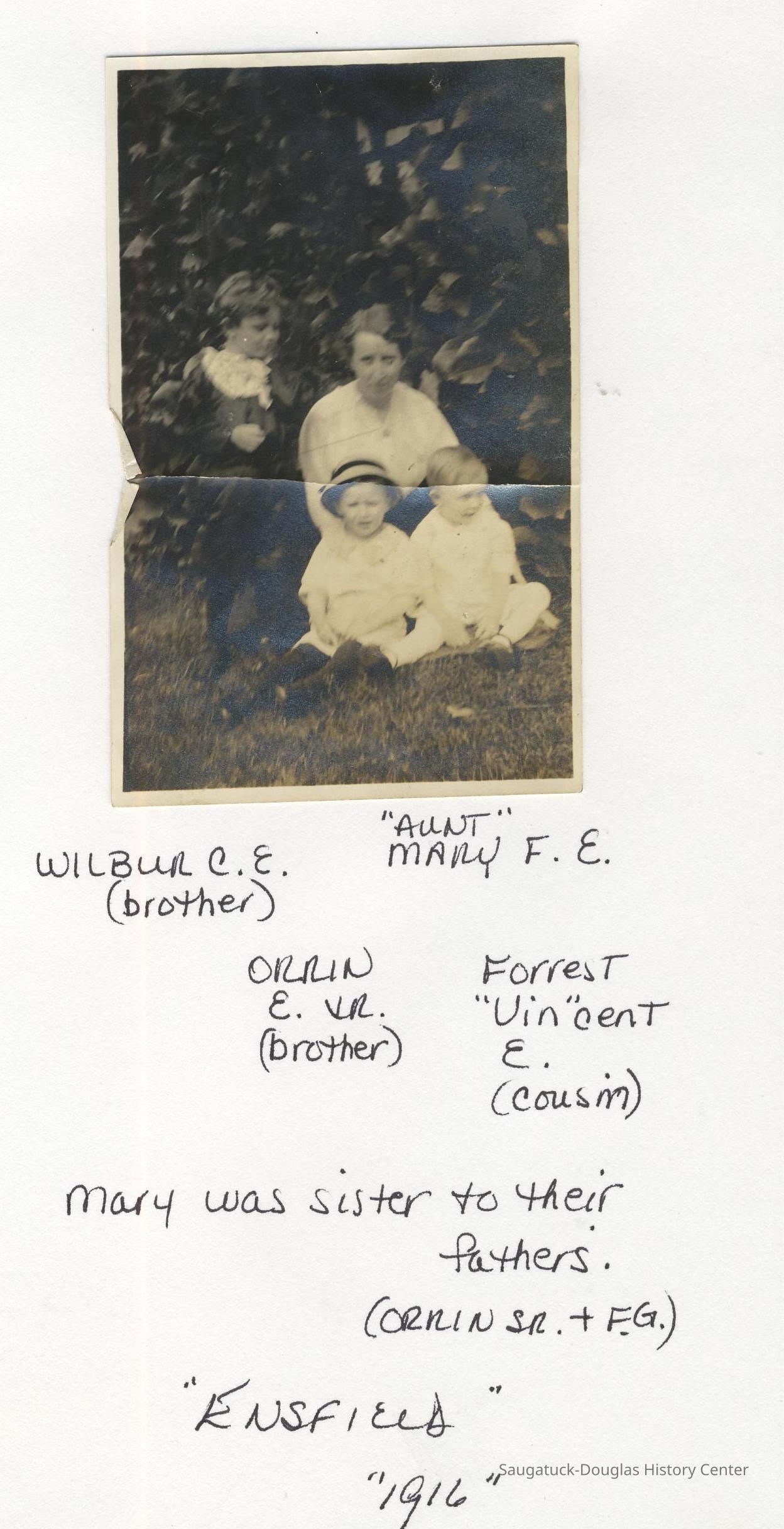 Ensfield and Grosvenor family research information including scans of photos, obituaries and funeral programs collected by Chris Yoder. Many of the subject people have Fennville and Ganges farming connections.