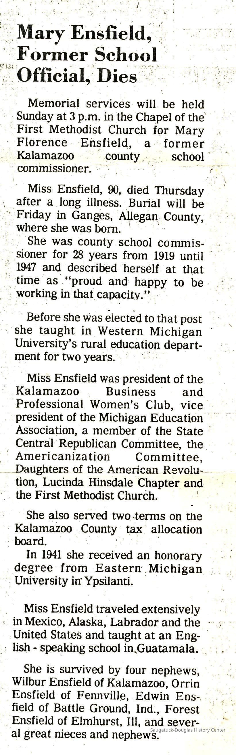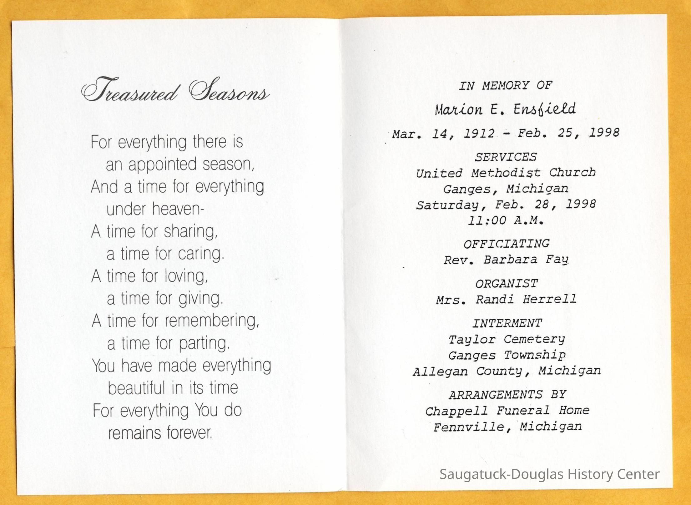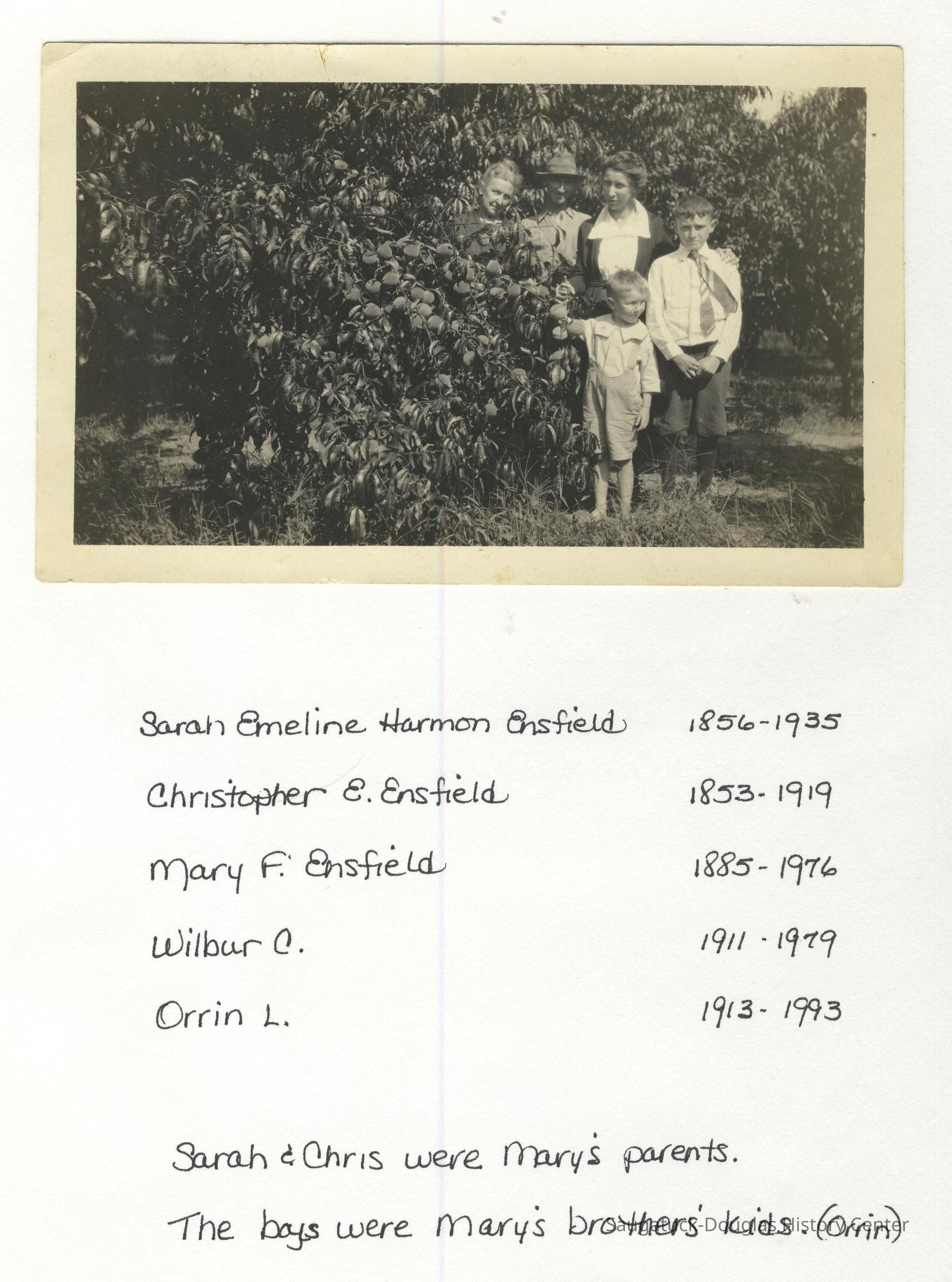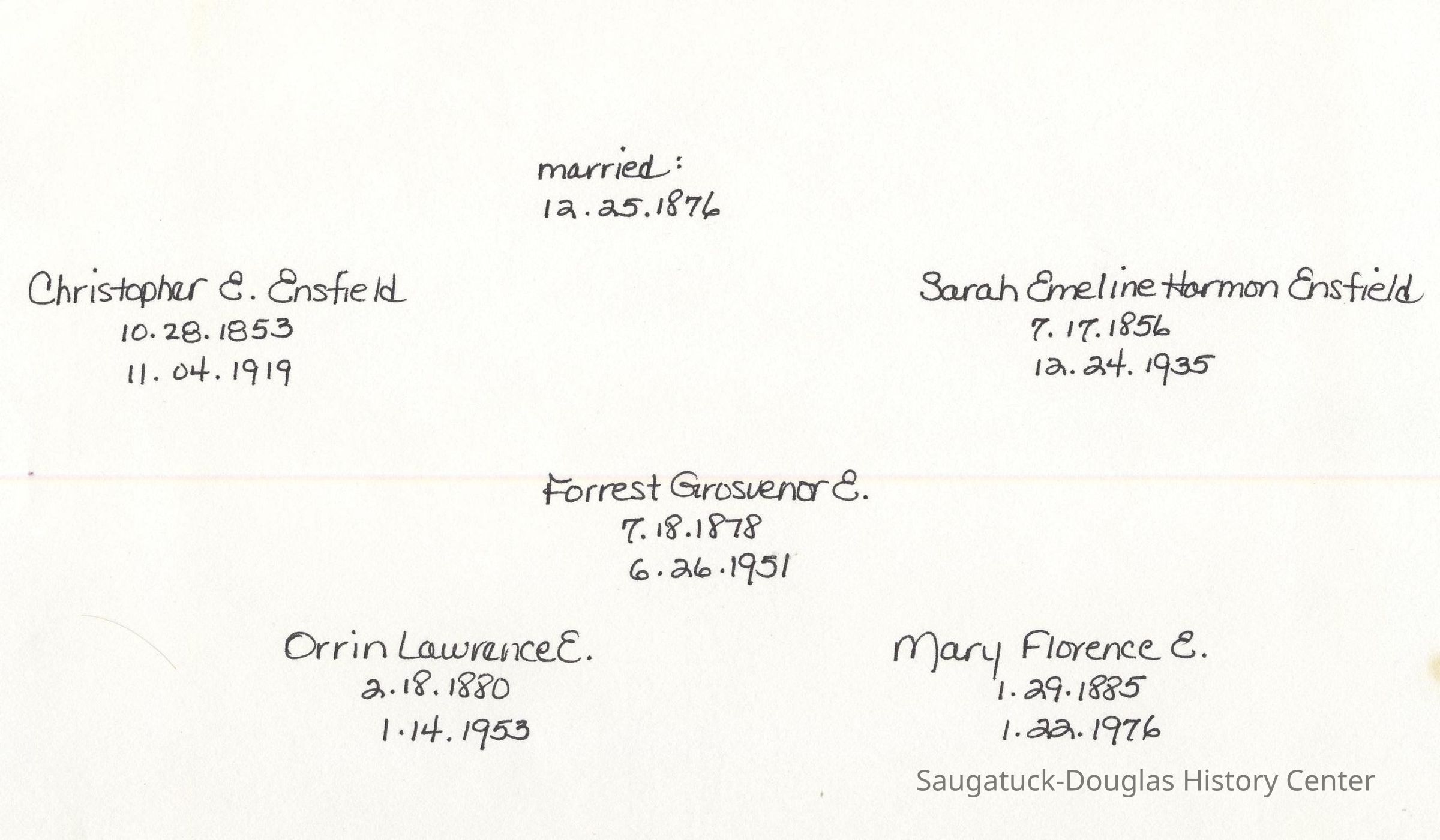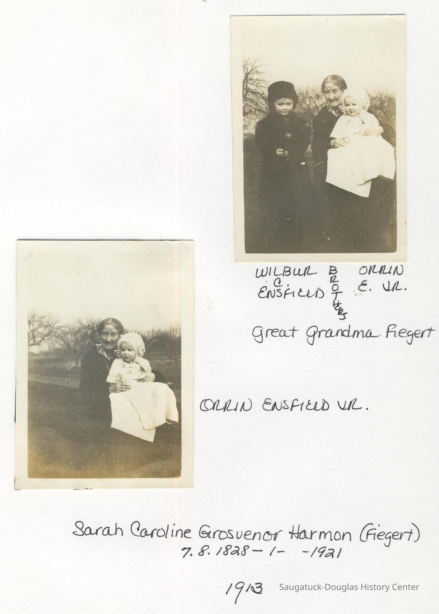 Ensfield and Grosvenor family research information including scans of photos, obituaries and funeral programs collected by Chris Yoder. Many of the subject people have Fennville and Ganges farming connections.