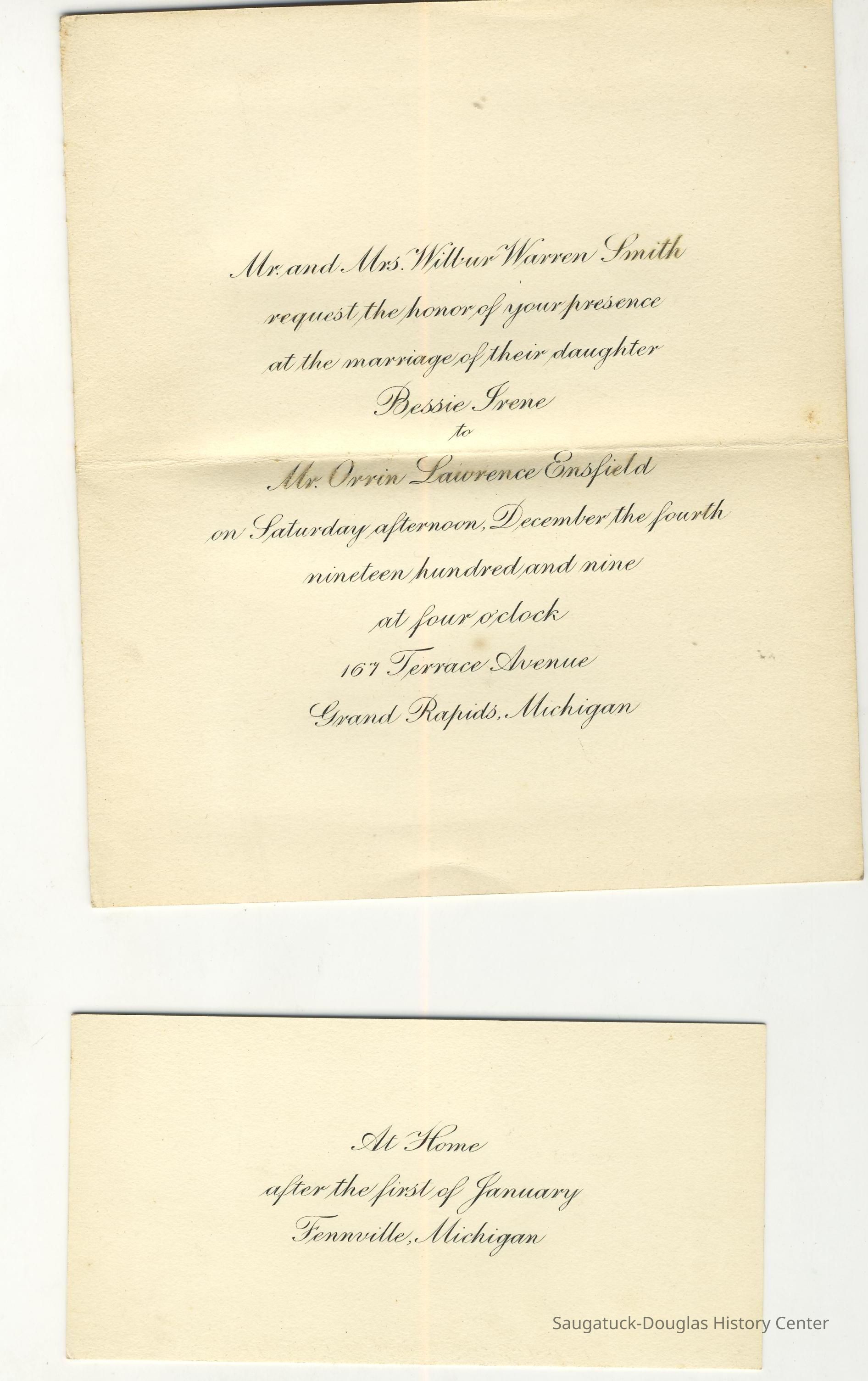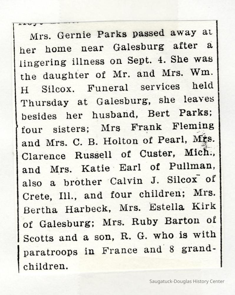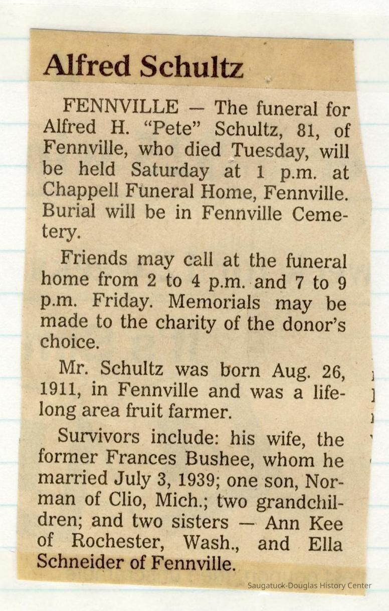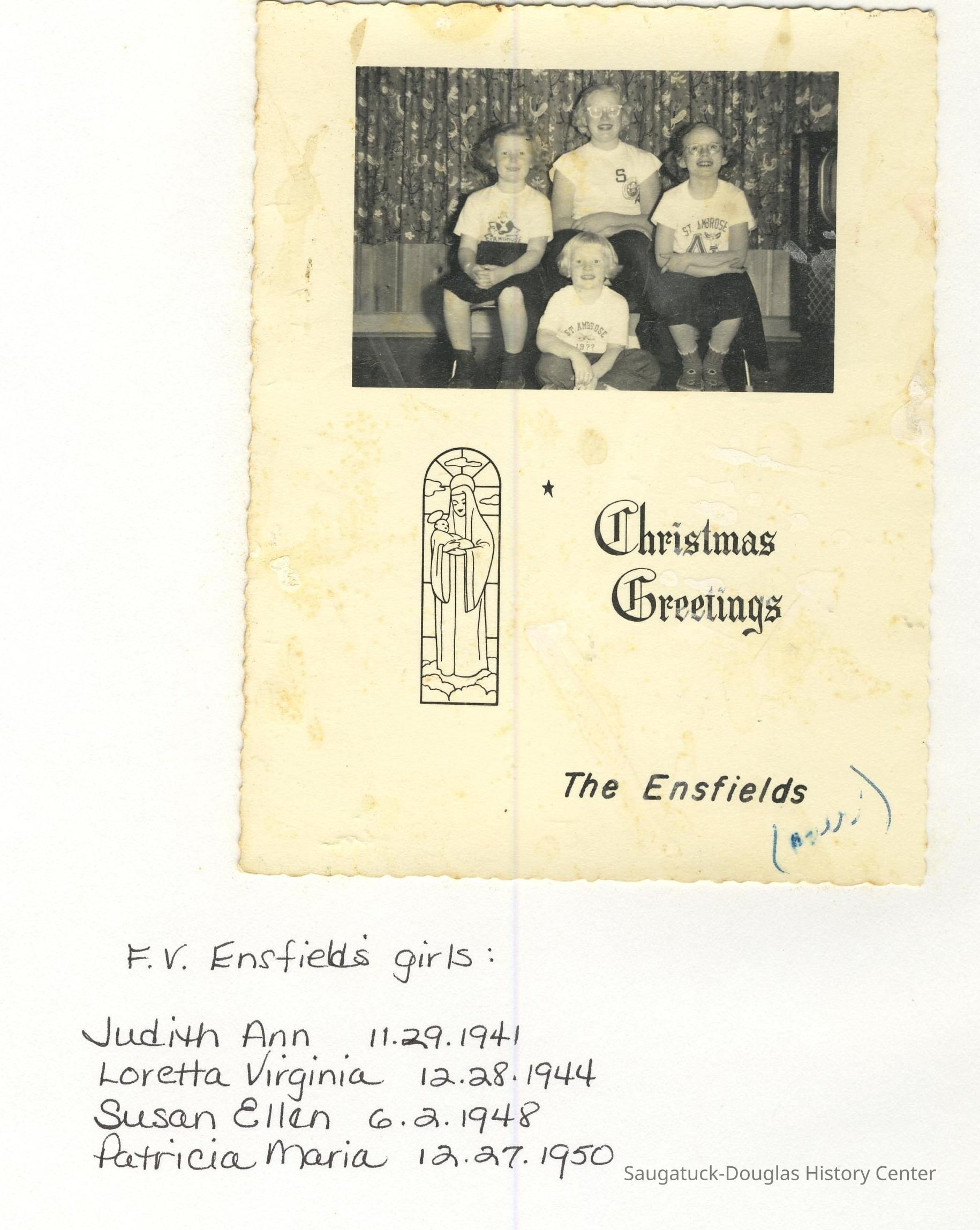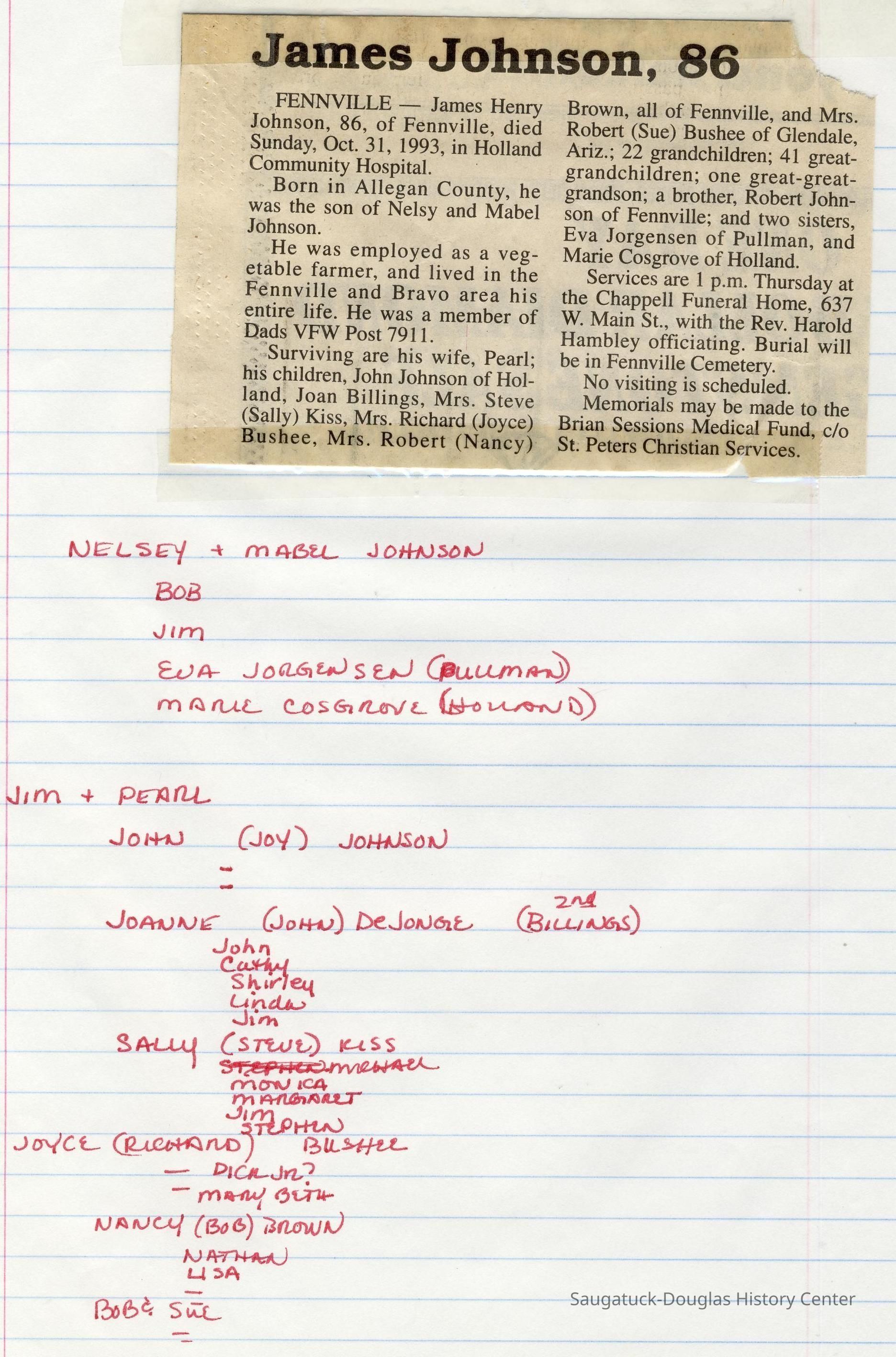 Ensfield and Grosvenor family research information including scans of photos, obituaries and funeral programs collected by Chris Yoder. Many of the subject people have Fennville and Ganges farming connections.