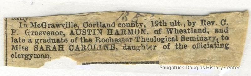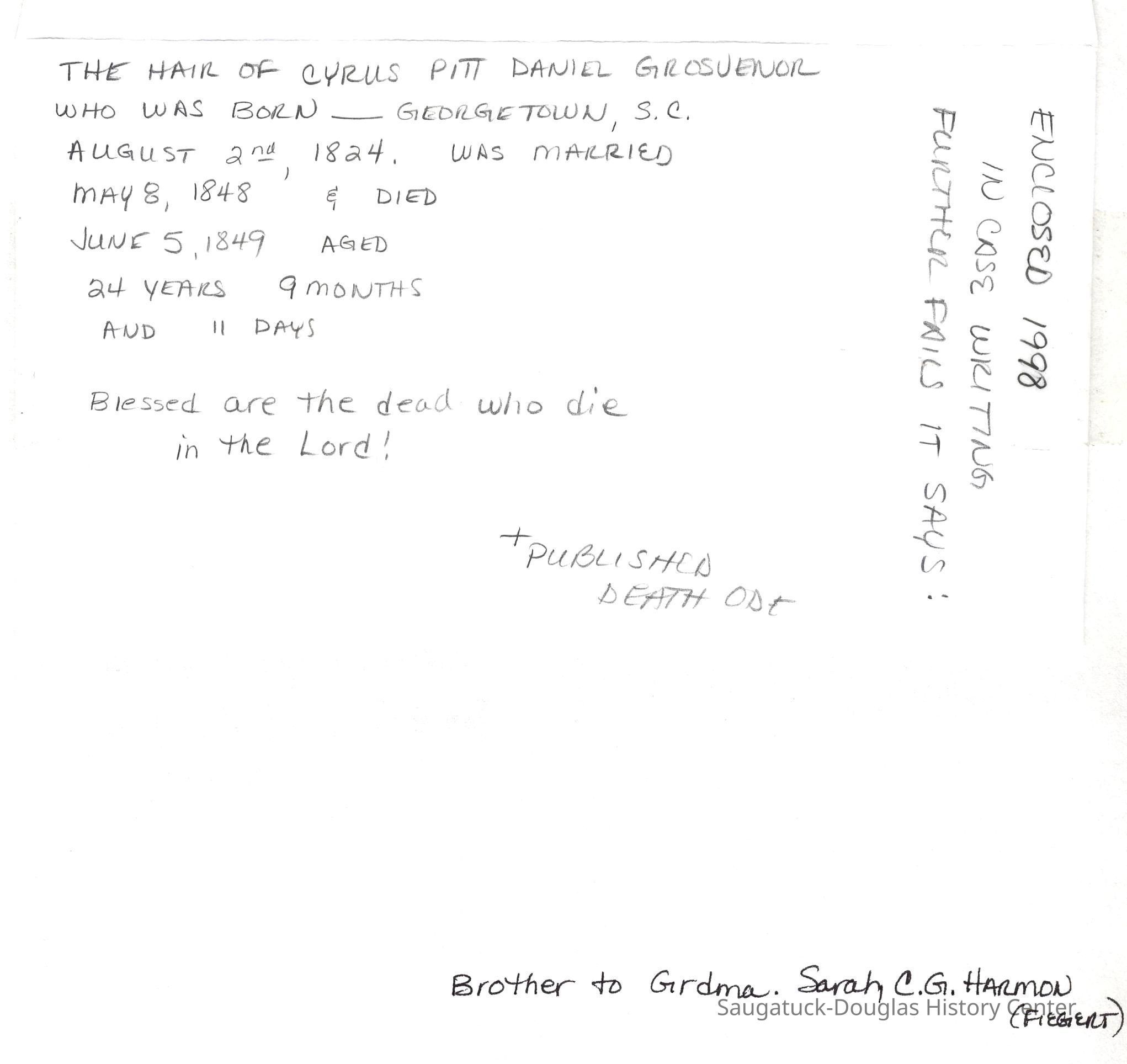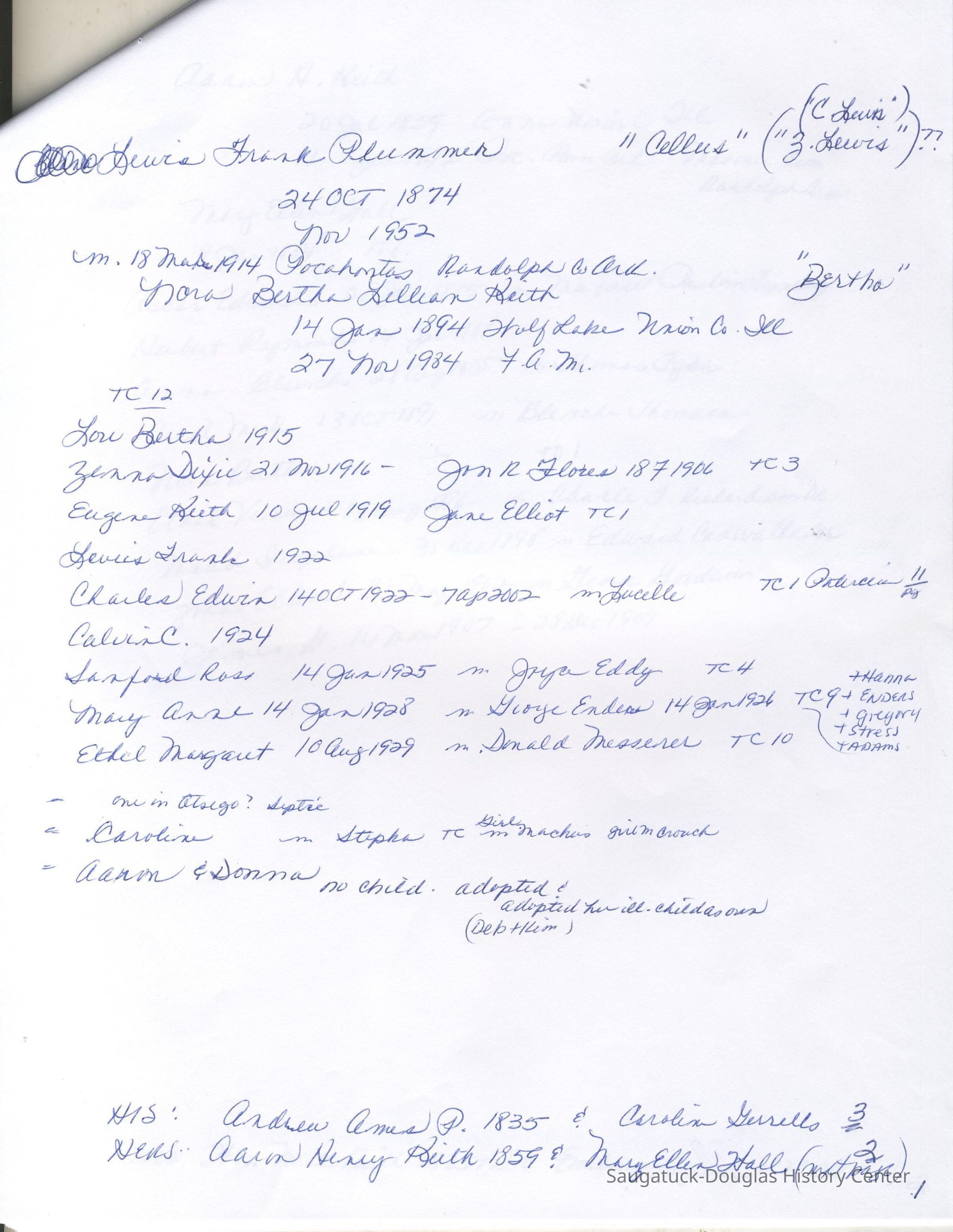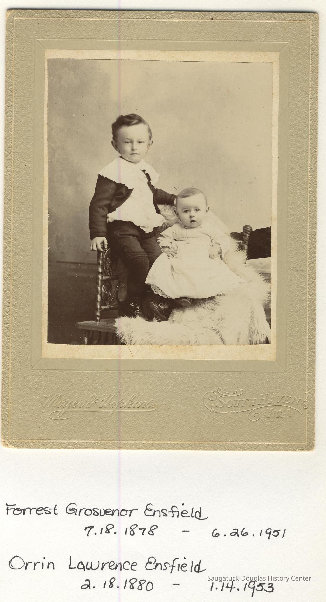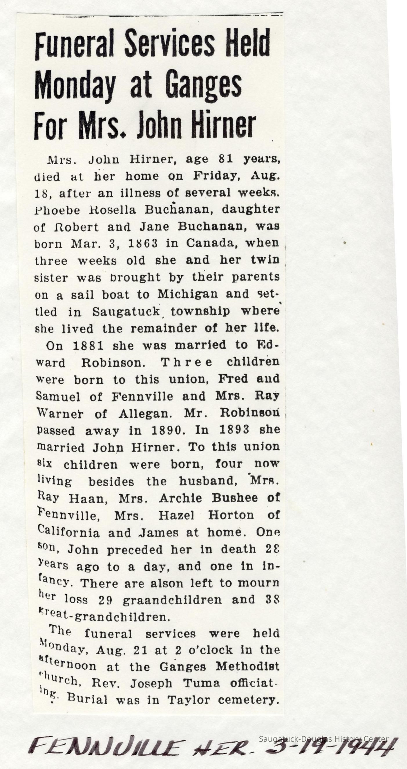 Ensfield and Grosvenor family research information including scans of photos, obituaries and funeral programs collected by Chris Yoder. Many of the subject people have Fennville and Ganges farming connections.