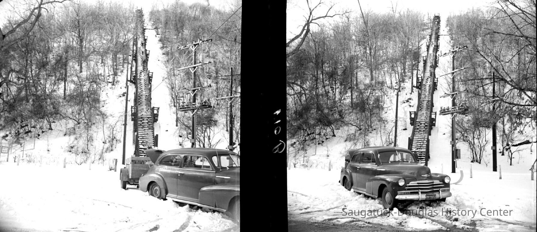 A older car and trailer parked at the base of the snowy Mt. Baldhead stairs.
