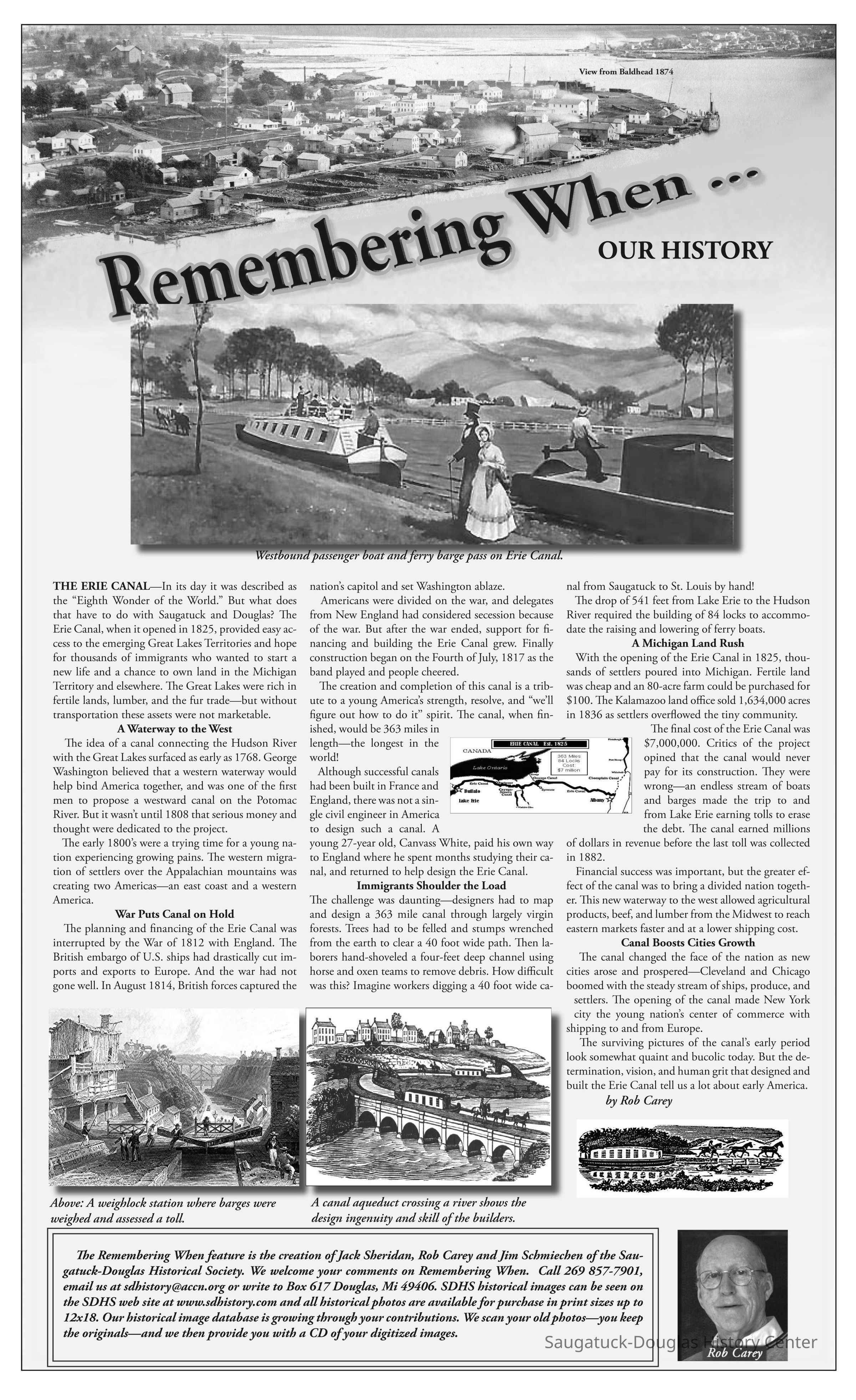THE ERIE CANAL-In its day it was described as the "Eighth Wonder of the World." But what does that have to do with Saugatuck and Douglas? The Erie Canal, when it opened in 1825, provided easy access to the emerging Great Lakes Territories and hope for thousands of immigrants who wanted to start a new life and a chance to own land in the Michigan Territory and elsewhere. The Great Lakes were rich in fertile lands, lumber, and the fur trade-but without transportation these assets were not marketable.