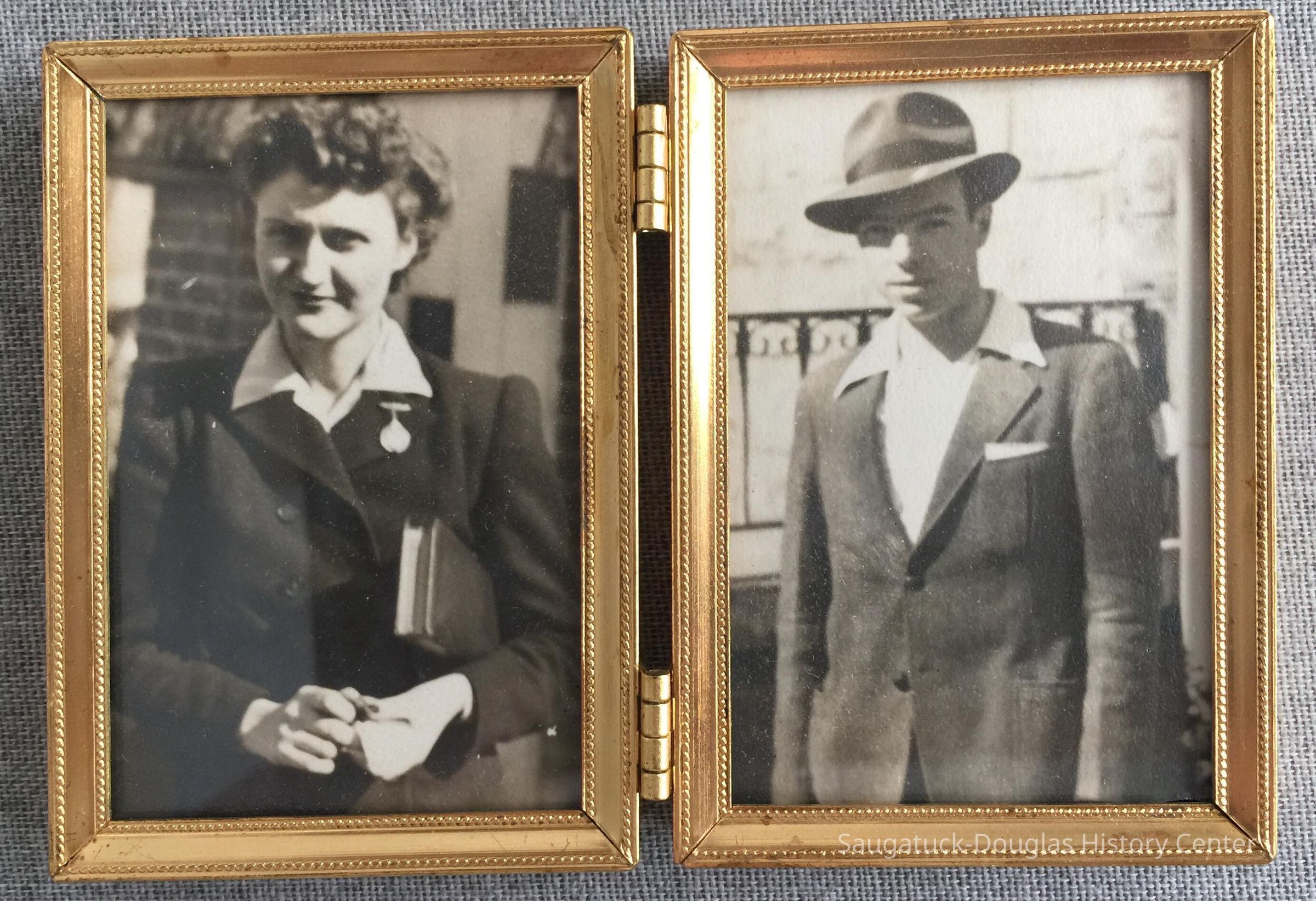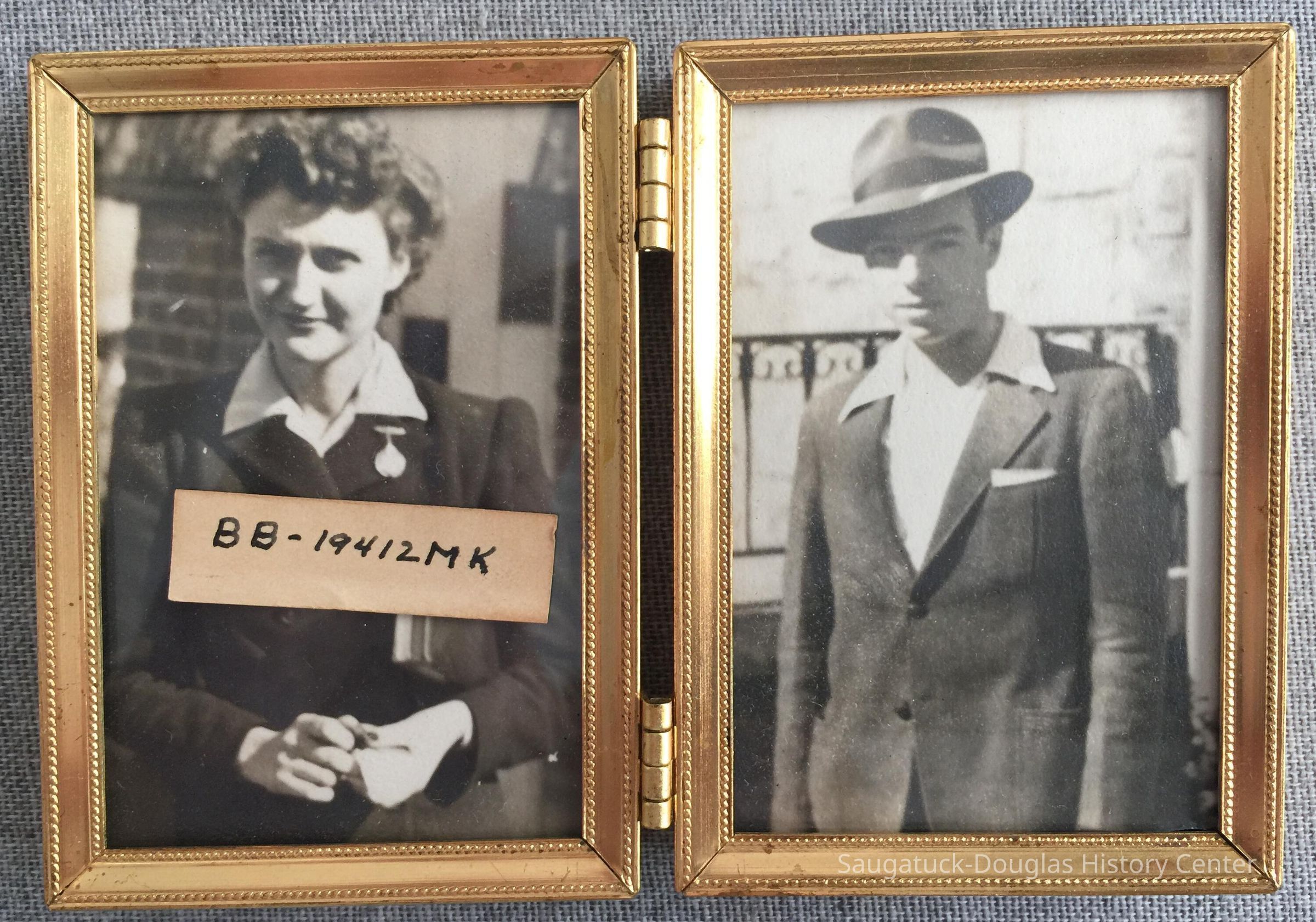 A pair of photographs in a modest, gold-colored metal, hinged double frame. Open, the frame is 5 x 3.5 inches. The man and woman are in 1930-1940s-style clothing. The woman has a watch or metal on her jacket lapel. A slip of paper with the text "BB-19412MK" was tucked behind the photo of the woman.The man is wearing a fedora hat with pocket square but no tie -- possibly Erwin "Tony" Koning.Photograph Details