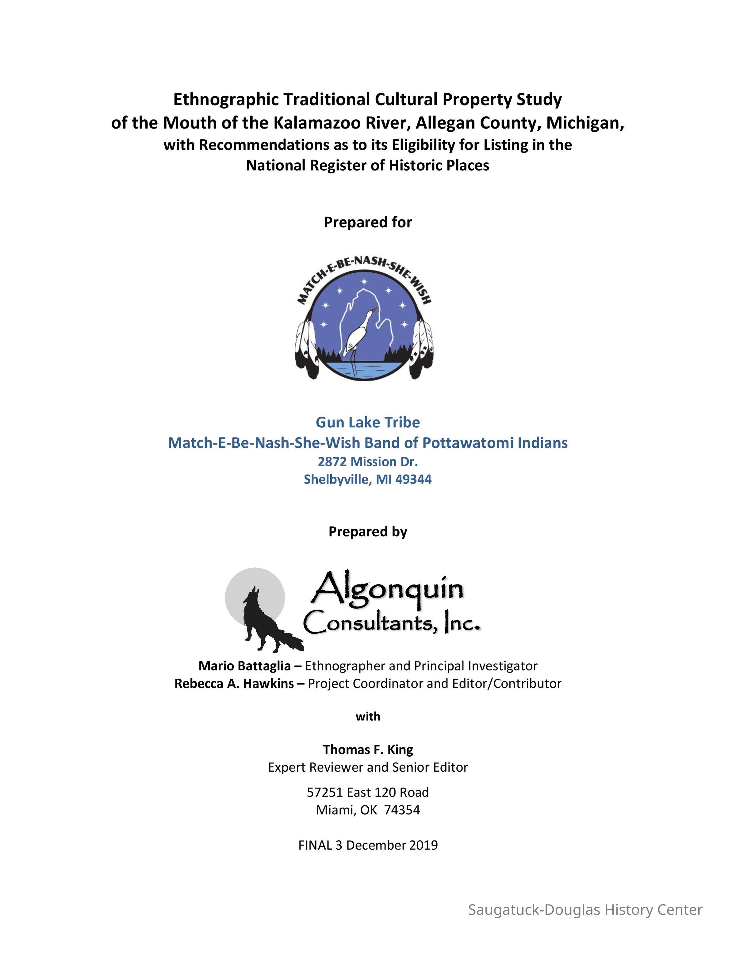 Ethnographic Traditional Cultural Property Study of the Mouth of the Kalamazoo River, Allegan County, Michigan, with Recommendations as to its Eligibility for Listing in the National Register of Historic Places