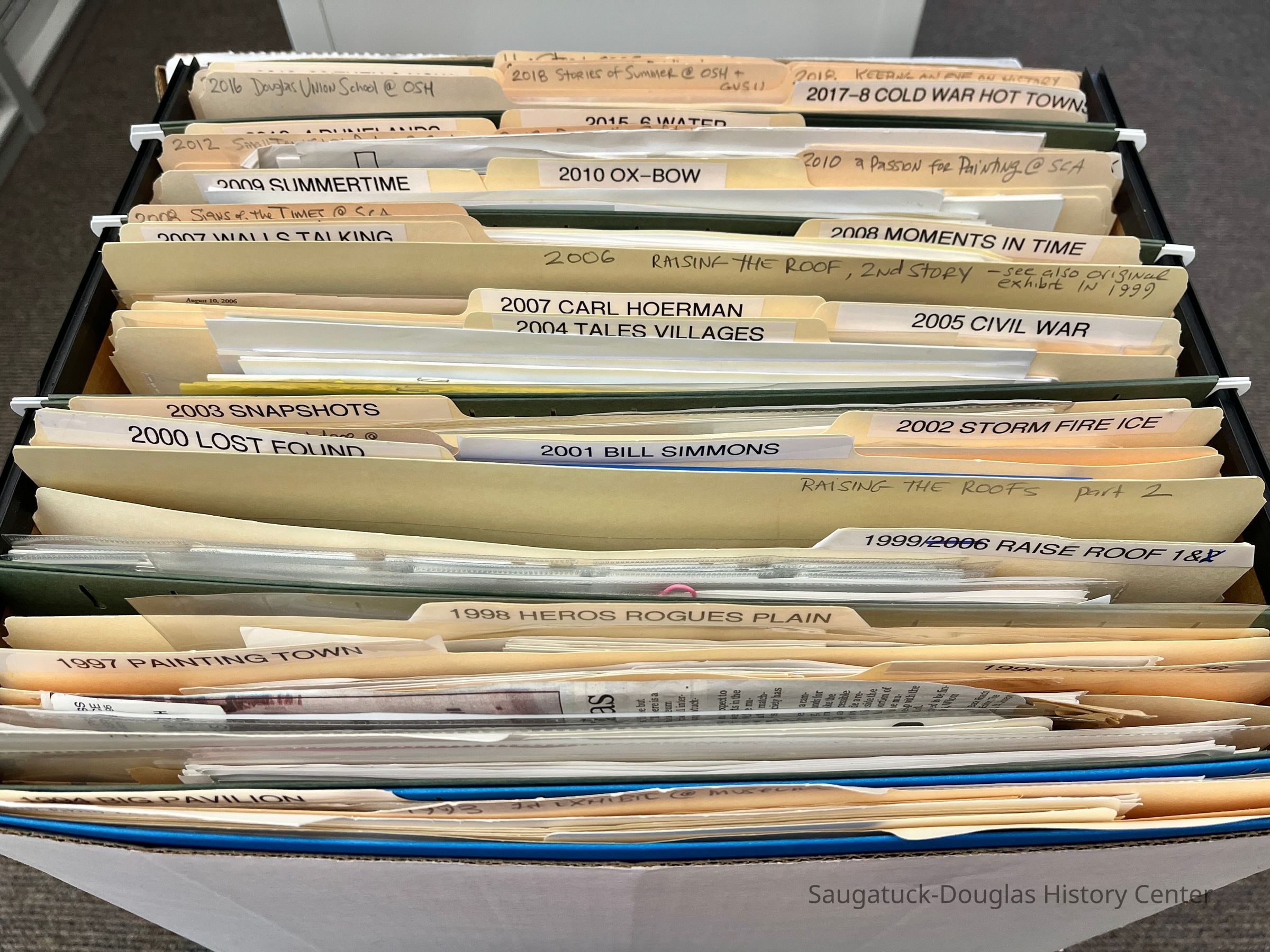 Bankers box filled with folders of materials used to research, write, design, build and promote SDHS and SDHC exhibits. Exhibits listed below were located at the Saugatuck-Douglas History Museum (Pump House) unless otherwise noted.