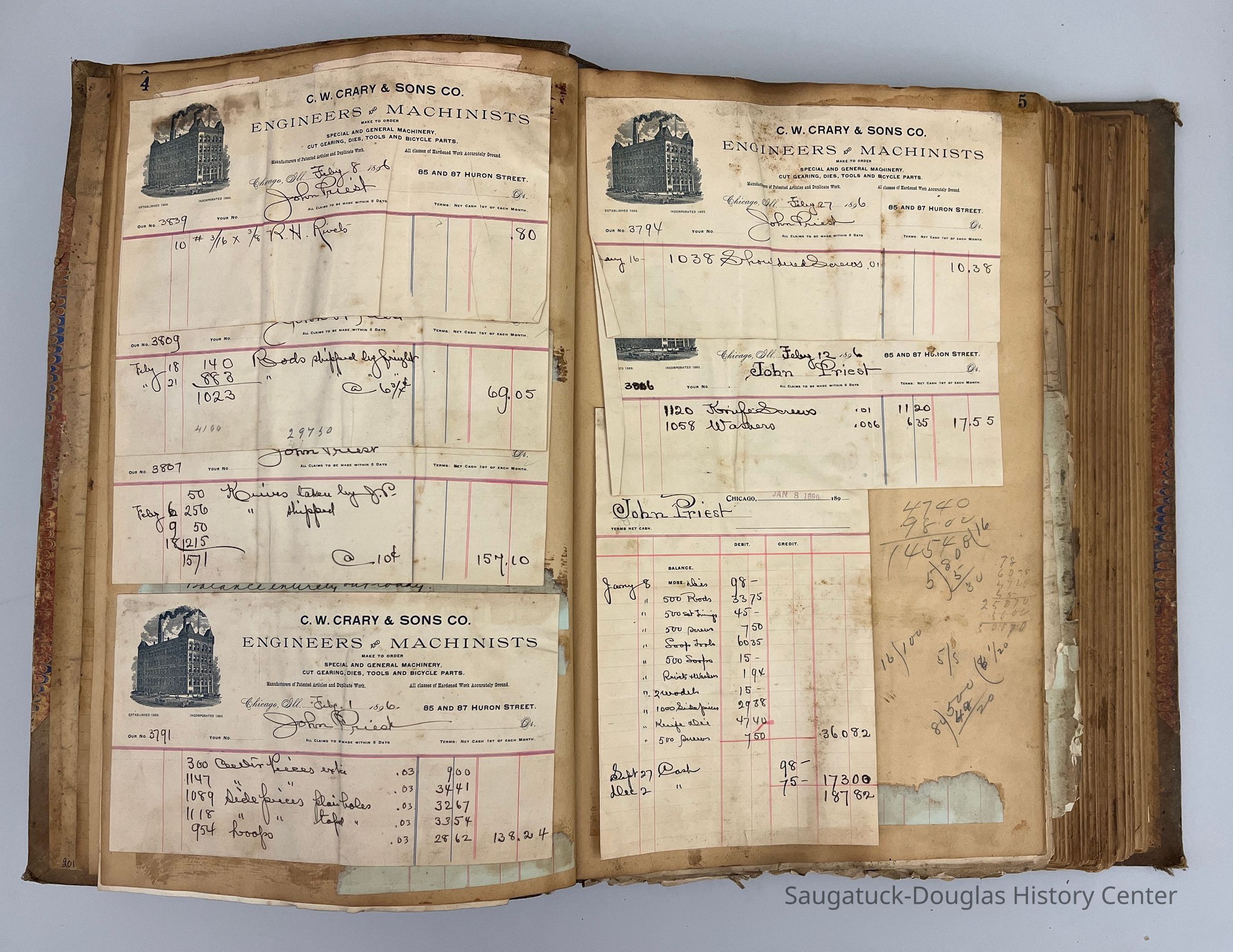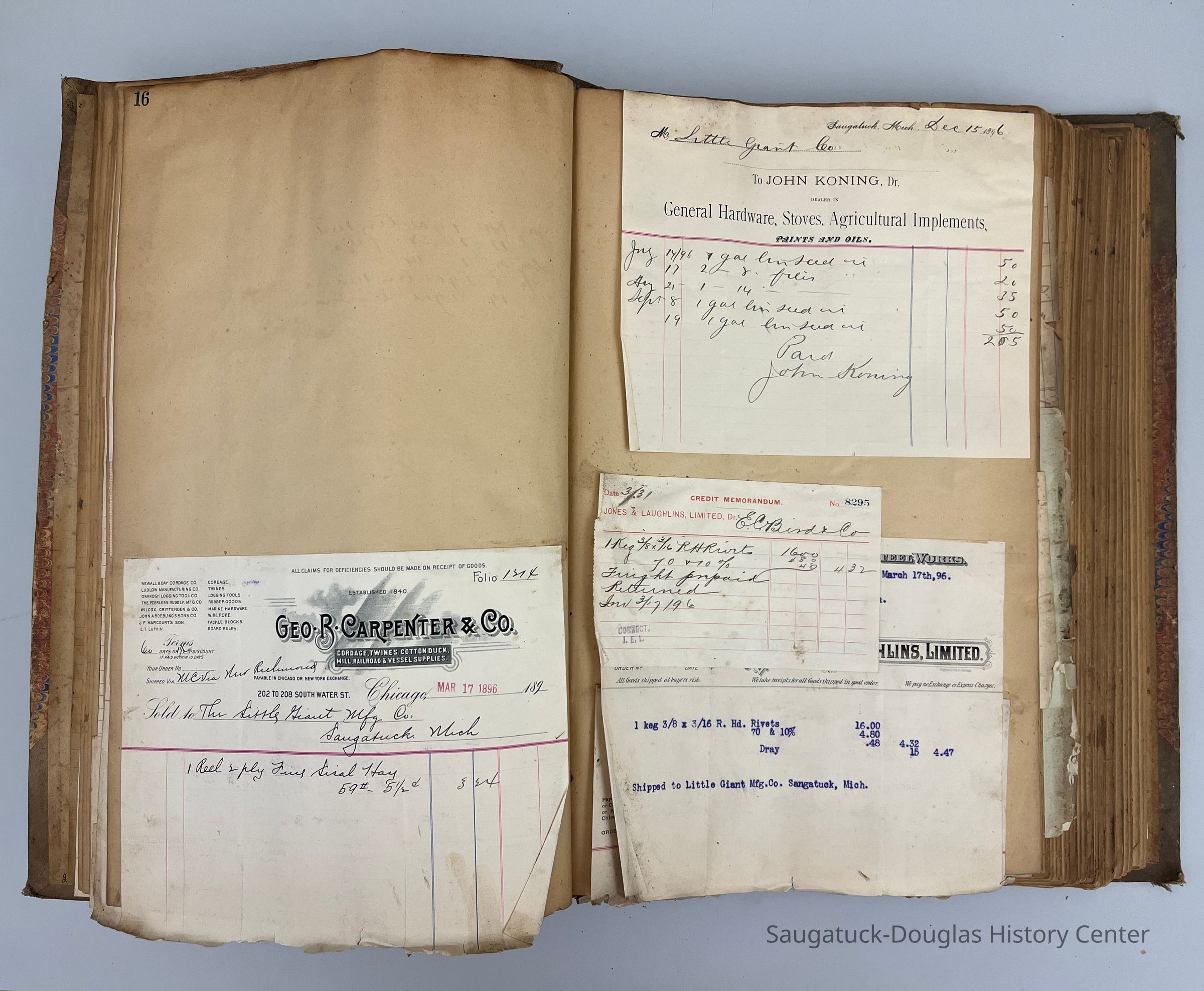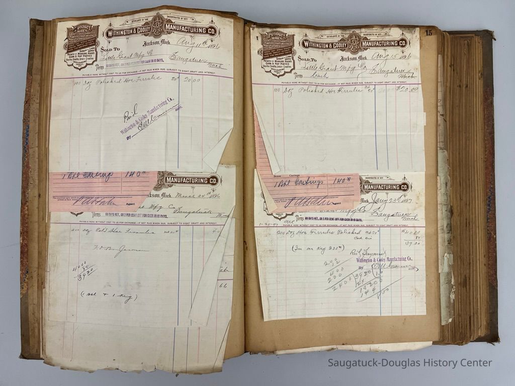 Ledger with invoices pasted to the pages. Many invoices are to or from the The Little Giant Manufacturing Co.