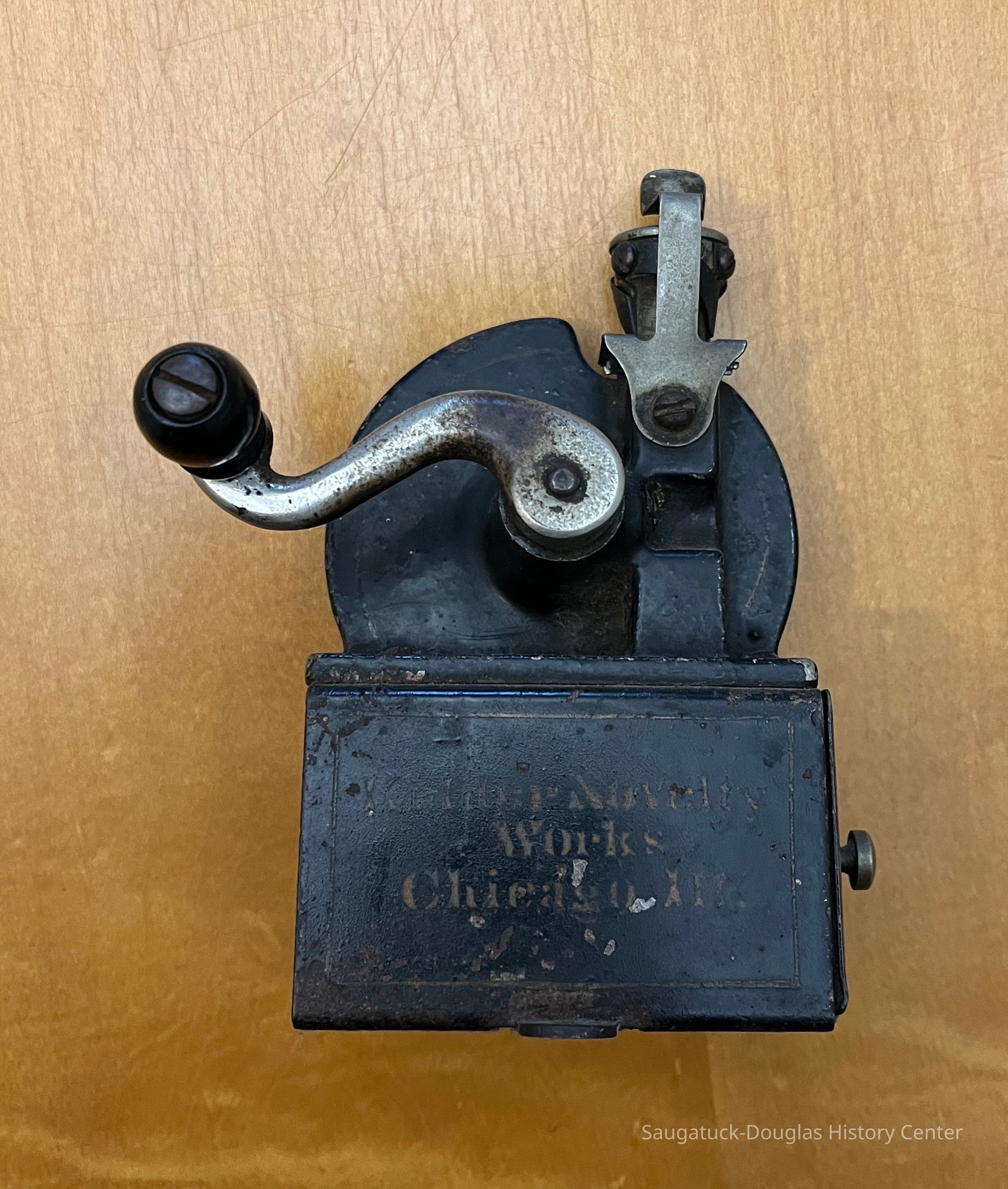 Handcranked pencil sharpner with drawer in side - 3 arched blades similar to a meat slicer painted black with the words, Kidder Novelty Works, Chicago, ILCollection