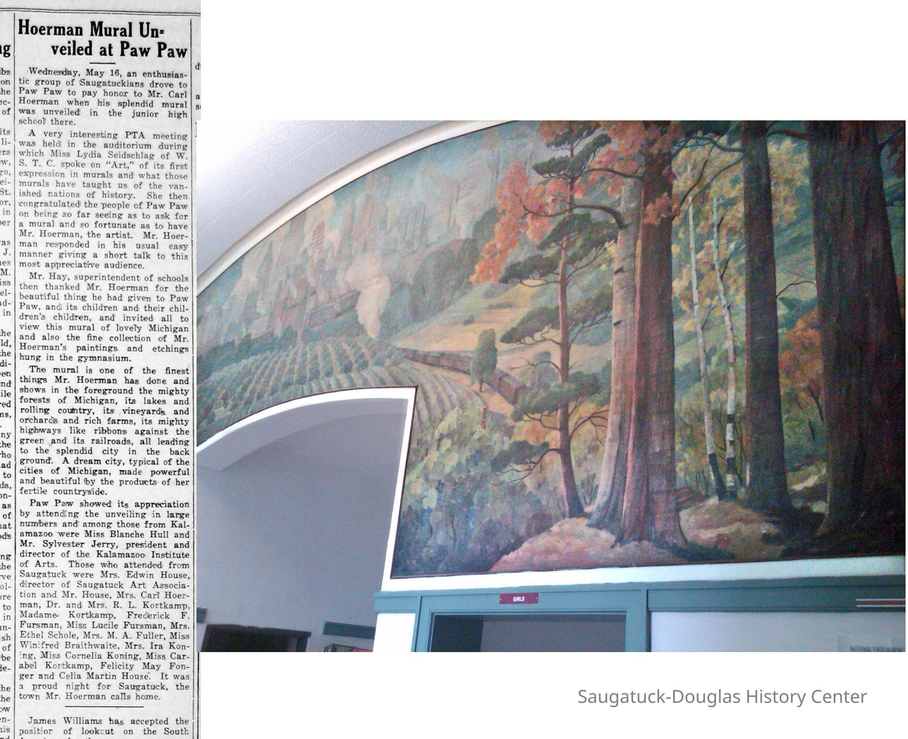 Saugatuckians who traveled to the unveiling of the mural in Paw Paw included Celia Martin (Gamble) House in her role as director of the Saugatuck Art Association, Edwin House, Christiana Hoerman, Dr. and Mrs. R.L. Kortkamp. Madame Kortkamp, Frederick and Lucile Fursman, Ethel Schole, Mrs. M.A. Juller, Winifred Braithwaite, Mrs. Ira Koning, Cornelia Koning, Carabel Kortkamp, Felicity May Fonger and Celia Martin (House) Allen.Collection