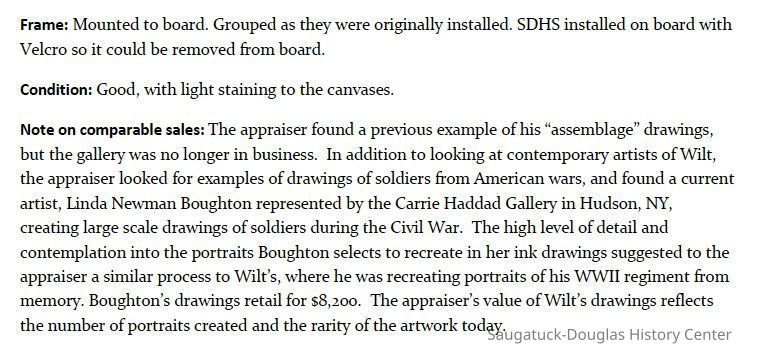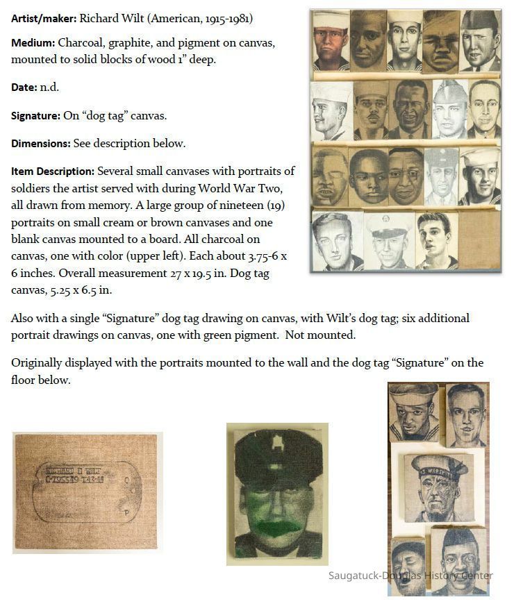There are a total of 25 different drawings/paintings of soldiers and one drawing of Wilt's dogtag which is the signature. These were not grouped by the artist. The larger grouping was assembled for the retrospective exhibit in Chelsea MI which was put together by the artist's widow, Ellen Bonar Wilt. The signature was an aside to that grouping. the smaller grouping was assembled by the Ken Kutzel for the SDHS using the remaining images.