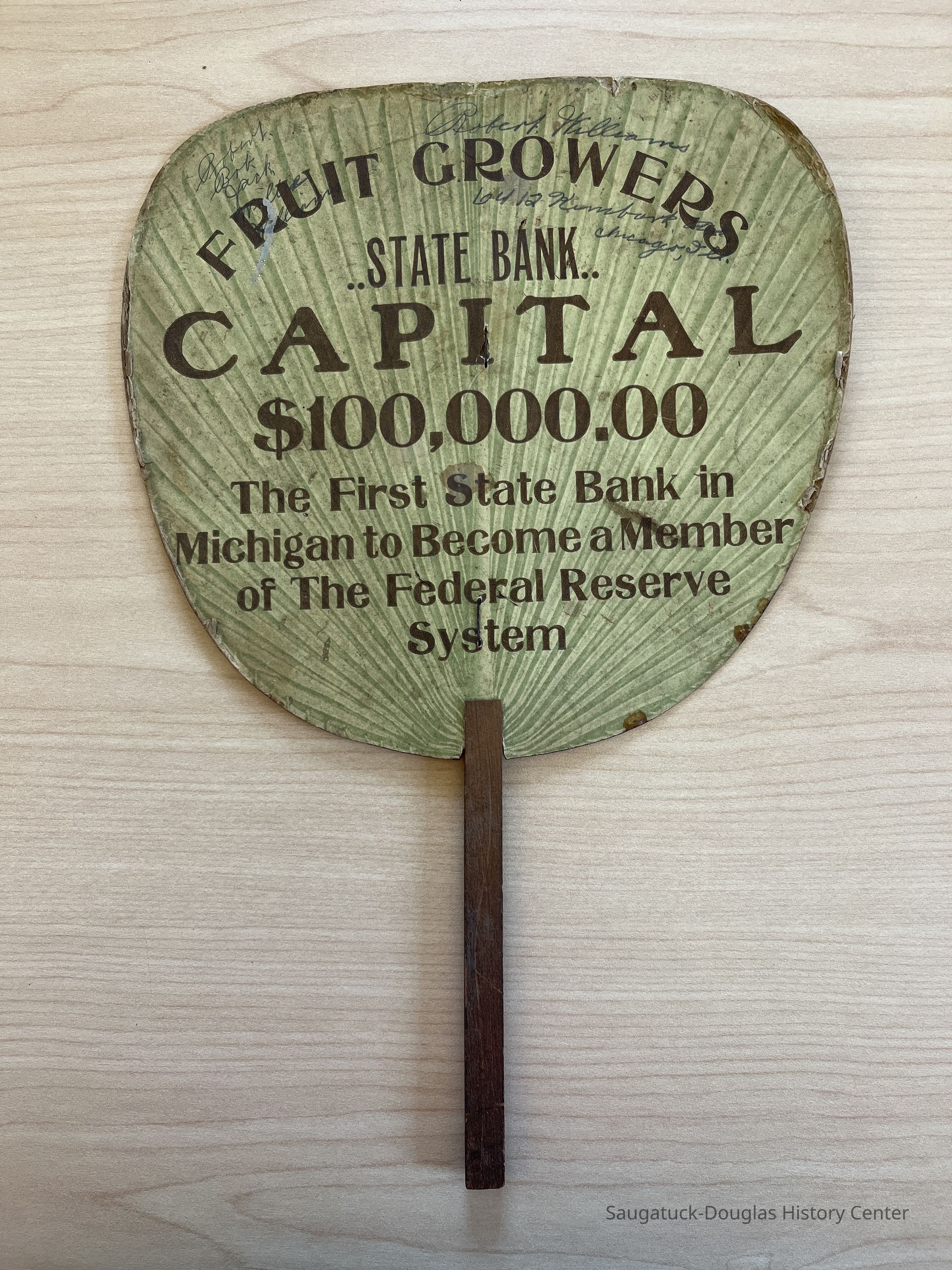 Green cardboard fan in shape of palm leaf with the words, Fruit Growers State Bank Capital $100,000.00 The first bank in Michigan to become a member of the Federal Reserve System.