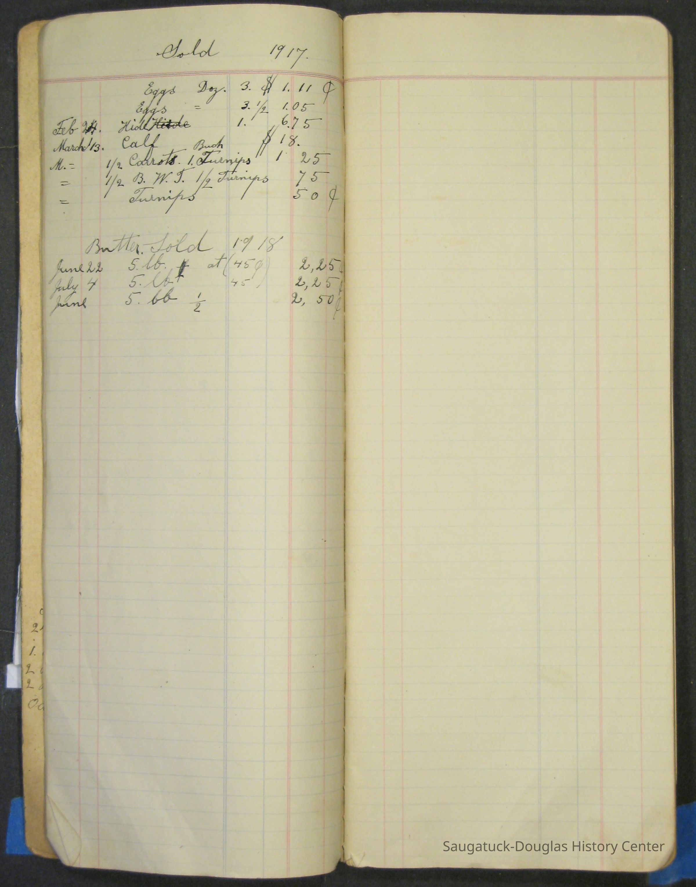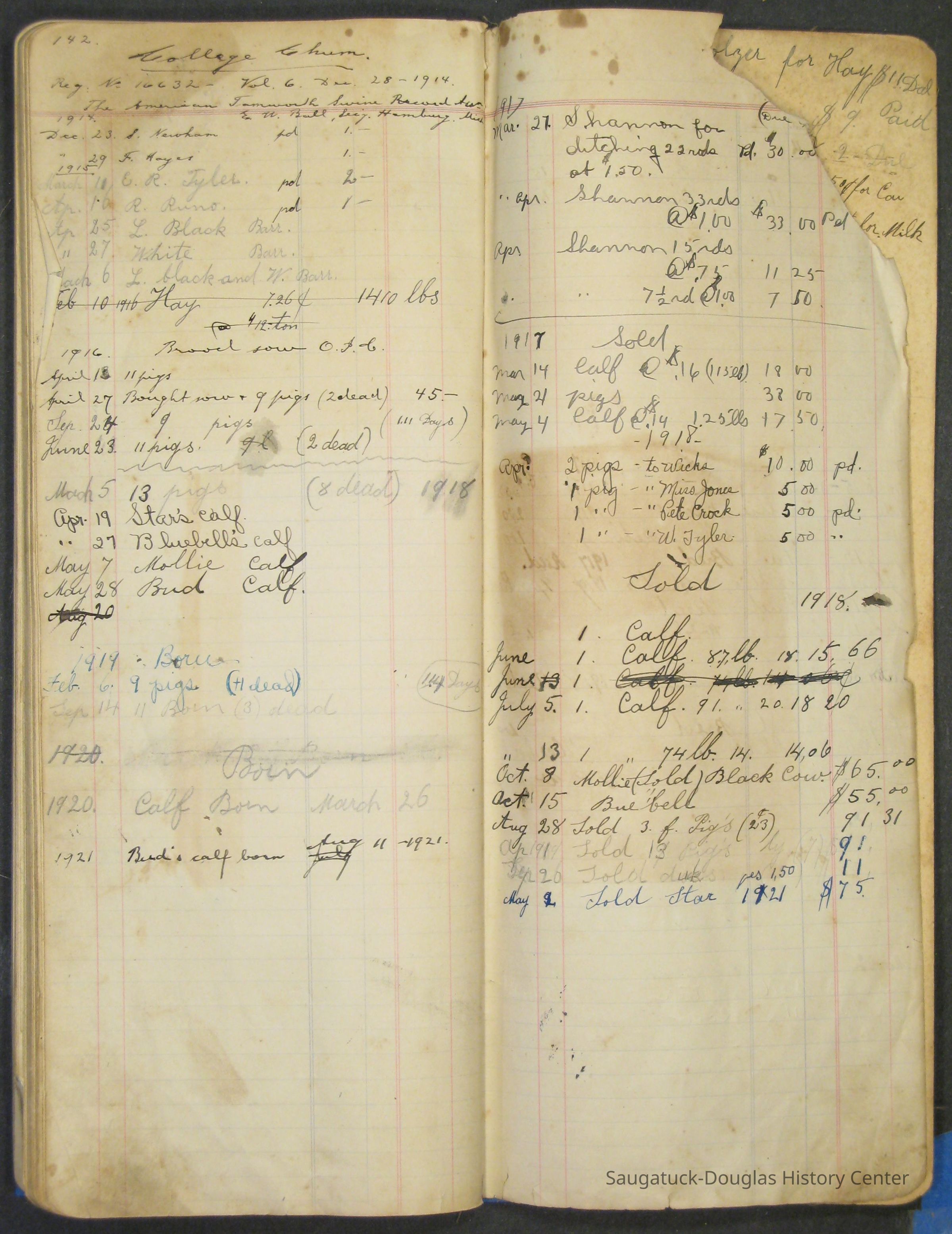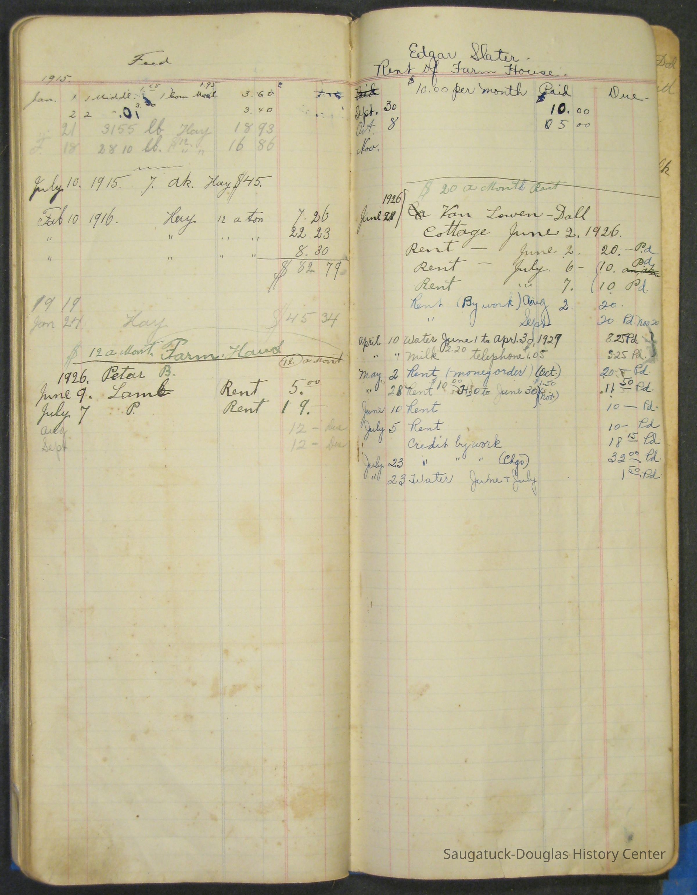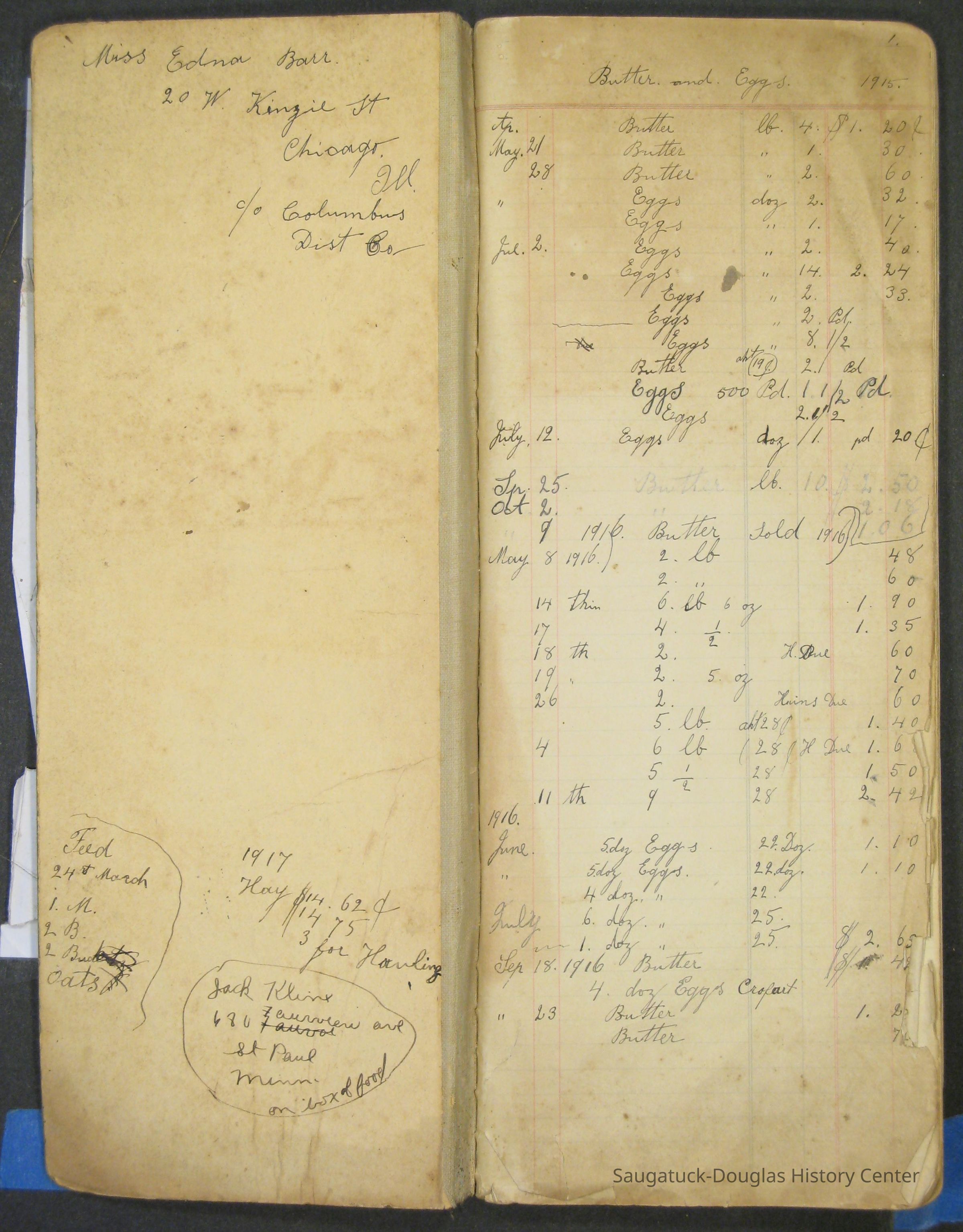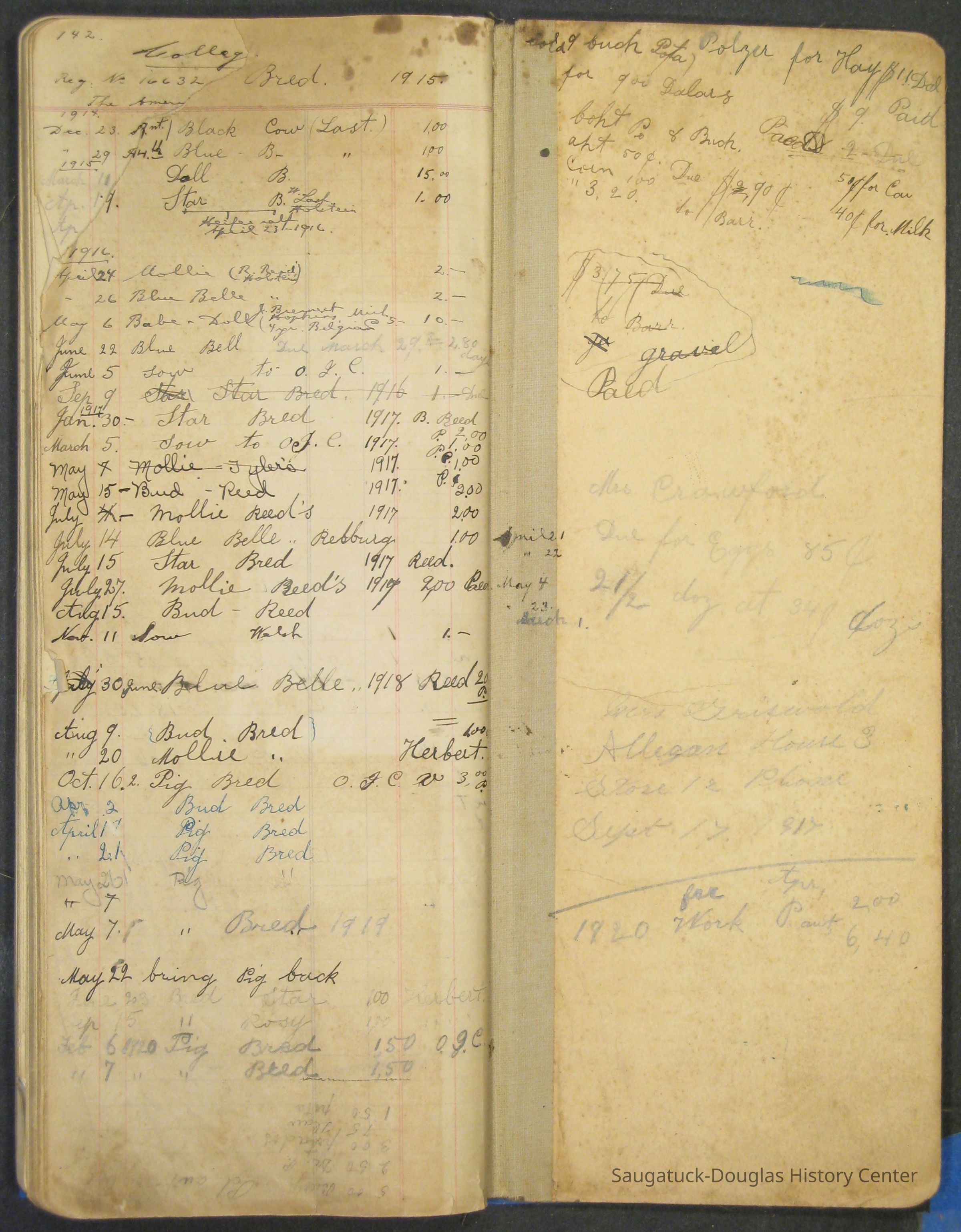 The Barr family operated a farm and a tourist home. The first page in the ledger is dated 1915 and logs the sale of butter and eggs. Other pages note the 1929 rent for the farm house or lists 1915 to 1918 weekly milk sales to Vos, Palzer, Bartlett, Houk, Crofart and other. Sales of farm products like calves, piglets, carrots, turnips are also recorded. Other notes include costs for wallpaper, farmhand wages, and breeding records.Collection