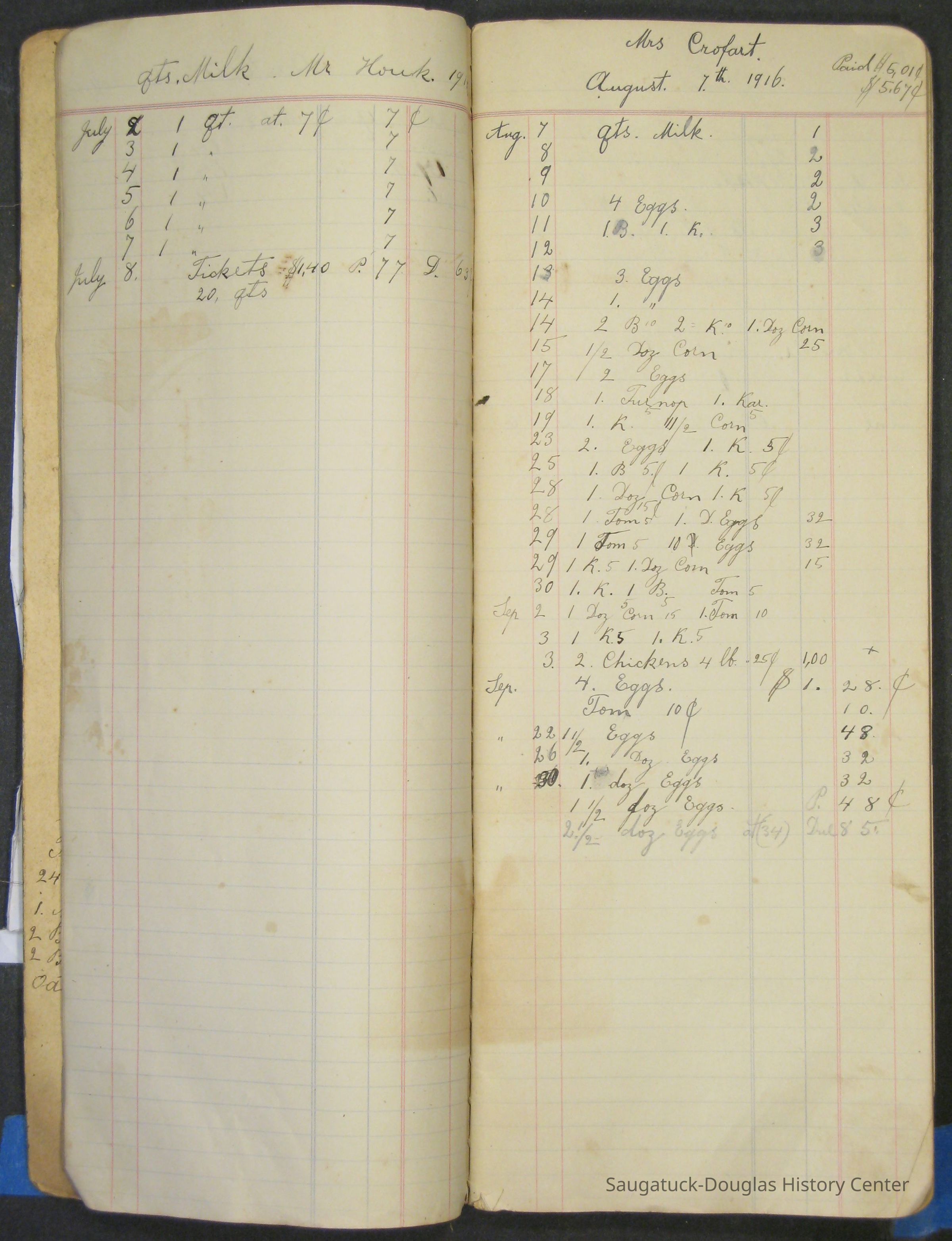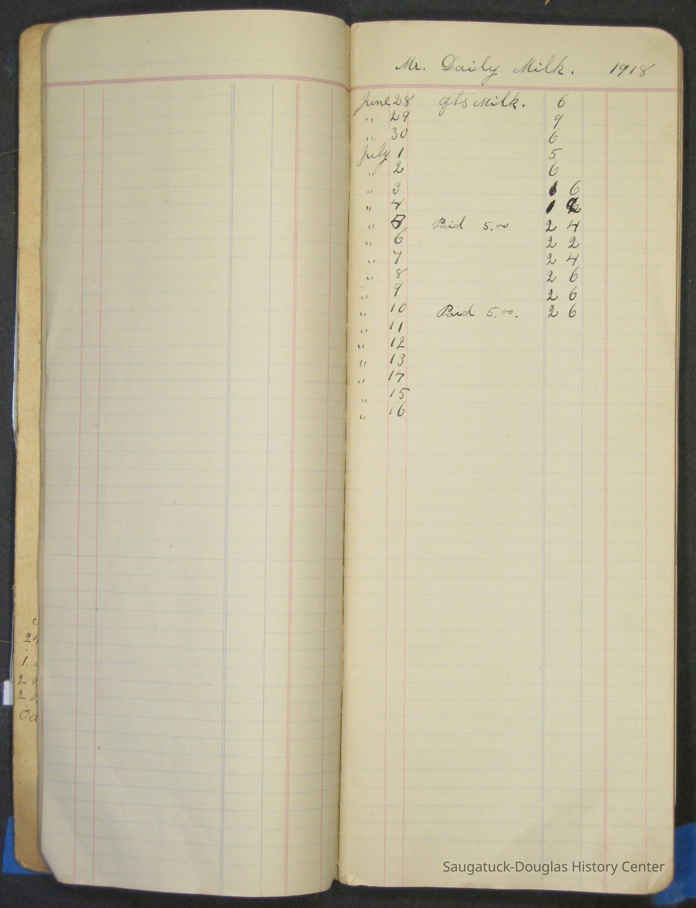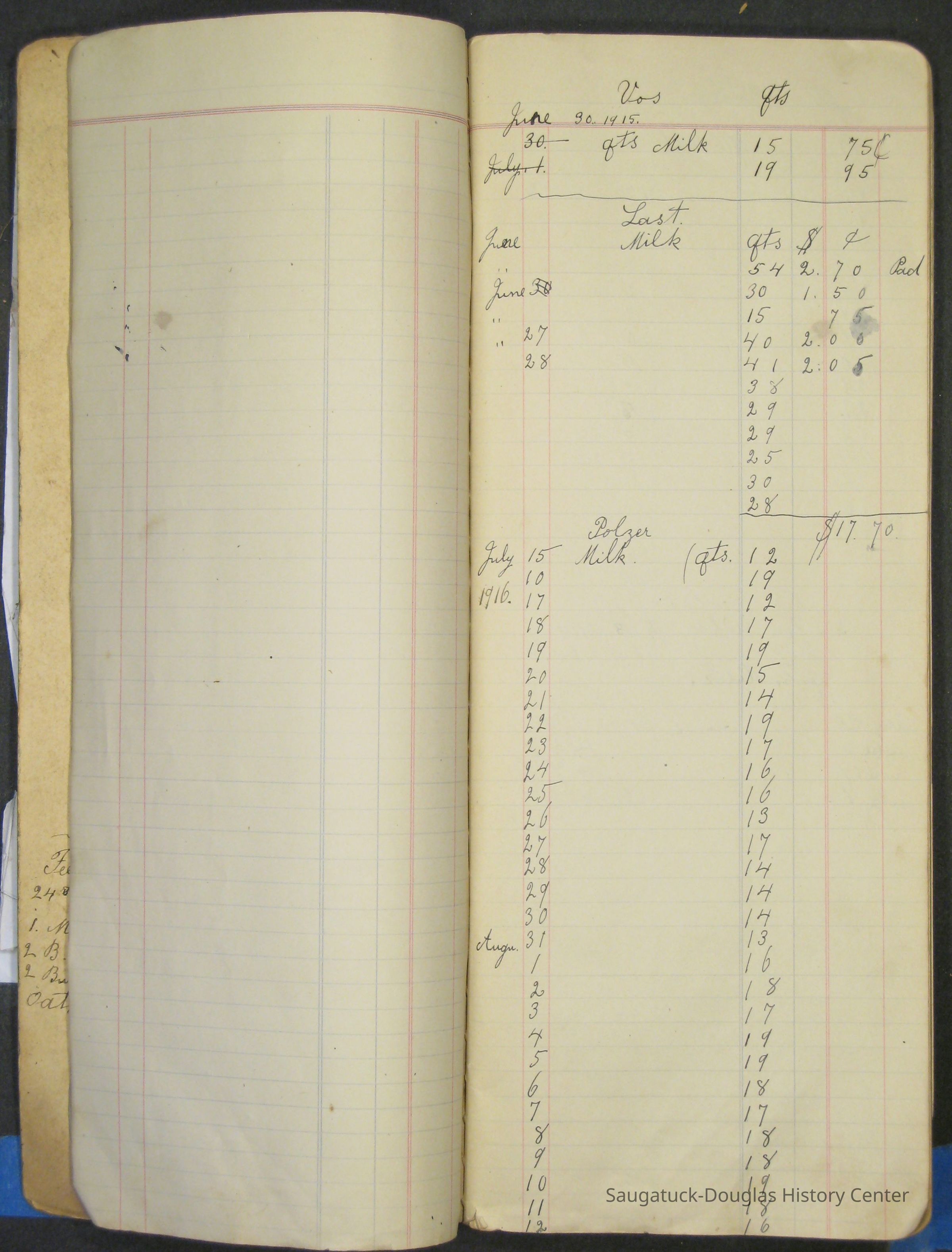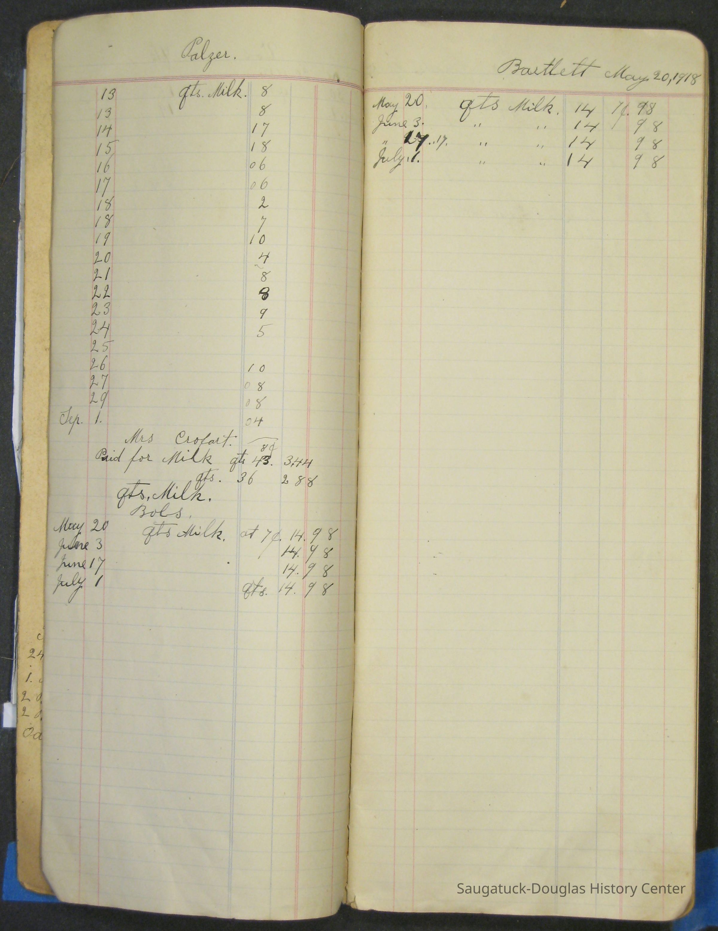 The Barr family operated a farm and a tourist home. The first page in the ledger is dated 1915 and logs the sale of butter and eggs. Other pages note the 1929 rent for the farm house or lists 1915 to 1918 weekly milk sales to Vos, Palzer, Bartlett, Houk, Crofart and other. Sales of farm products like calves, piglets, carrots, turnips are also recorded. Other notes include costs for wallpaper, farmhand wages, and breeding records.Collection
