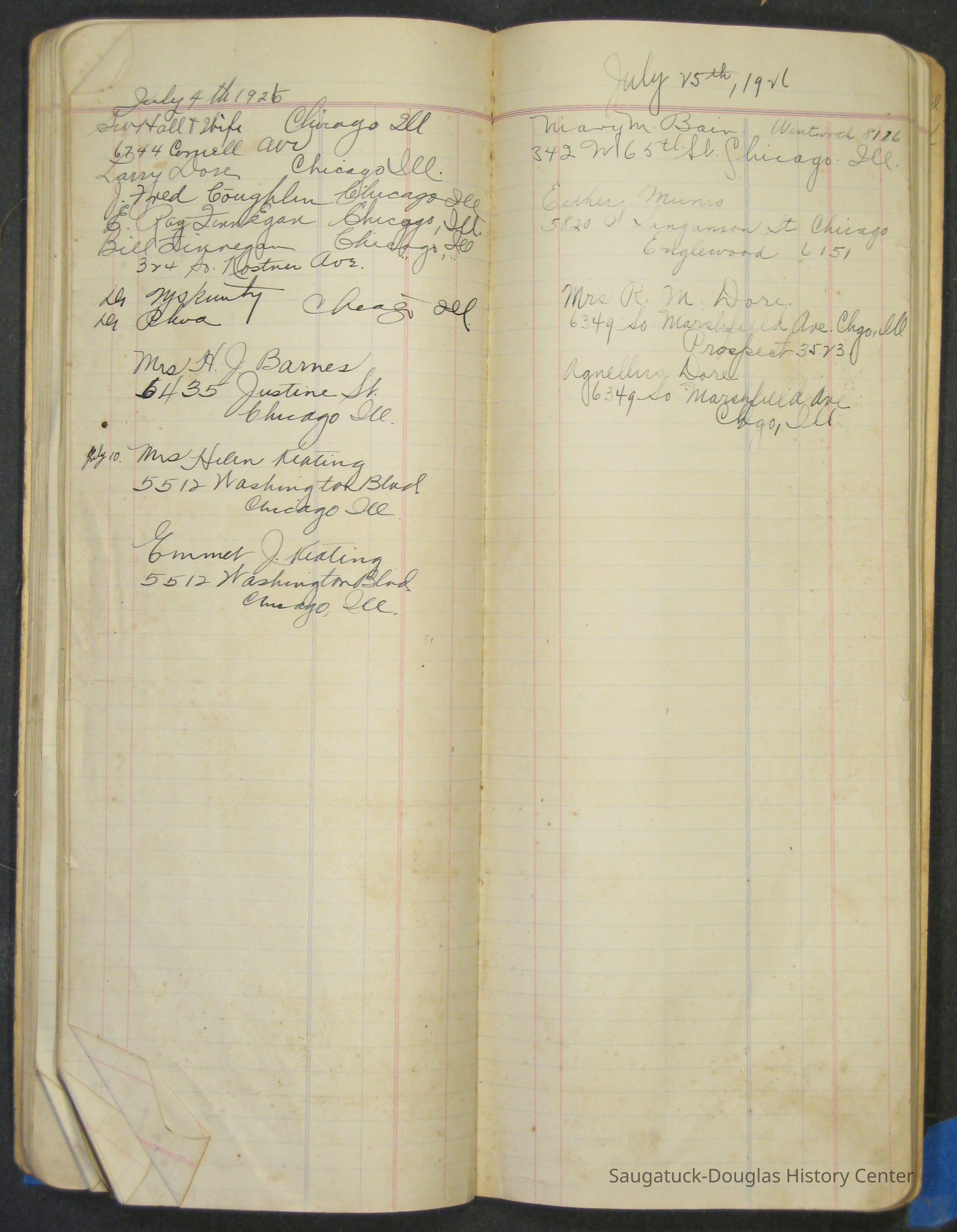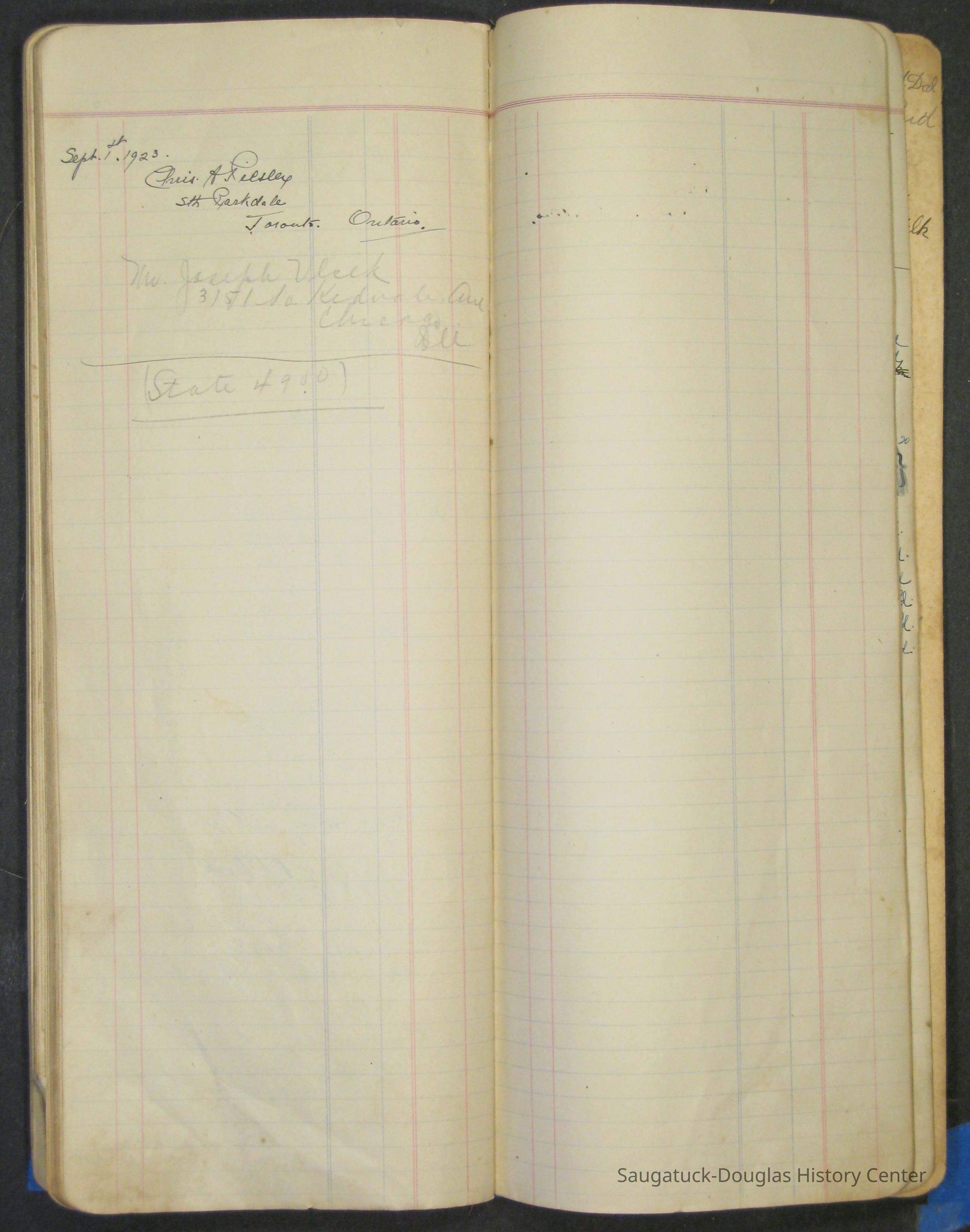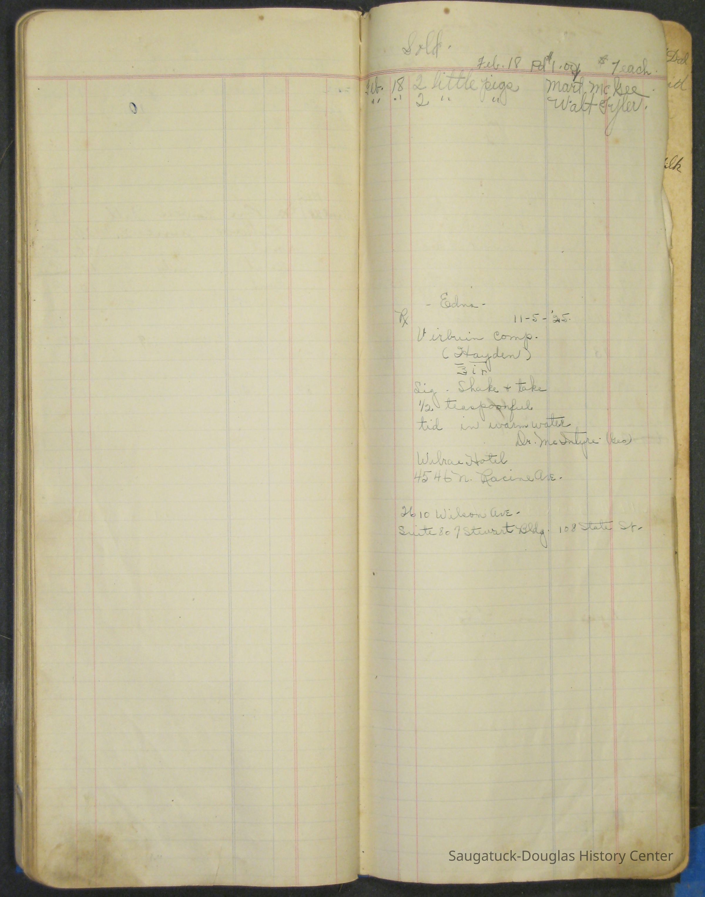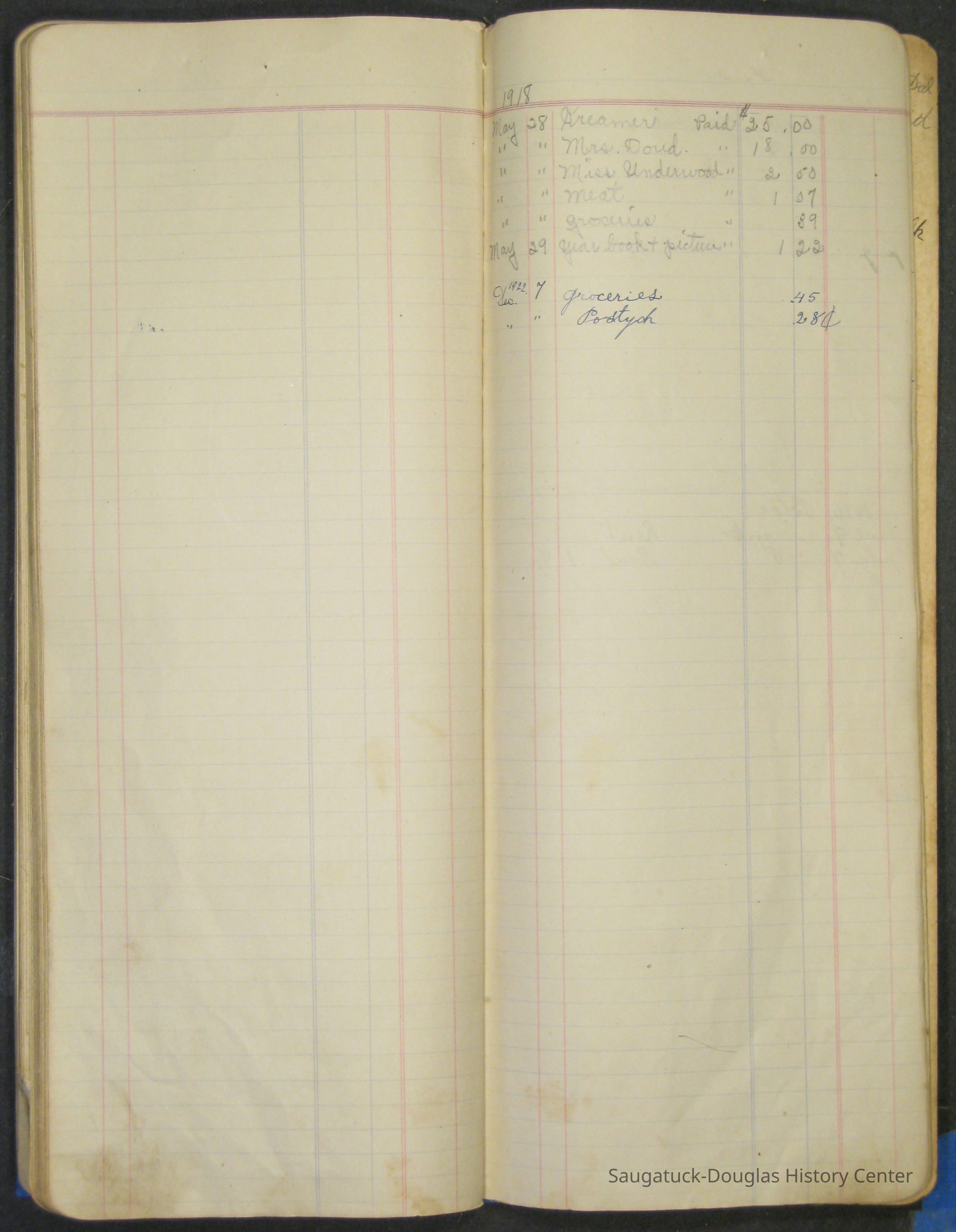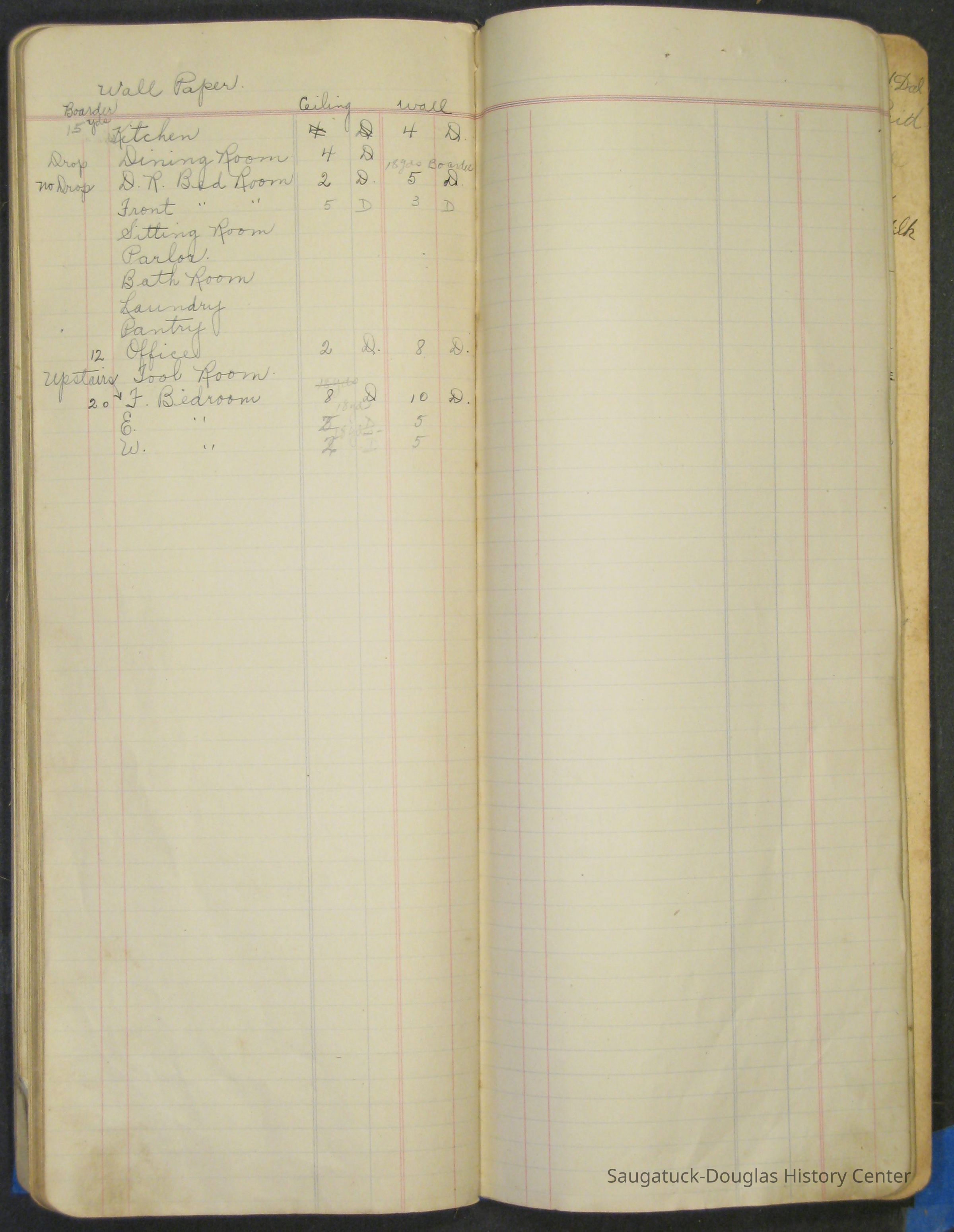 The Barr family operated a farm and a tourist home. The first page in the ledger is dated 1915 and logs the sale of butter and eggs. Other pages note the 1929 rent for the farm house or lists 1915 to 1918 weekly milk sales to Vos, Palzer, Bartlett, Houk, Crofart and other. Sales of farm products like calves, piglets, carrots, turnips are also recorded. Other notes include costs for wallpaper, farmhand wages, and breeding records.Collection