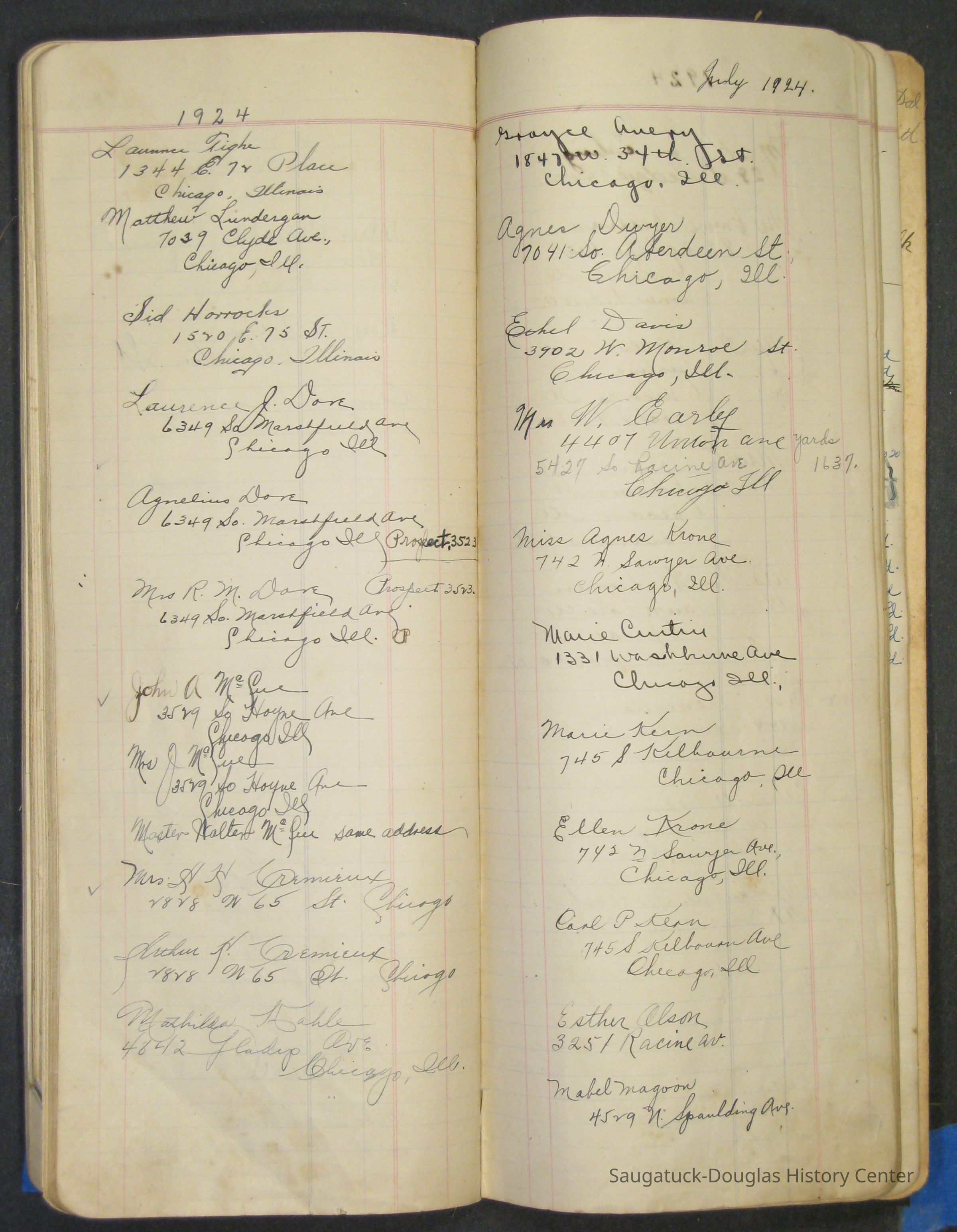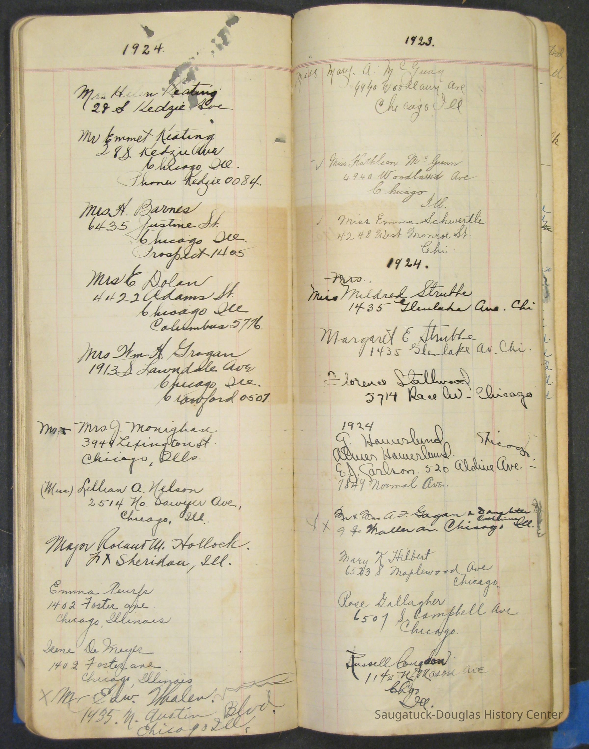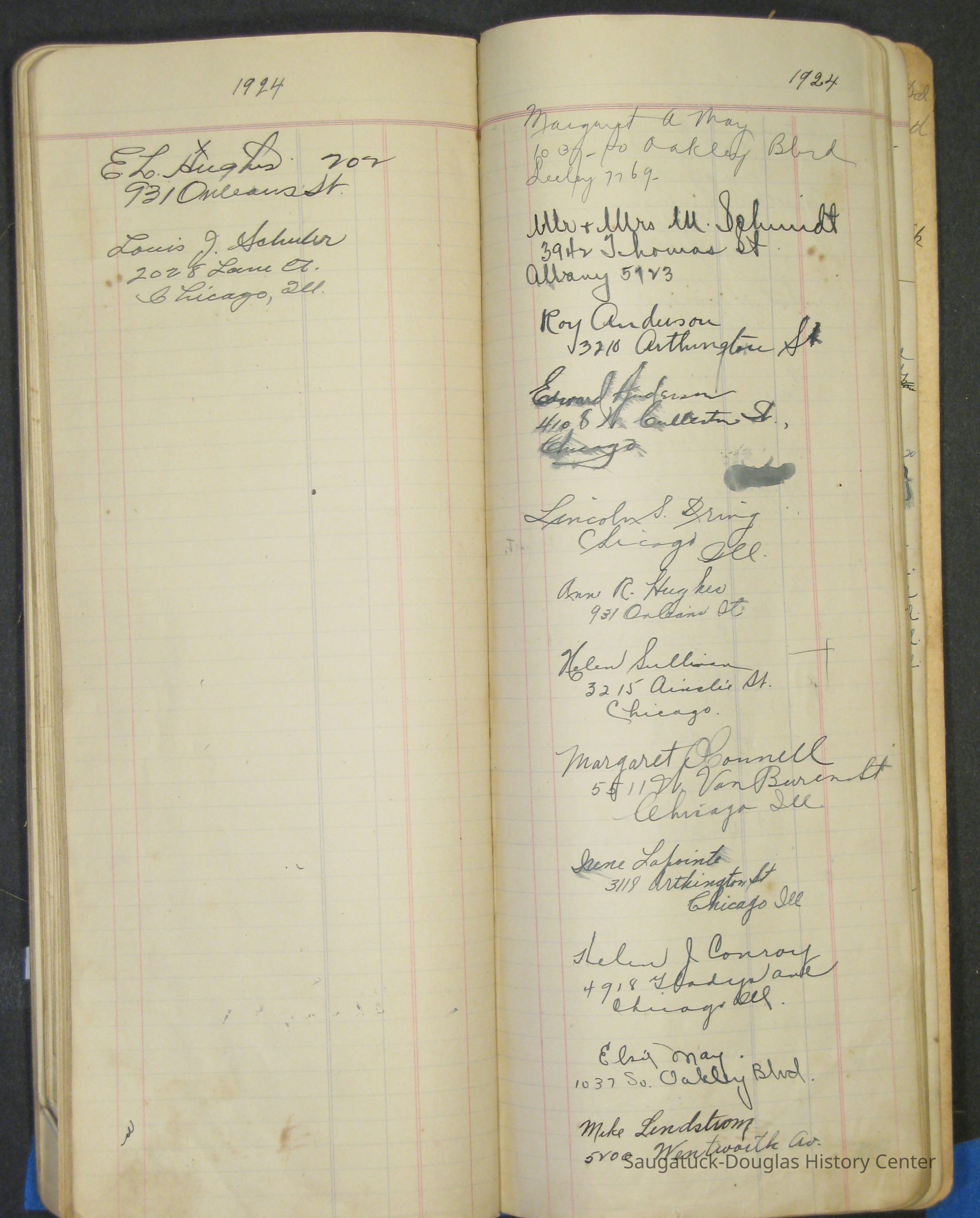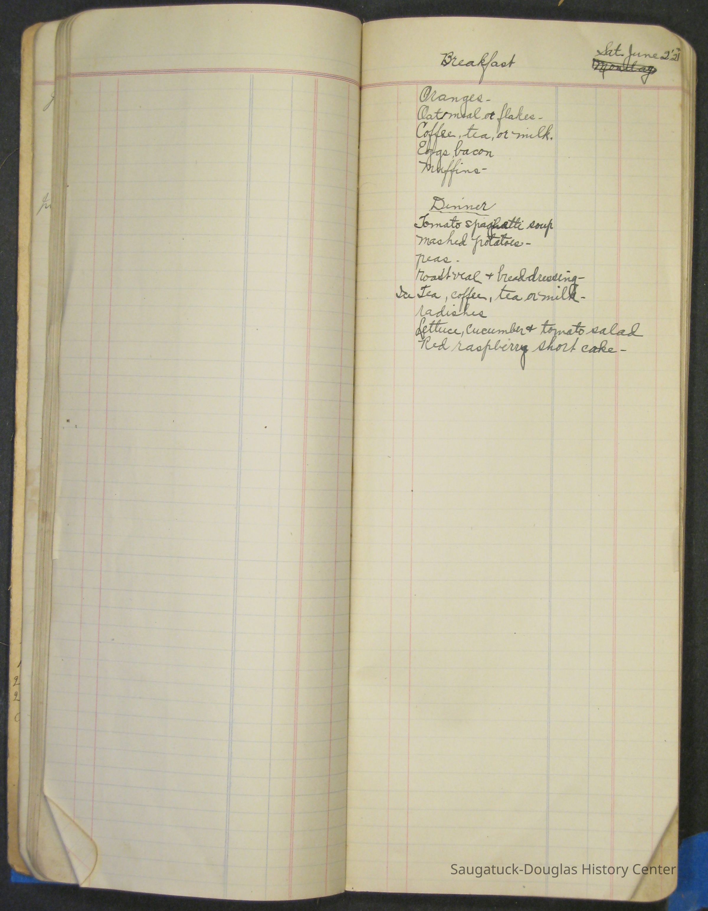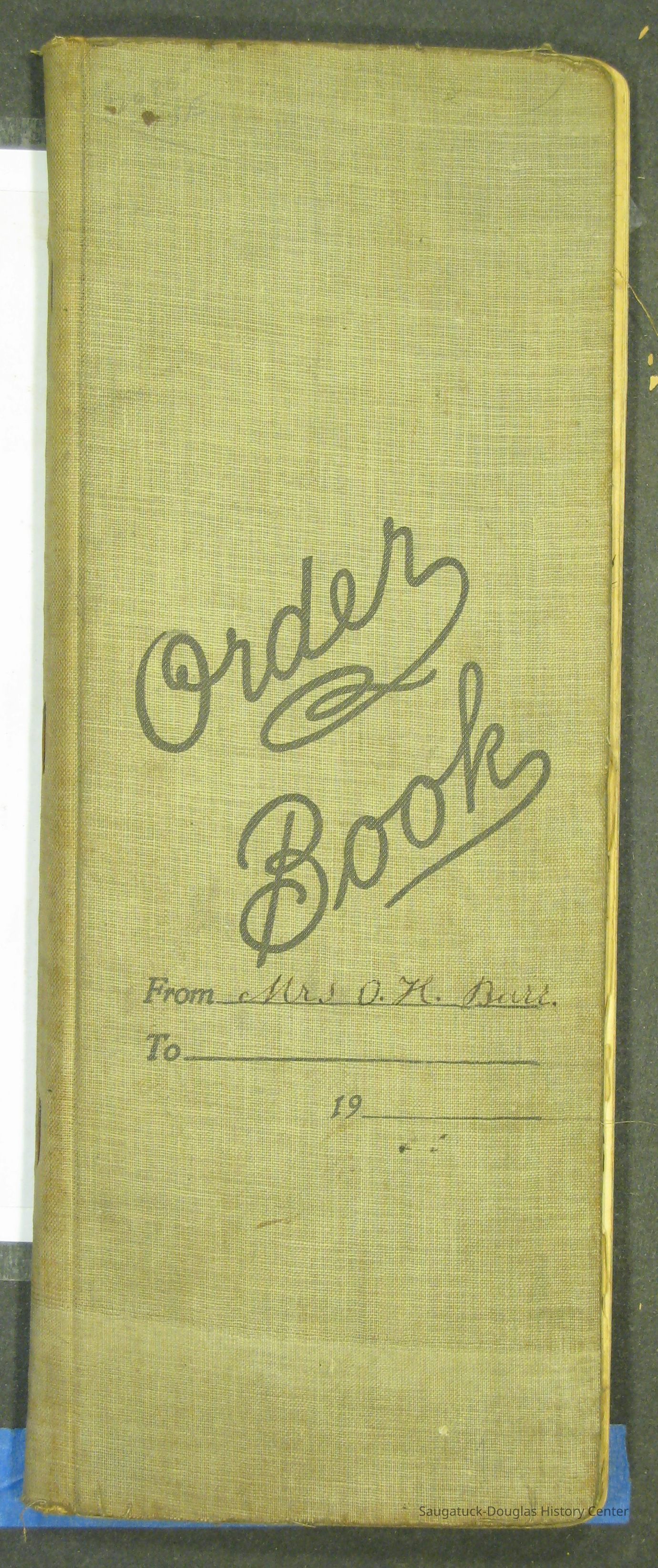 A narrow ledger with "Mrs. O.H. Barr" [Olga Helene (Schmidt) Barr (1878-1977)] hand written and "Order Book" printed on the pale green, fabric-covered cover. The book records purchases, expenses, sales of farm products, menus, guest names and addresses in the mid-1920s.Context