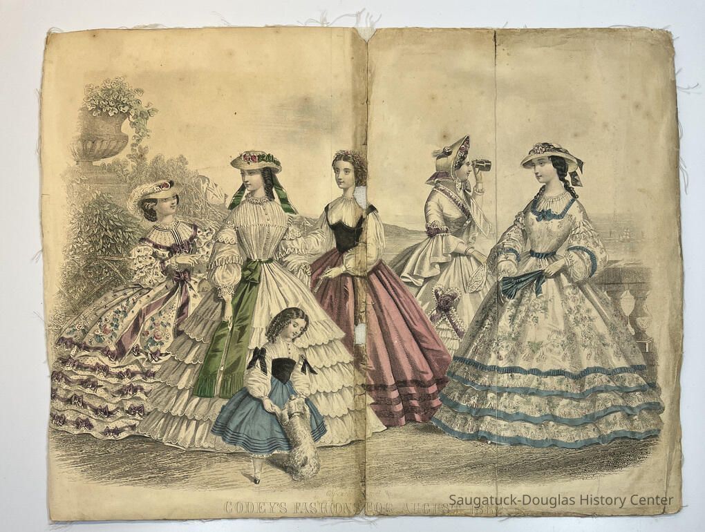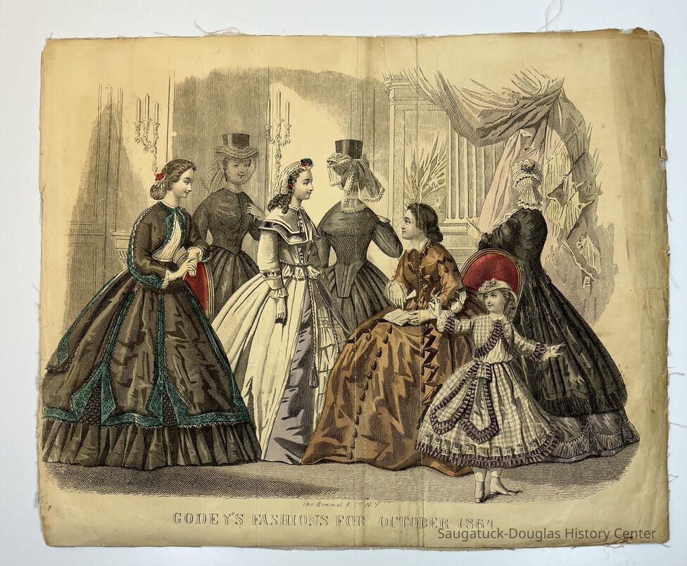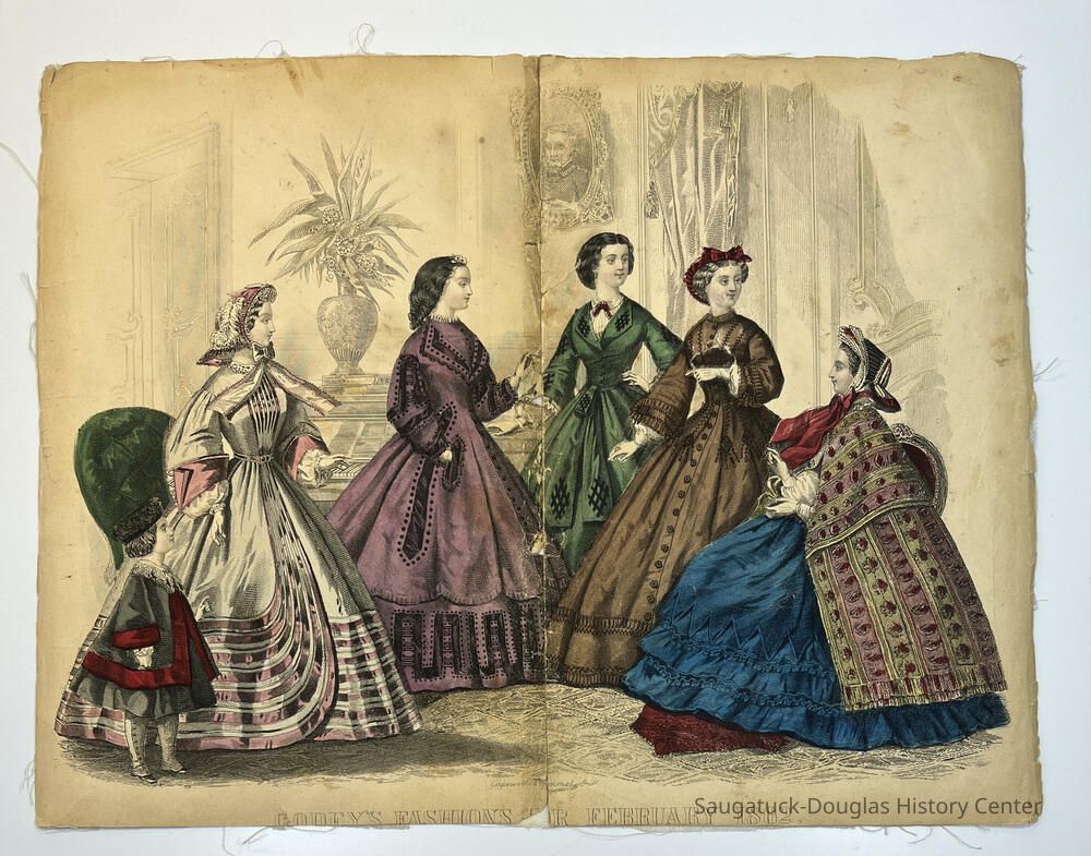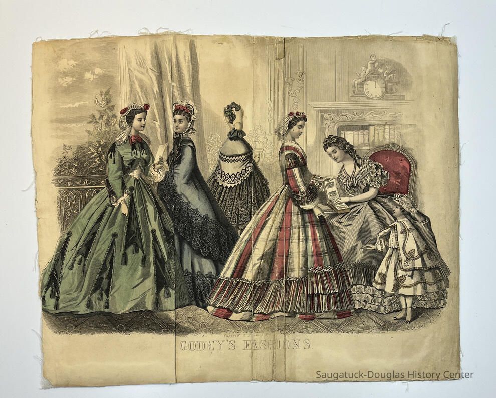 Hand colored, engraved, fashion illustrations removed from two popular women's magazines in the 1860s.