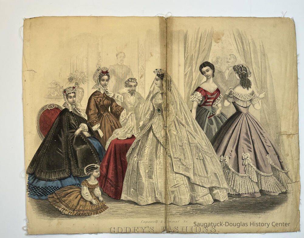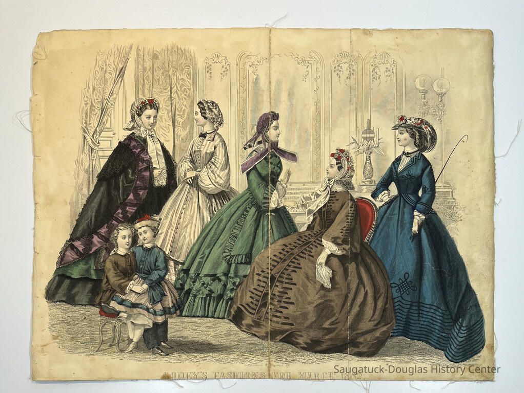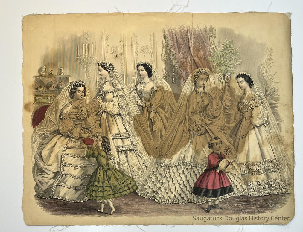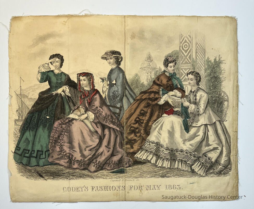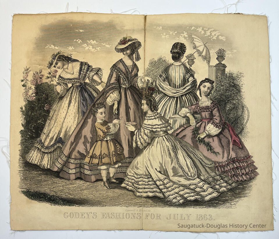 Hand colored, engraved, fashion illustrations removed from two popular women's magazines in the 1860s.