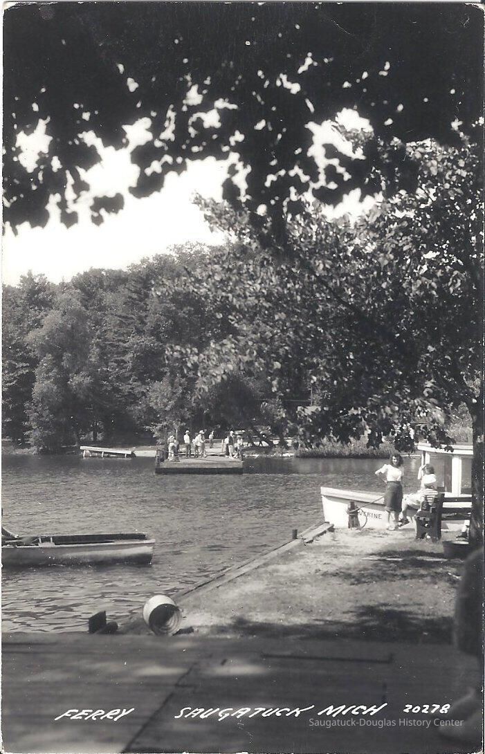 Real photo (black and white) postcard titled, "Ferry, Saugatuck, Mich." Taken from the east side of the river showing the ferry on the west side with people on board. and the ferry landing on the east Postcard #20278Collection