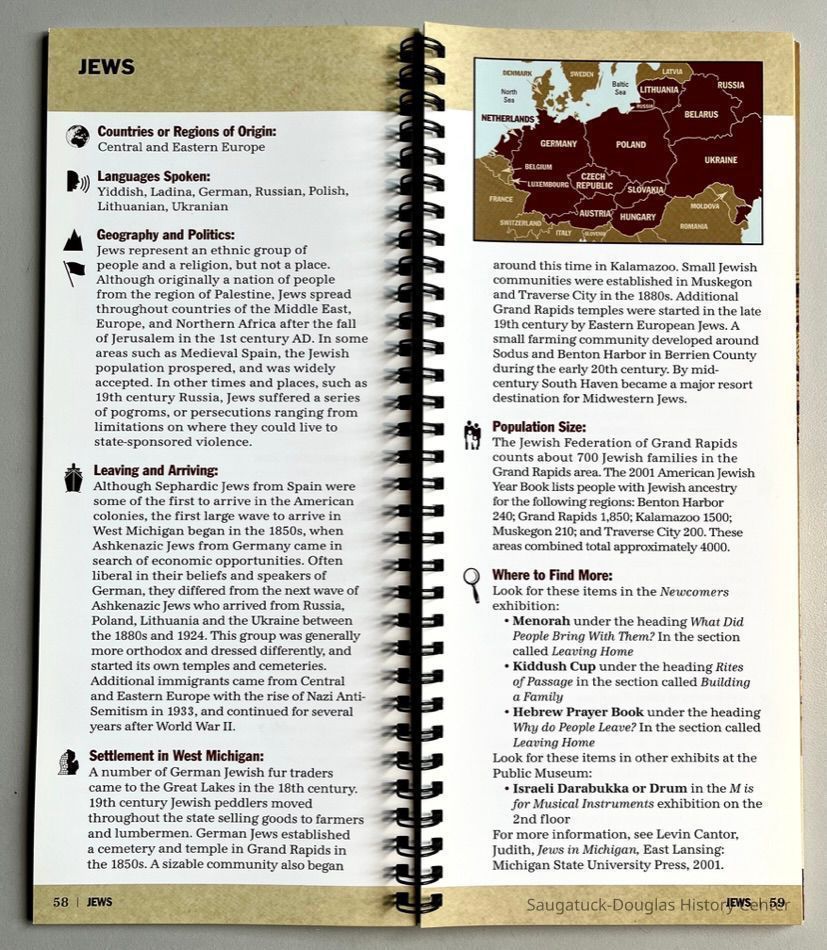 102-page, wire-bound reference book that outlines the origins, languages spoken, politics, population movement and size information about 48 ethnic groups the reside in West Michigan.Acquisition
