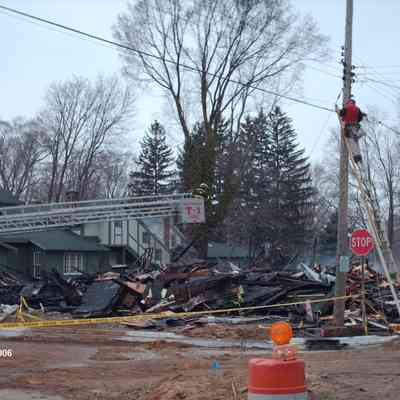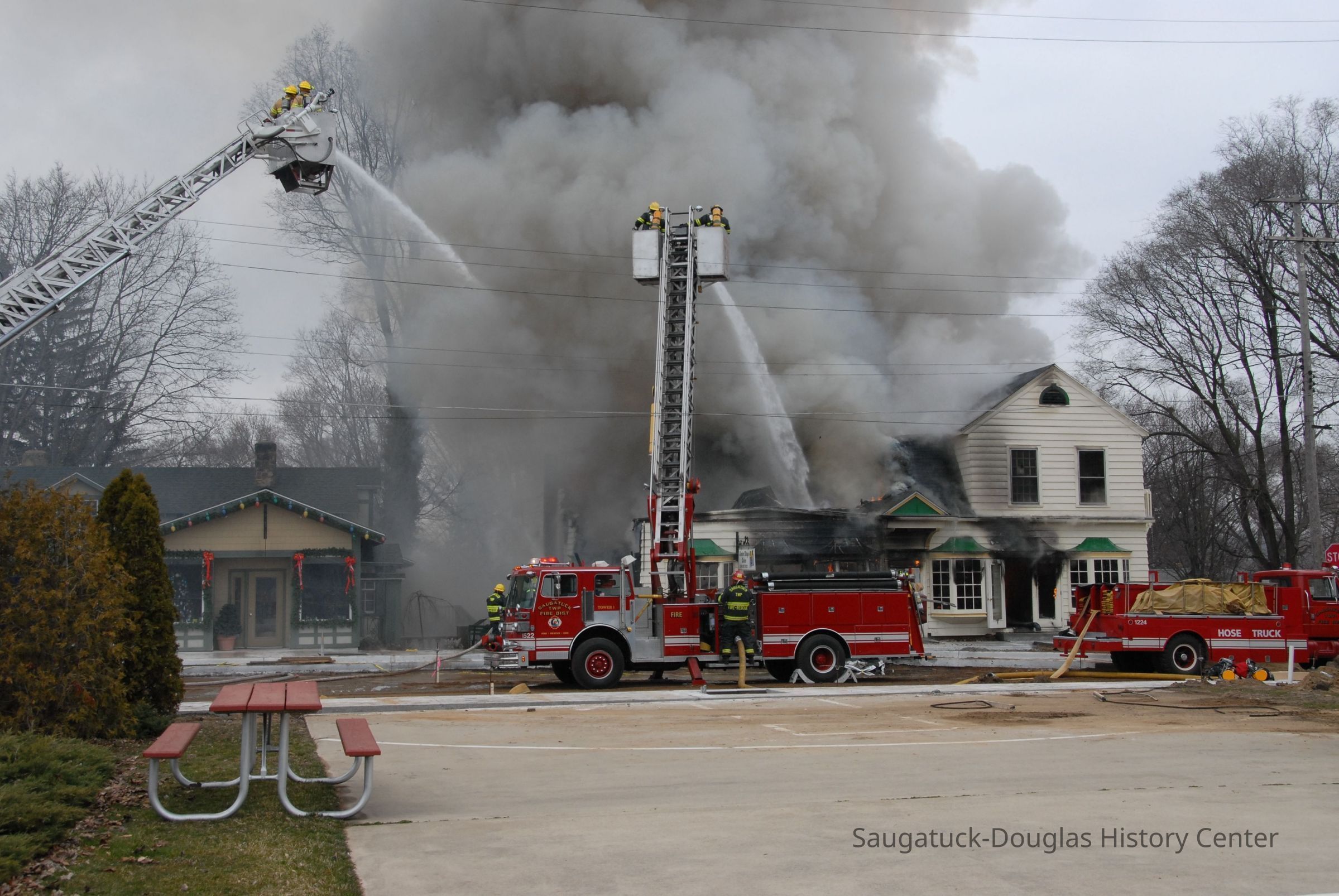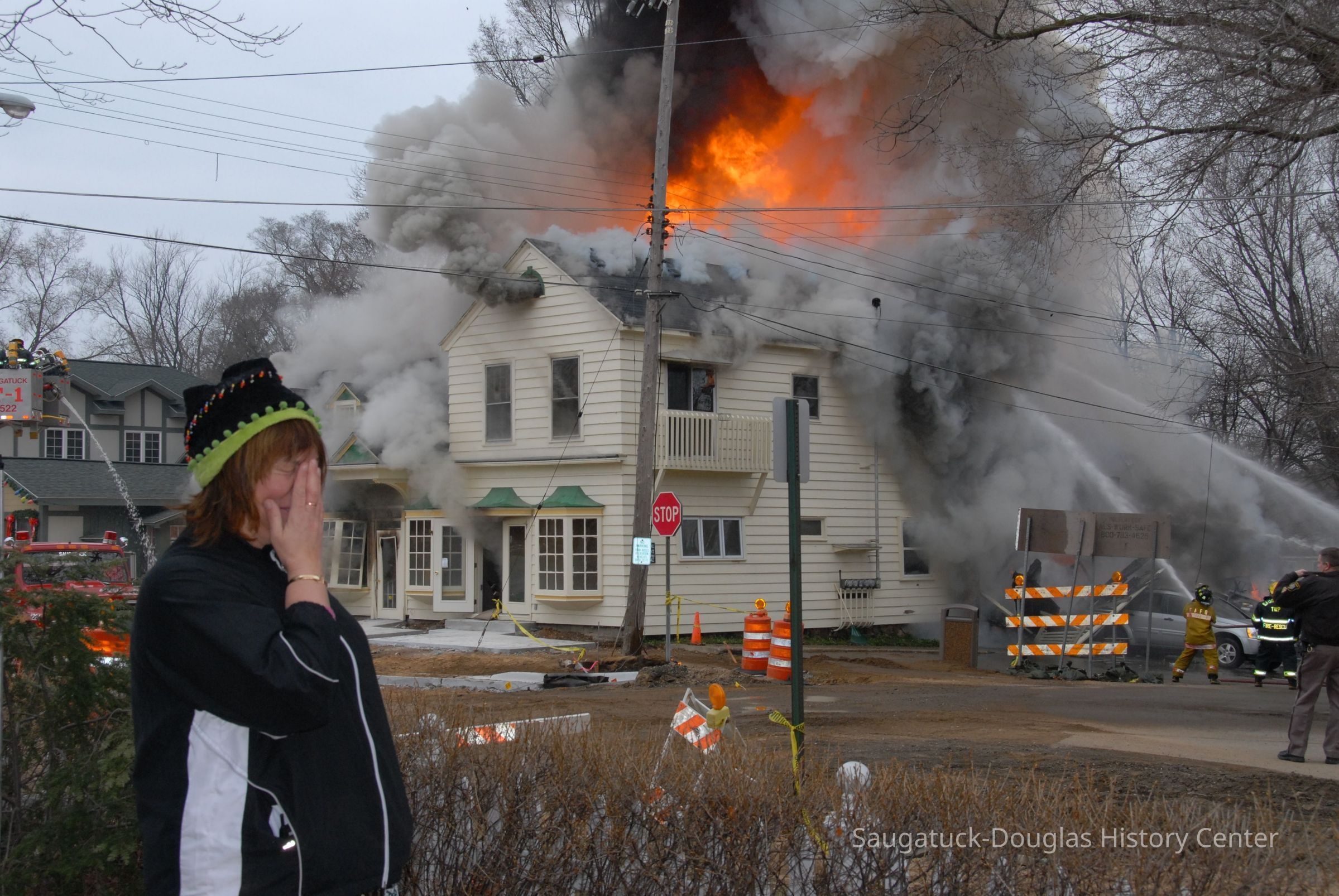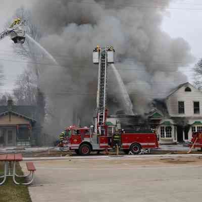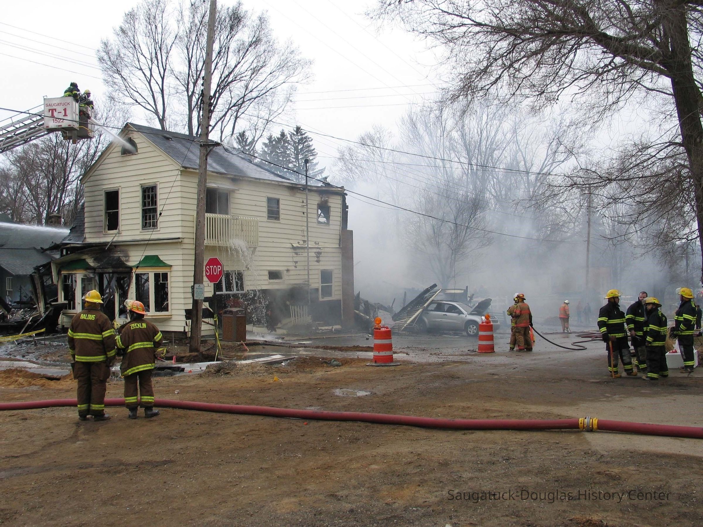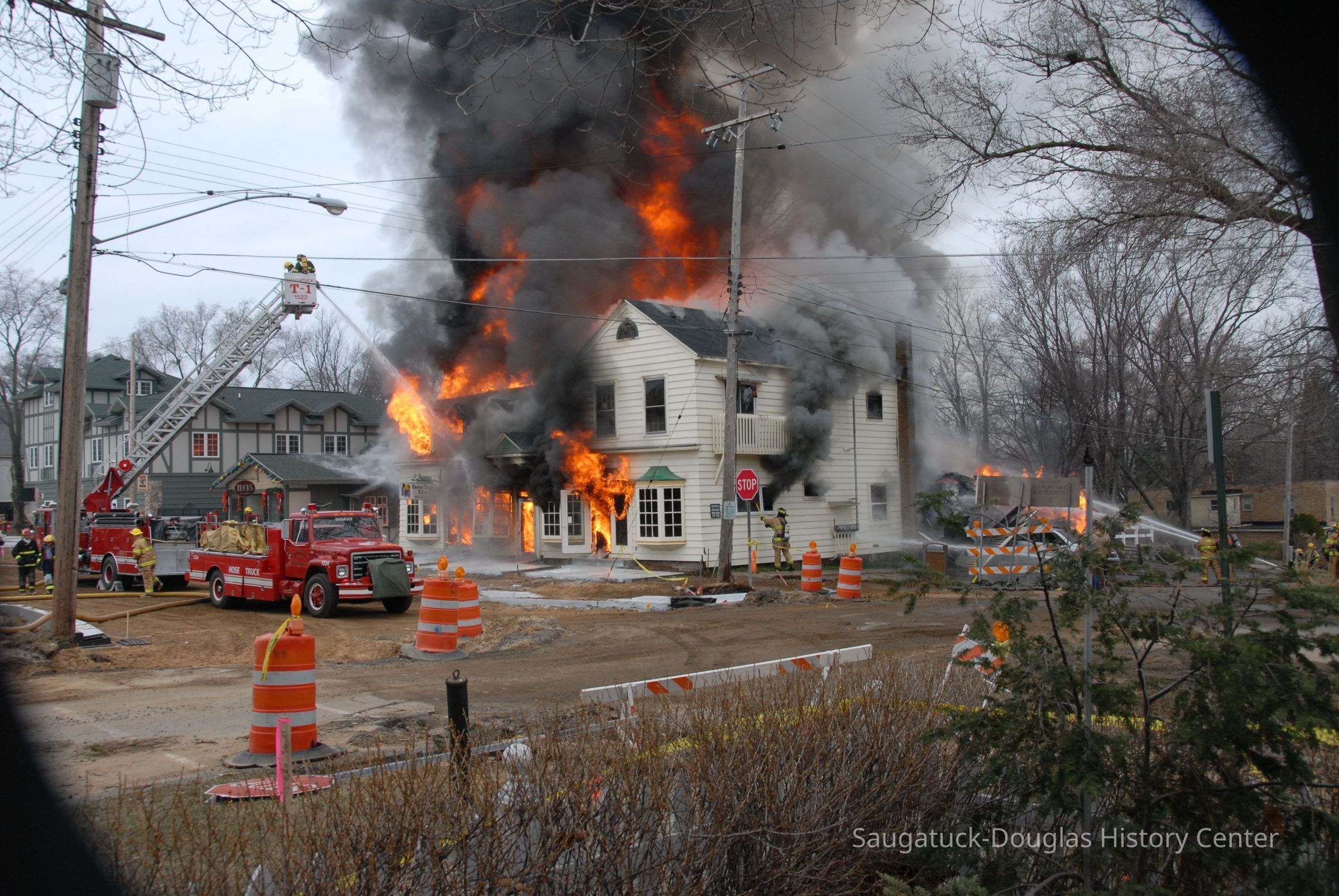 Firefighters from five area departments joined forces to extinguish the flames. The building was later demolished. As of 2025, the corner lot is the garden for restaurant Borrowed Time.Collection