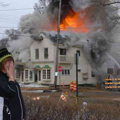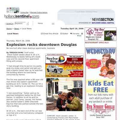 Digital photos believed to taken by Dr. Marty Raebel and two PDFs of Holland Sentinel newspaper reports of the 2006 fire that destroyed the Van Syckel building at 32 East Center Street, the northwest corner of Center and Washington Street.Context