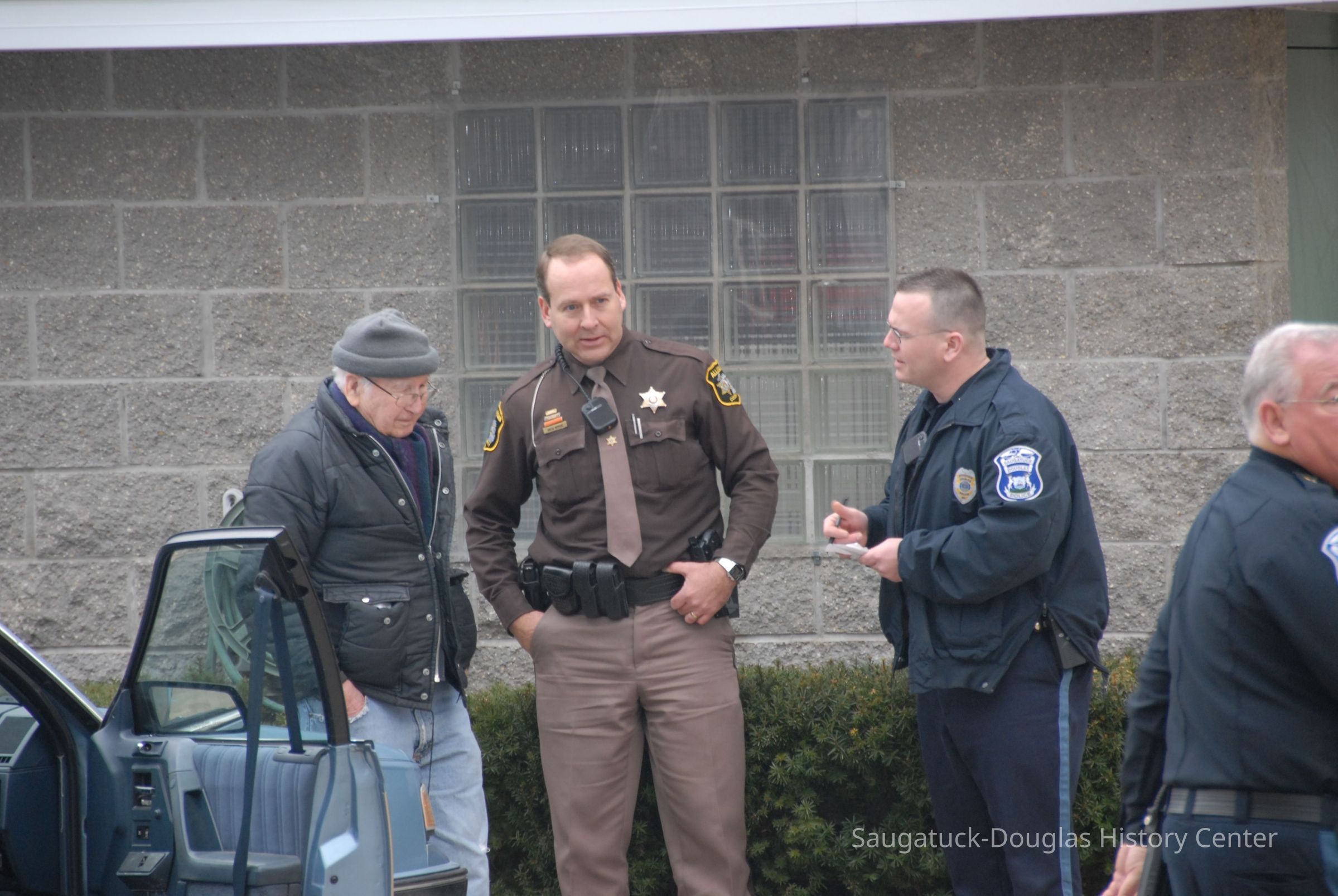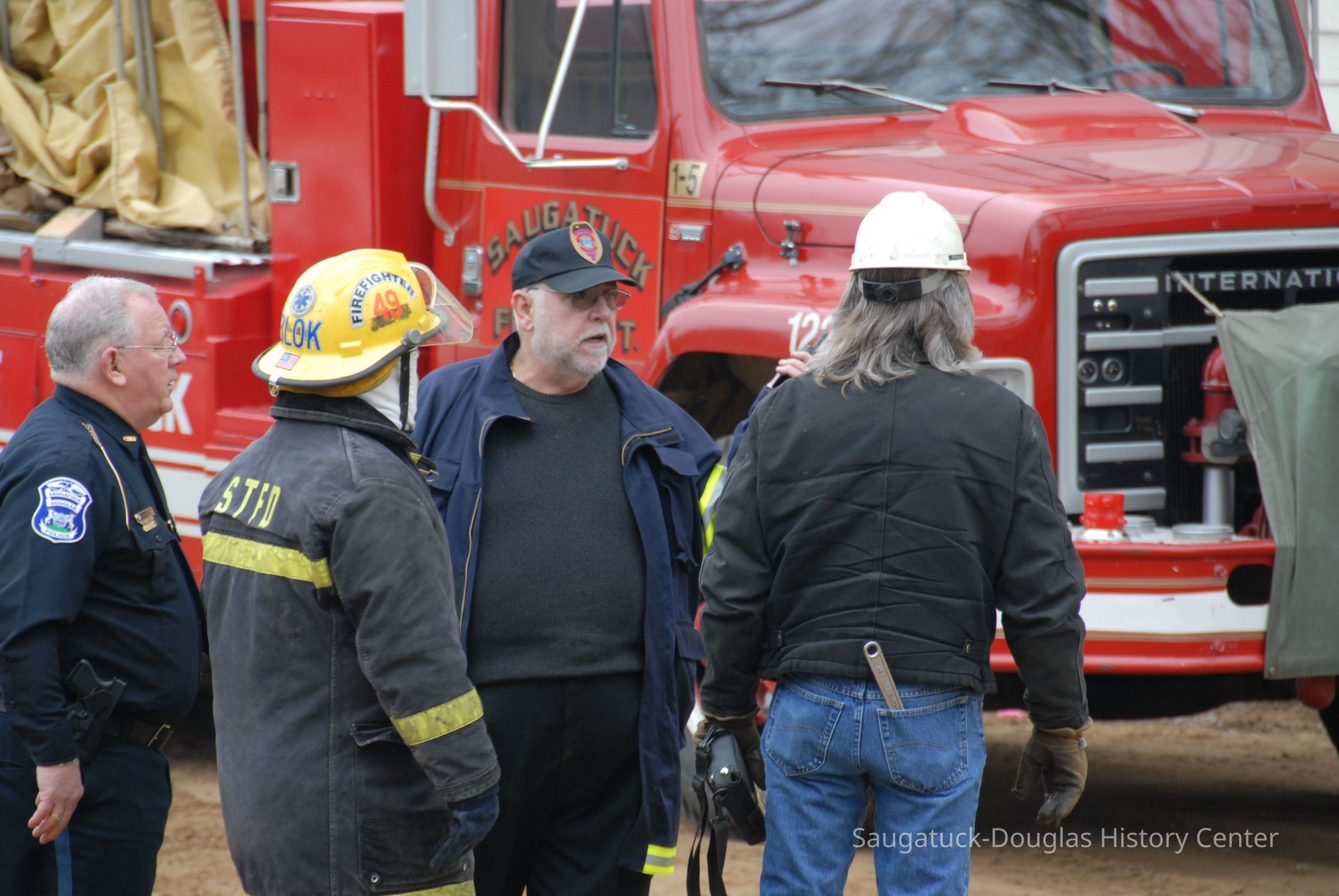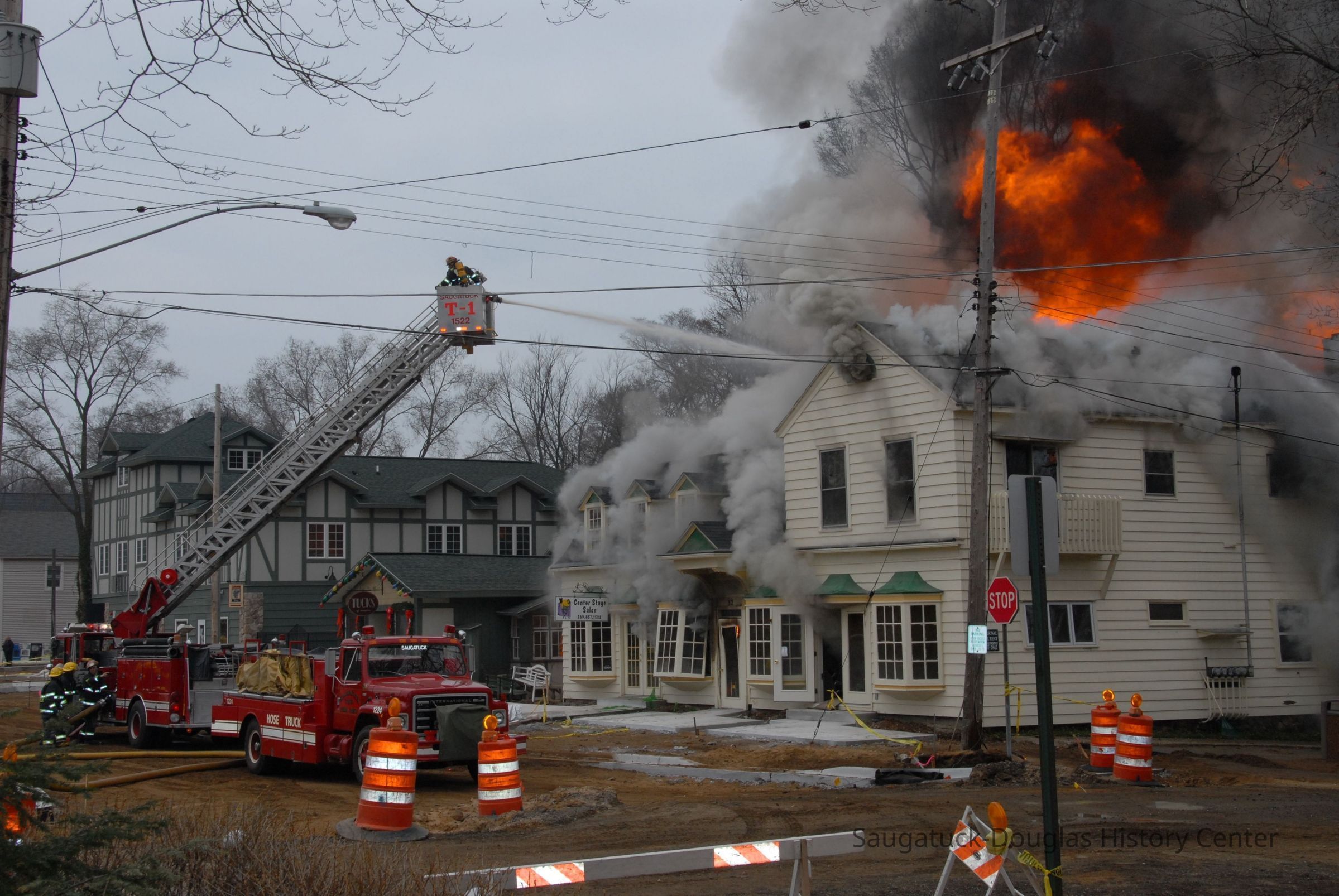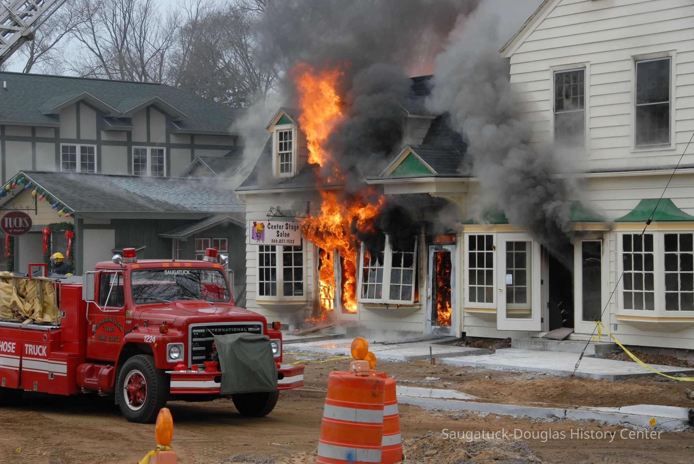 building and ruptured a gas line. An explosion and fire followed. At the time of the fire the ground level housed Scott Kirkby's Center Stage Salon, the upper units were apartments rented by Steve Salzer, Jack Carey, Barb Leonard and Aaron Sheridan. Aaron is the son of property owners Allegan District Judge Stephen Sheridan and his wife Tanya Sheridan.