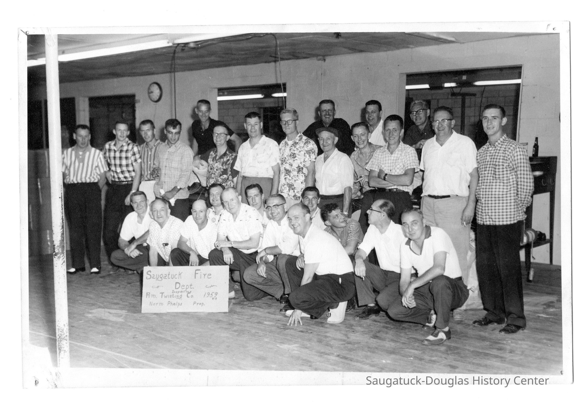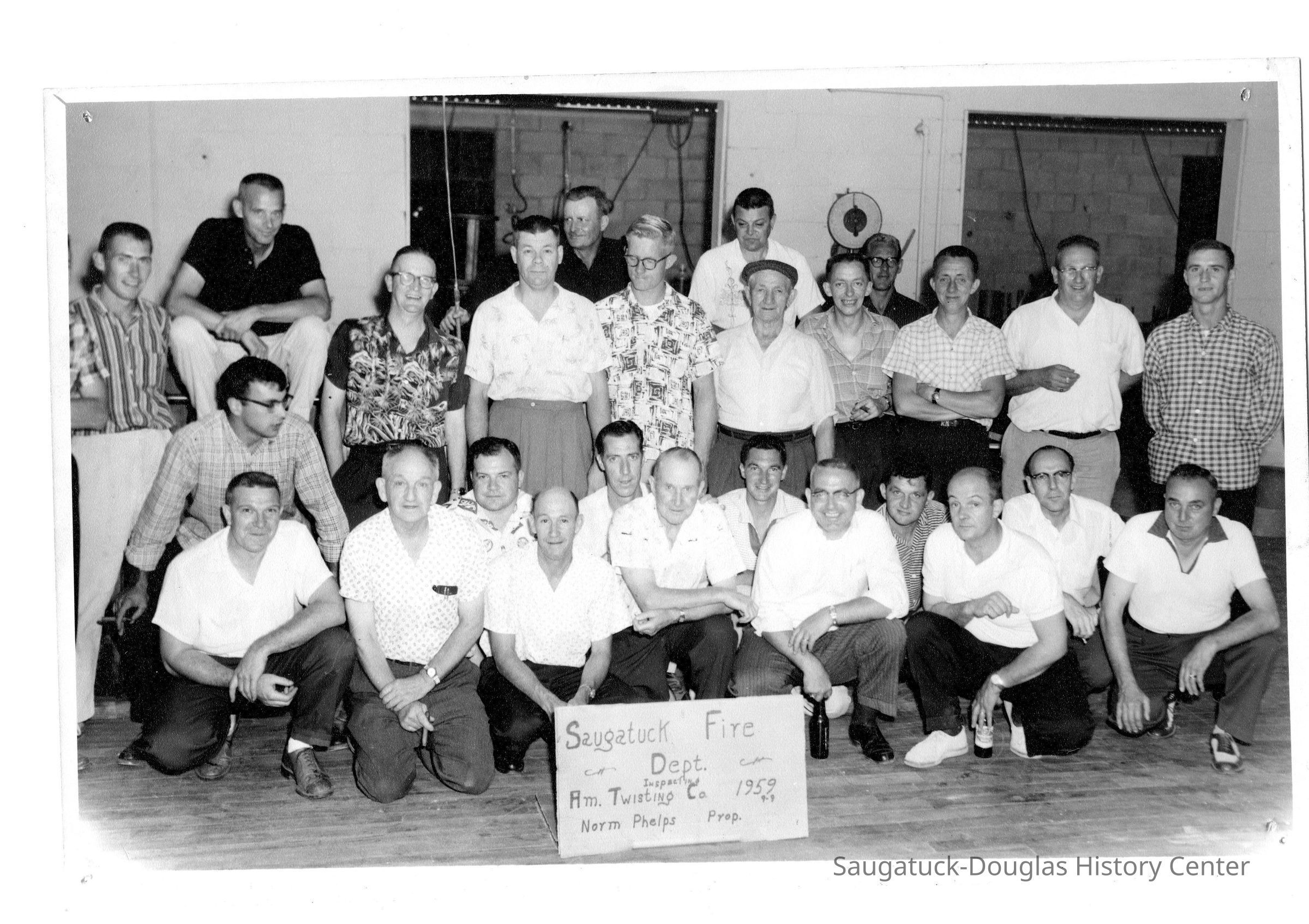 Group photo of smiling men with sign that reads "Saugatuck Fire Dept. Inspection Am. Twisting Co. 1959, 9-9 Norm Phelps Prop."Photograph Details