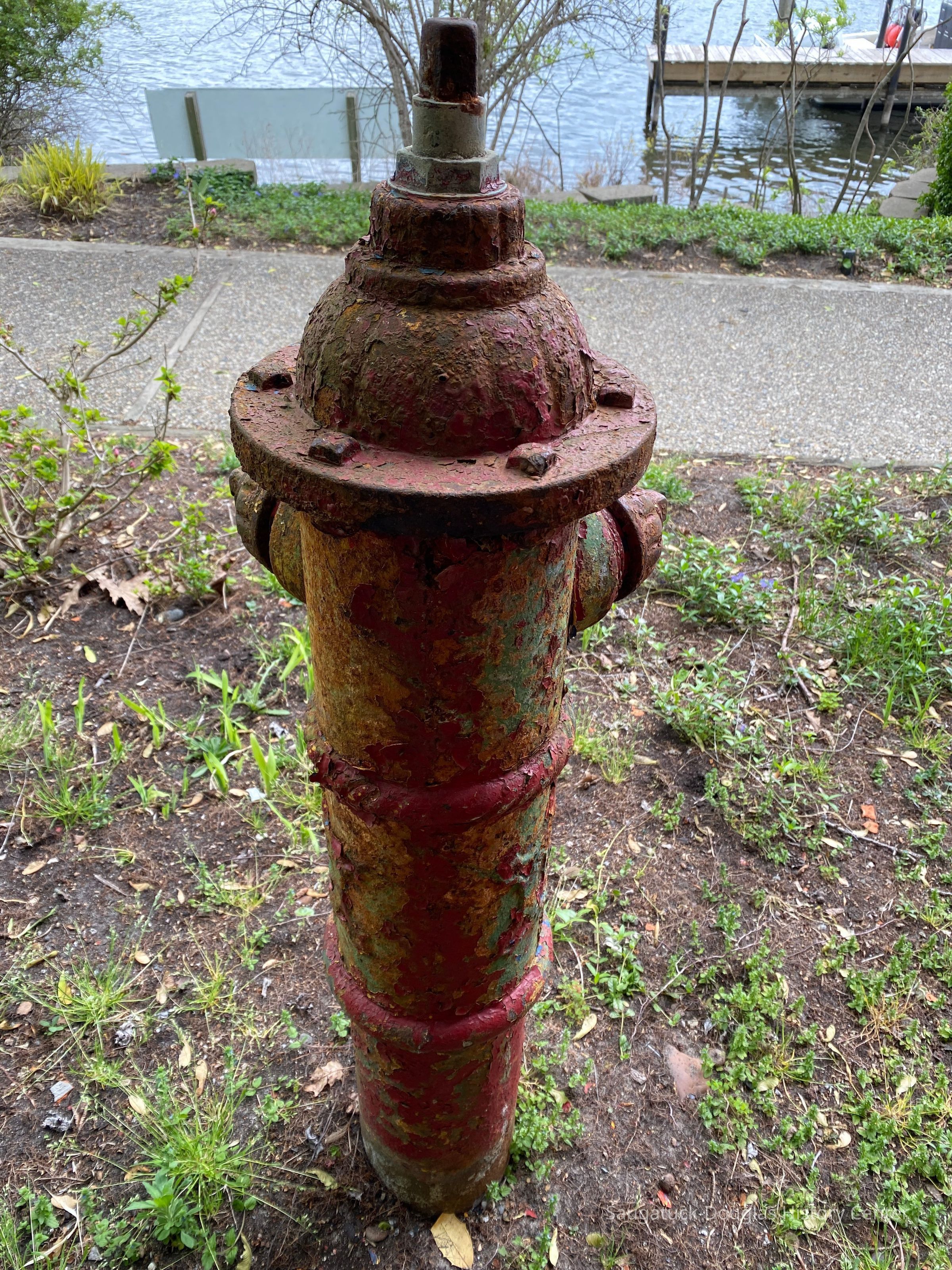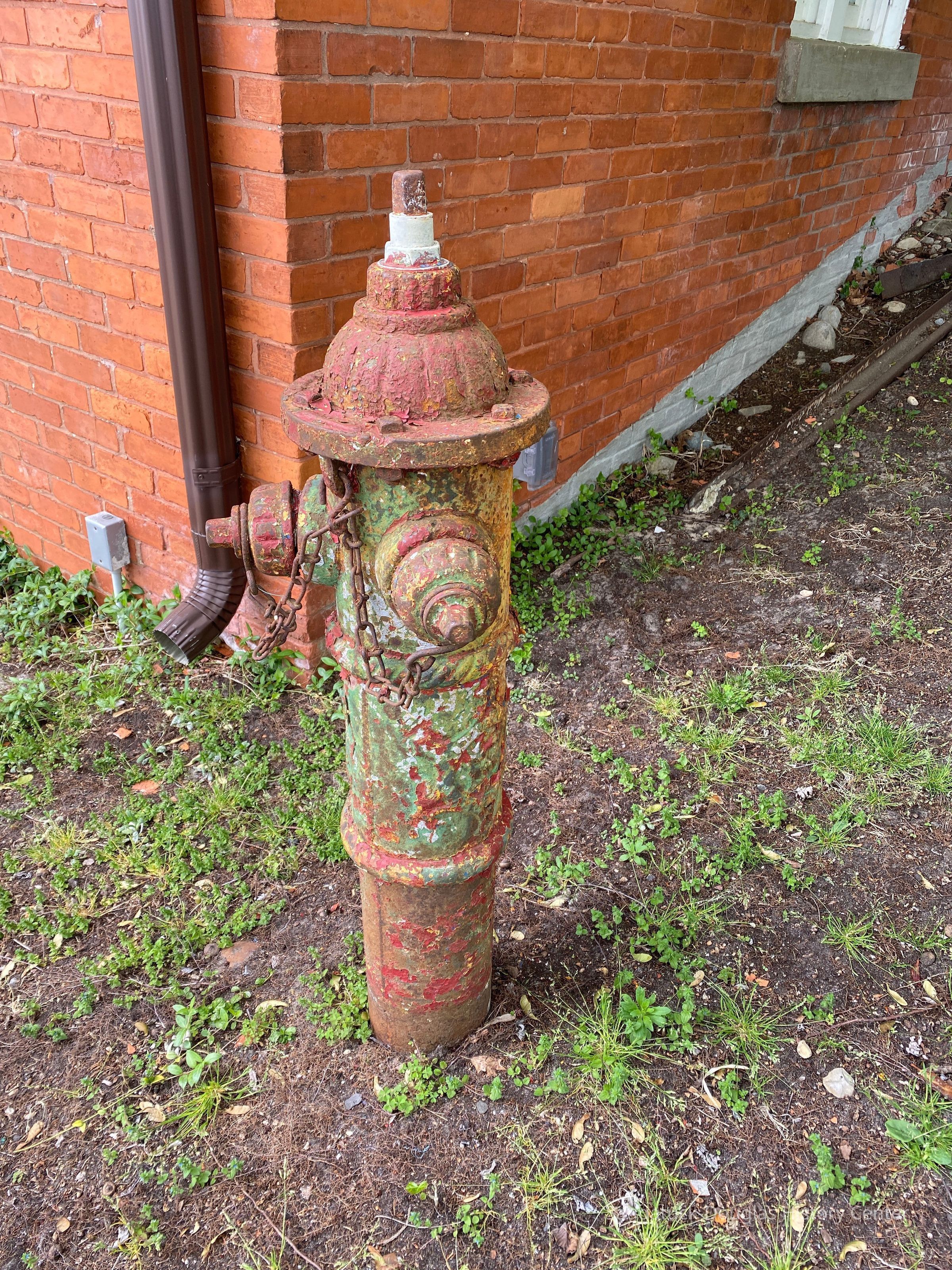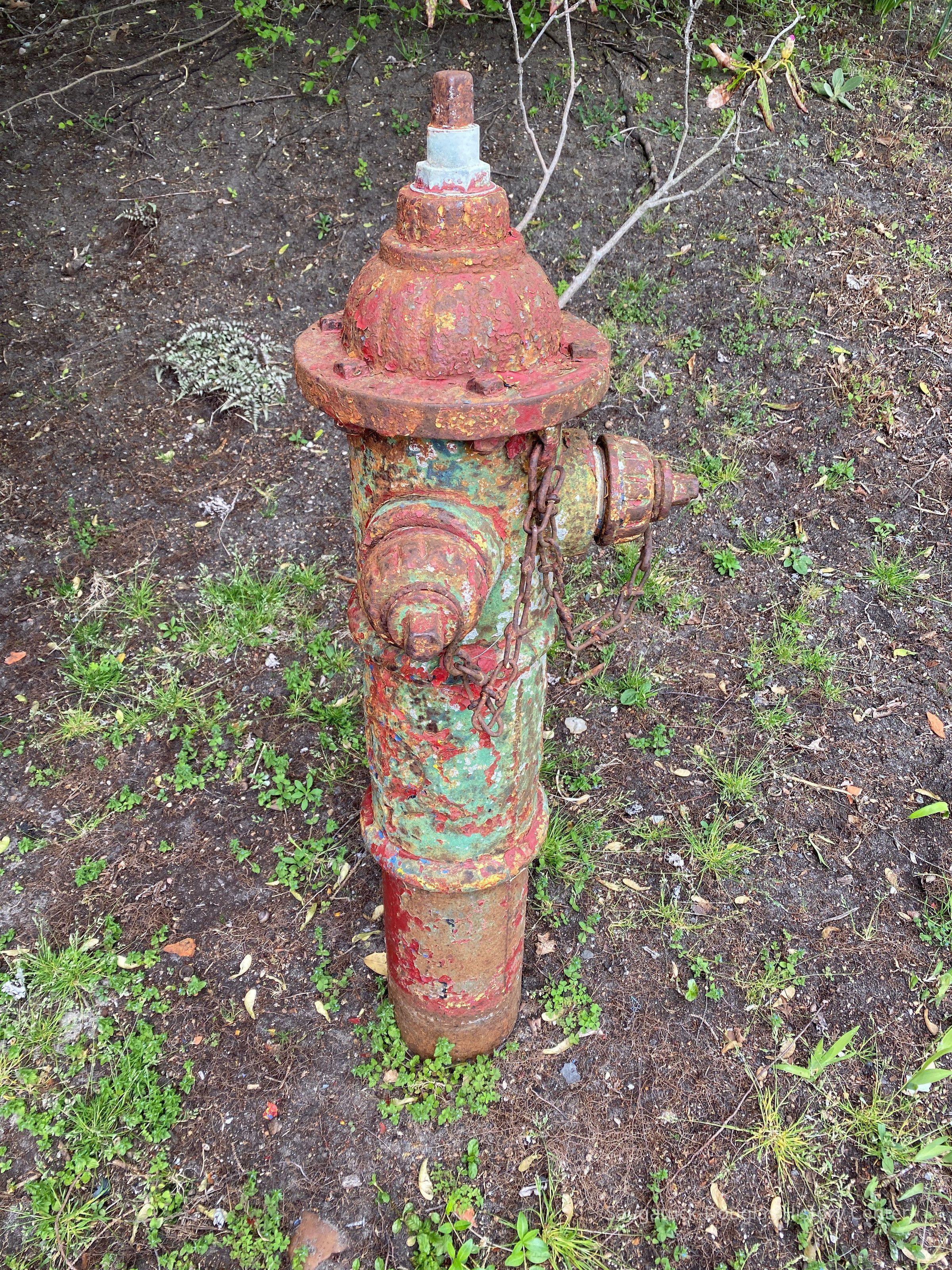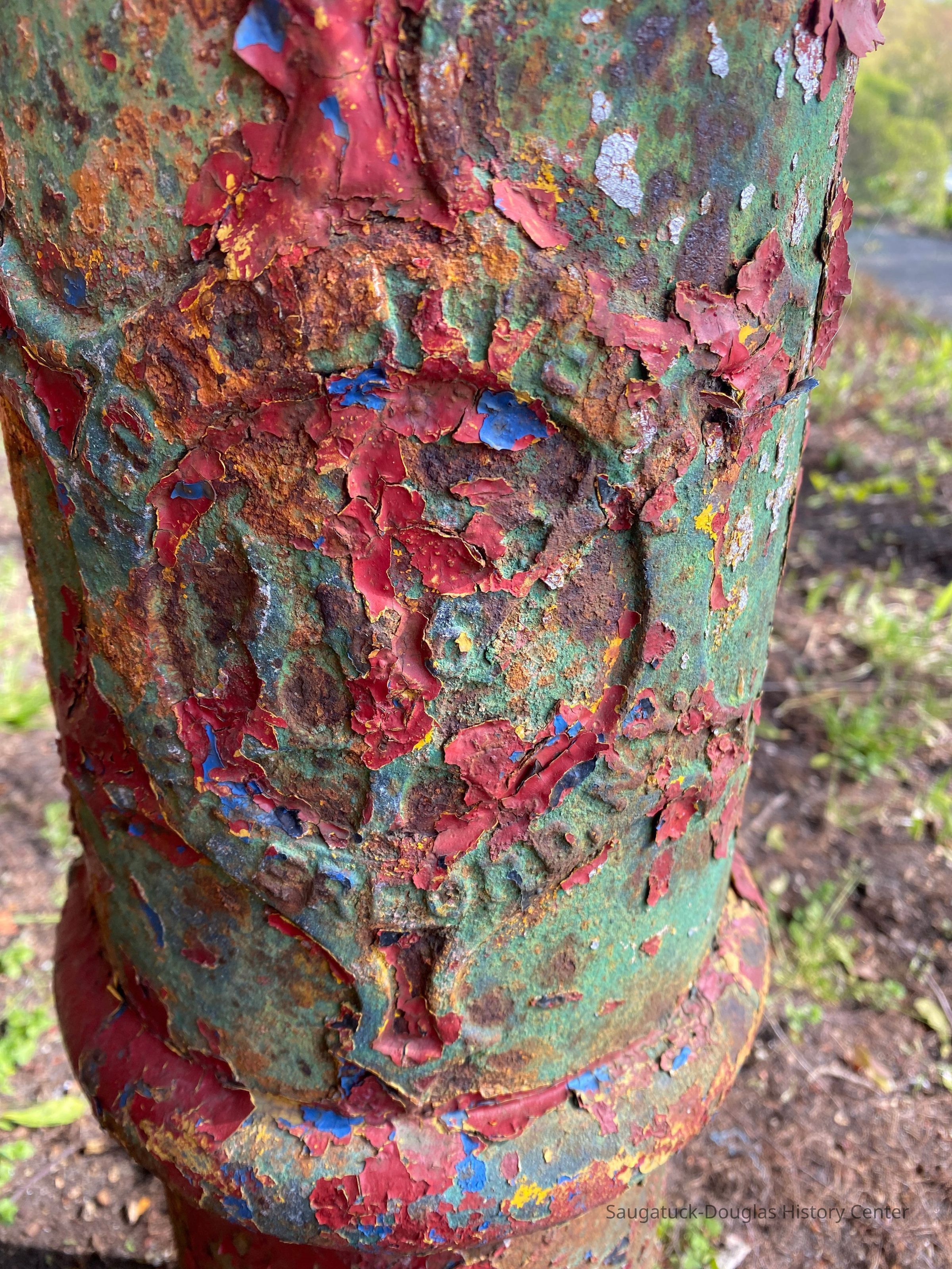 The hydrant had been painted many colors over its years of service including yellow, green and, most recently, red. The peeling and wear patterns in the paint, with the never-sleeping addition of rust, give the hydrant a mottled color.Context