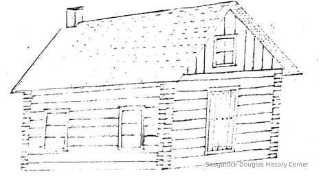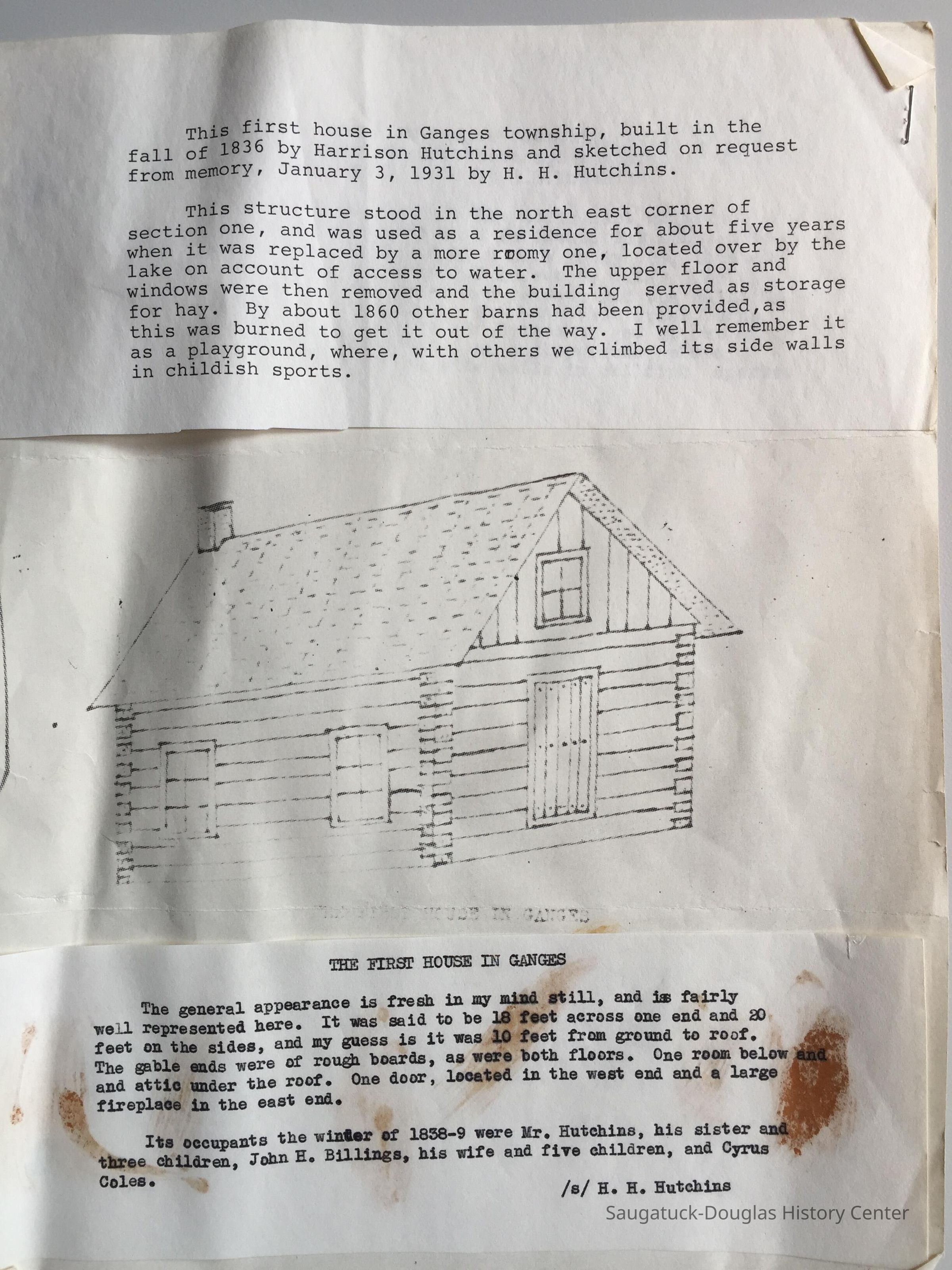 This first house in Ganges township, built in the fall of 1836 by Harrison Hutchins and sketched on request from memory, January 3, 1931 by H. H. Hutchins.