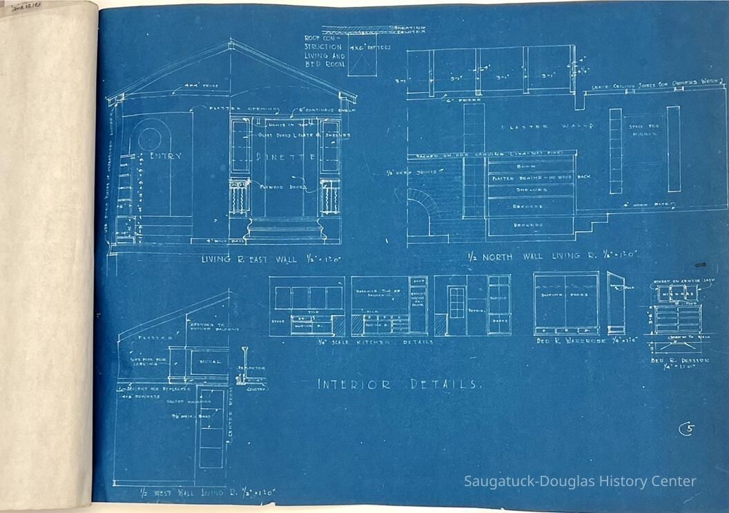 This booklet of blueprints consists of five pages of drawings for the studio/residence being built in South Laguna. It includes detailed drawings of the exterior of the house as well as details and materials. A page also consists of interior details.Collection