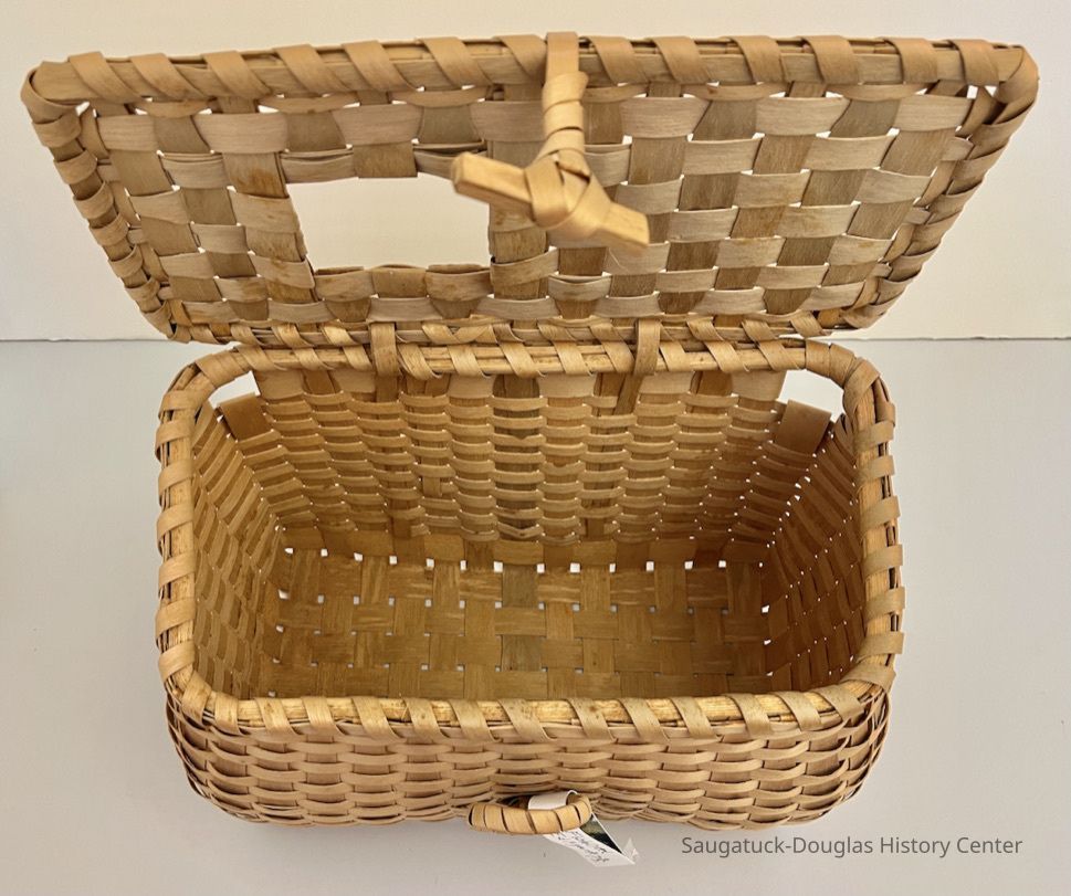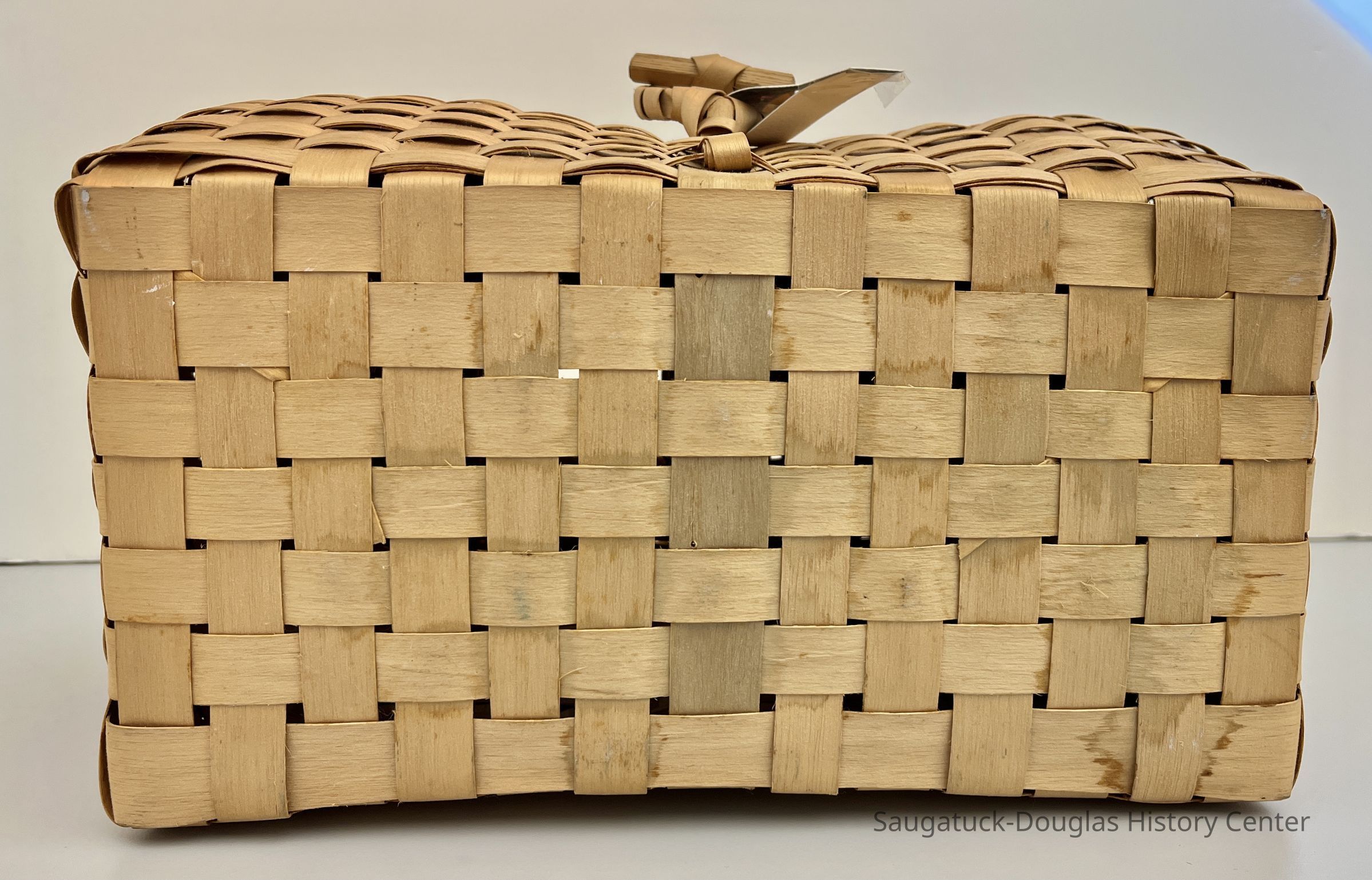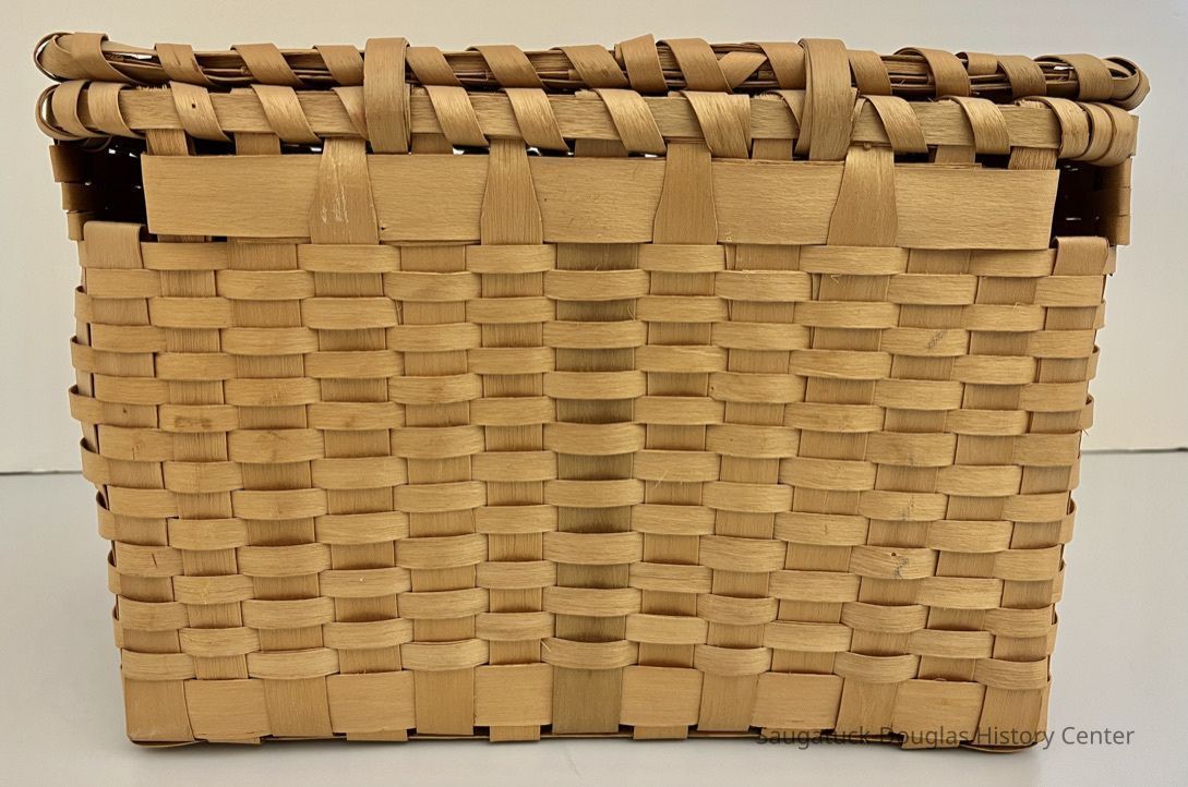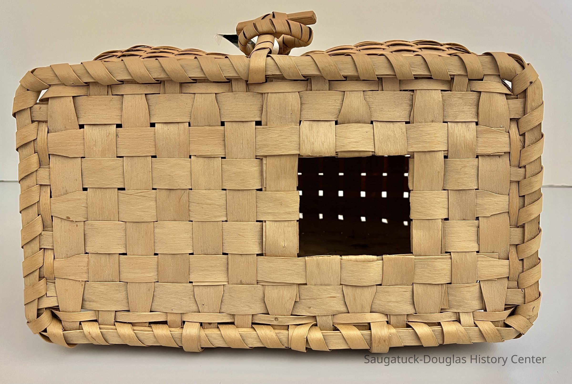 The basket has a rectangular base formed by a simple weave of approximately one-inch wide strips that are bent to form the vertical members of the baskets. The horizontal strips on the sides of the basket are half as wide as the verticals. The back of the basket is flat with two gaps for threading through a strap or belt. The sides of the basket curve outward before returning to the rectangular, reinforced top rim of the basket. The front of the basket also curves outward except at the center location of the locking loop. The flat, rectangular lid of the basket has a T-shaped toggle to hold the basket shut and a square 3x3 opening. Note the careful craftsmanship of the single row of narrow wood just inside of the lid's reinforced edge and the tapering of the lid's wide strips as they meet the edge.Collection