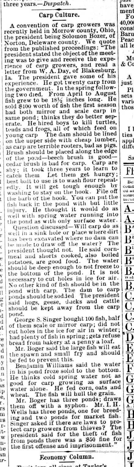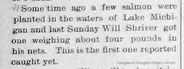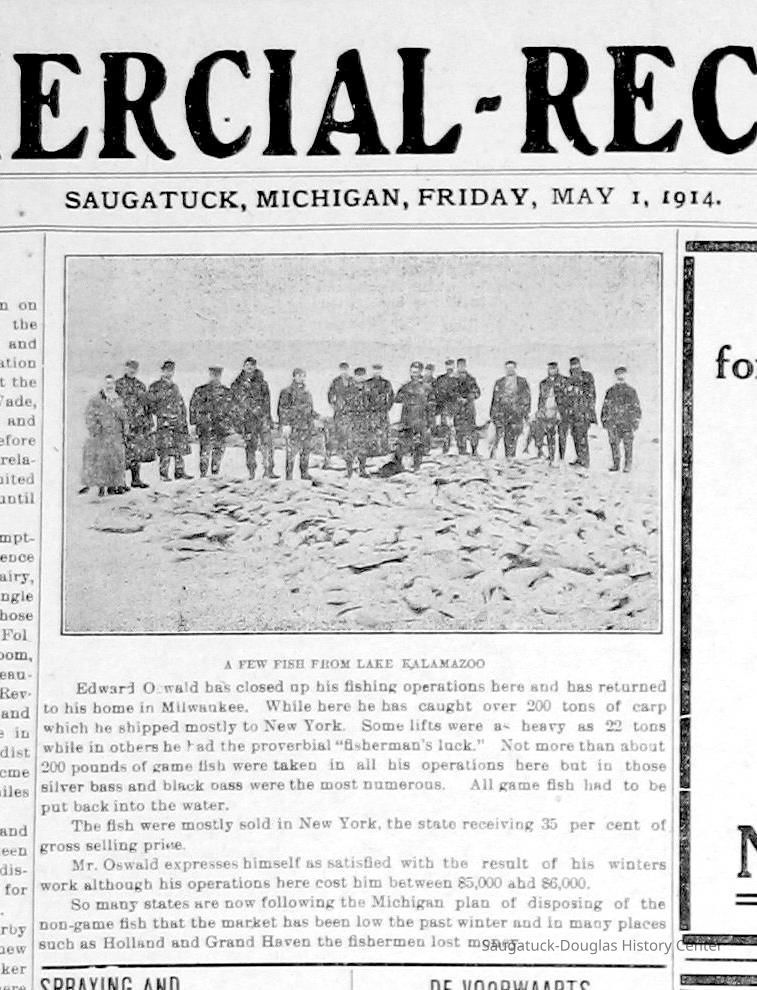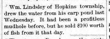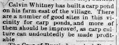 By 1886, "carp culture" was a going concern. The front page of the October 1 Commercial of that year featured a report from a carp growers convention held in Morrow County, Ohio. Prominent Saugatuck locals got into the swing of things. By December of that same year, local businessman and farmer Calvin Whitney had constructed a carp pond on his farm east of the village. In 1891 William Lindsey of Hopkins Township drained his carp pond and sold $100 worth of fish from what had previously been a "profitless mudhole"