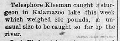 Robert Woodhull pulled a strange fish from the Kalamazoo River at Saugatuck in February of 1882. The next week, this event was reported in the Lake Shore Commercial (today's Commercial Record). It was written that the unusual creature was "thought to be a carp", a species introduced to the upper waters of the Kalamazoo in 1880 and 1881 by the Michigan State Fish Association.