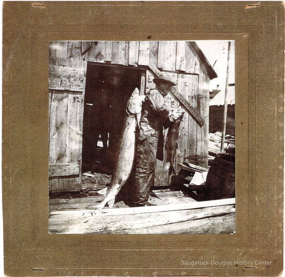 Photo of a fishermen with a lake trout in his hands and a large sturgeon alon his back. The location is a rough-hewn wooden shanty, possibly Fishtown.Photograph Details